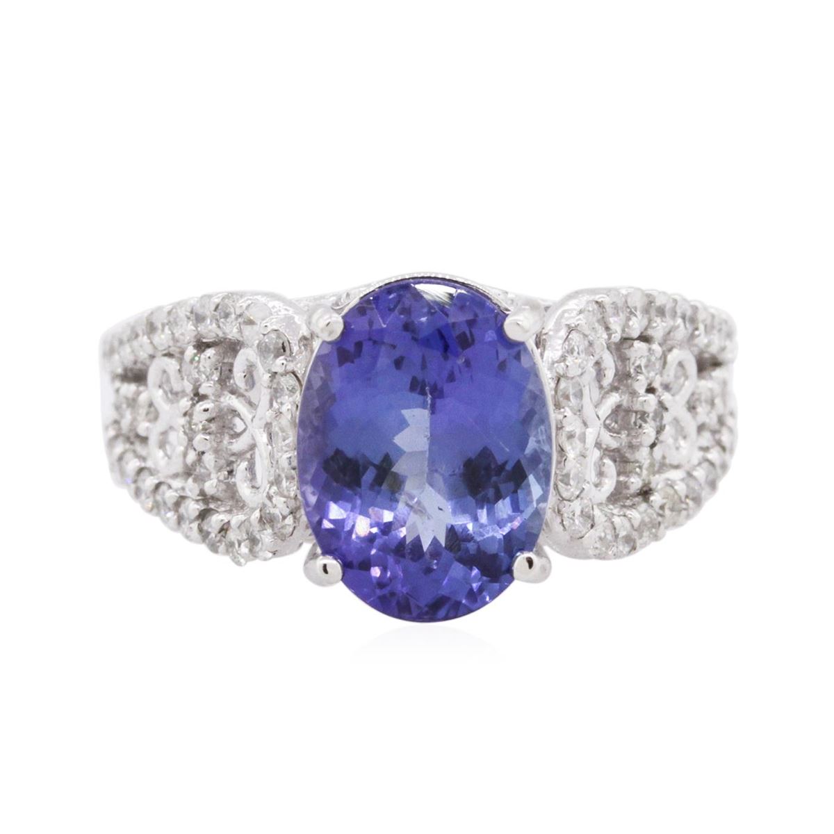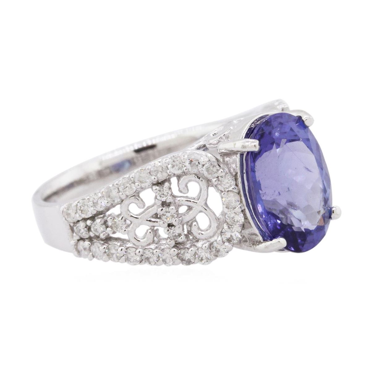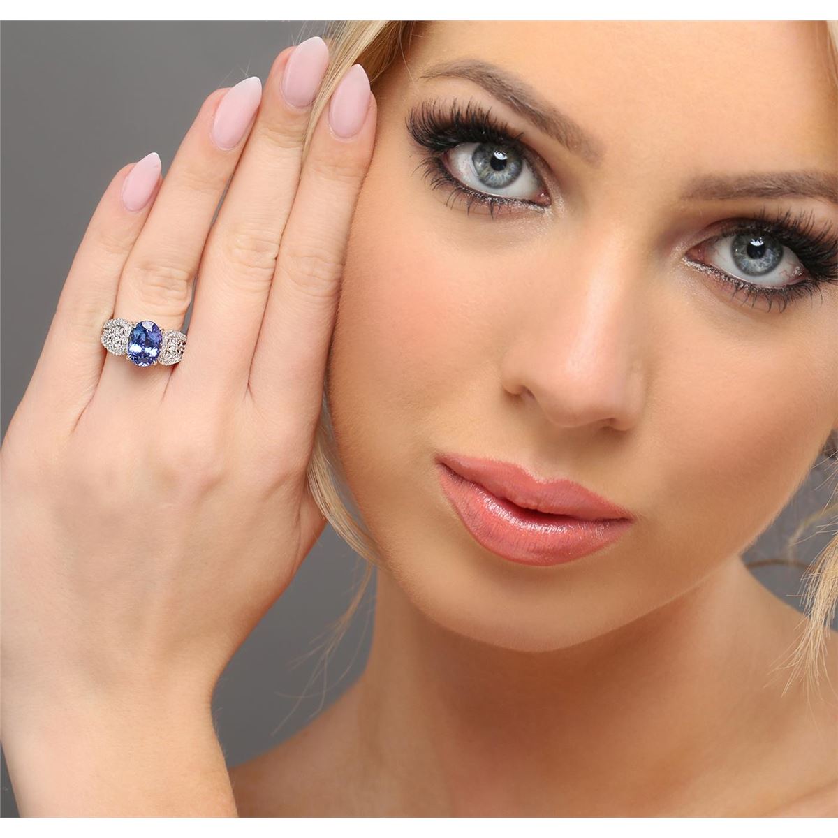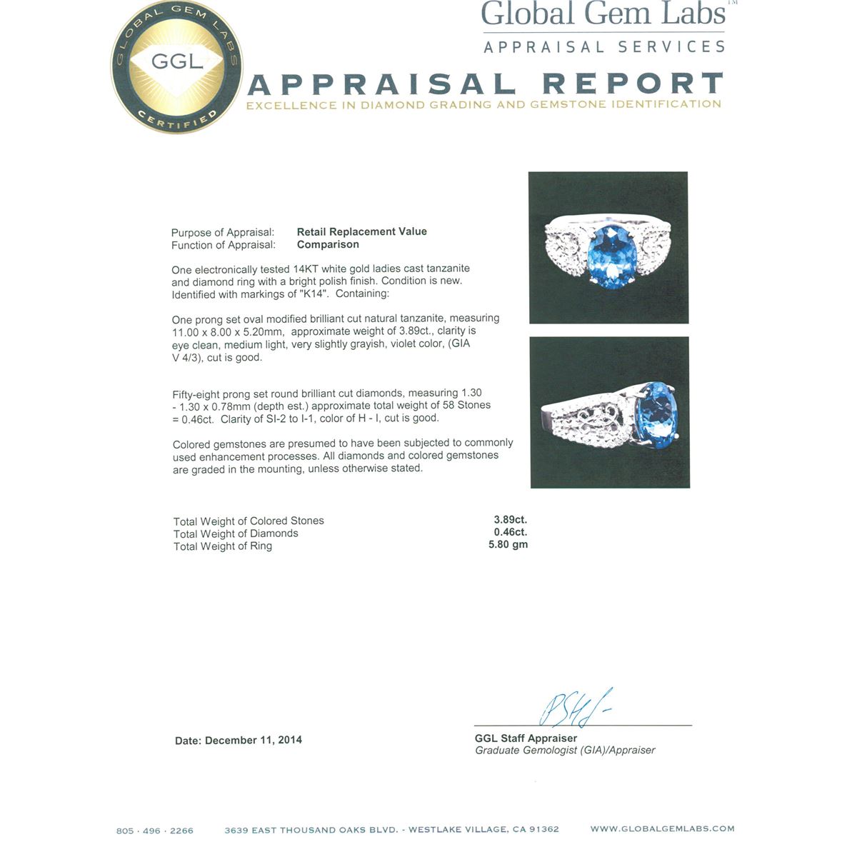 One electronically tested 14KT white gold ladies cast tanzanite and diamond ring with a bright polish finish. Identified with markings of "K14". Condition is new. Containing: One prong set oval modified brilliant cut natural tanzanite, measuring 11.00 x 8.00 x 5.20mm, approximate weight of 3.89ct., clarity is eye clean, medium light, very slightly grayish, violet color, (GIA V 4/3), cut is good. Fifty-Eight prong set round brilliant cut diamonds, measuring 1.30 - 1.30 x 0.78mm (depth est.) approximate total weight of 58 Stones = 0.46ct. Clarity: SI-2 to I-1. Color: H - I, Cut is Good. Colored gemstones are presumed to have been subjected to commonly used enhancement processes. All diamonds and colored gemstones are graded in the mounting, unless otherwise stated. Total Weight of Colored Stones 3.89ct. Total Weight of Diamonds 0.46ct. Total Weight of Ring 5.80 grams. GGL Appraised at $5,345.00.