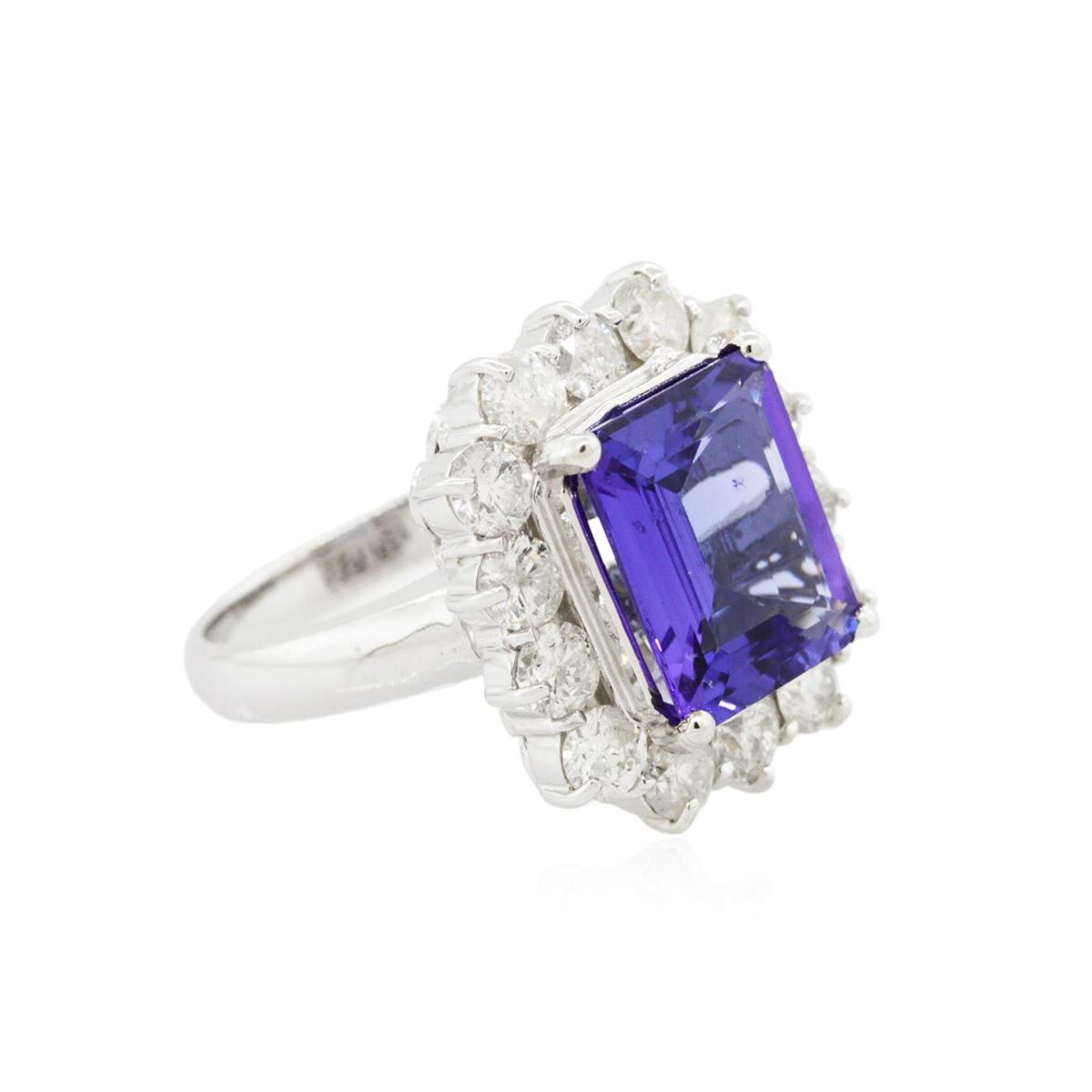 One electronically tested 14KT white gold Ladies combination cast & assembled ring with a bright polish finish. Condition is new. Identified with markings of "K14". Containing: One prong set emerald standard step cut natural tanzanite, measuring 11.10 x 9.00 x 4.30mm, approximate weight of 3.89ct., clarity is eye clean, type I, medium, moderately strong, bluish violet color, (GIA bV 5/4), cut is good. Colored gemstones are presumed to have been subjected to commonly used color/clarity enhancement processes. Fourteen prong set round brilliant cut diamonds, measuring 3.40 - 3.40 x 2.04mm (depth est.) approximate. Total Weight of 14 Stones = 2.01ct. Clarity: I-1 to I-2. Color: I - J, Cut is Good. Total Weight of Colored Stones 3.89ct. Total Weight of Diamonds 2.01ct. Total Weight of Ring 7.80 grams. GGL Appraised at $11,710.00.