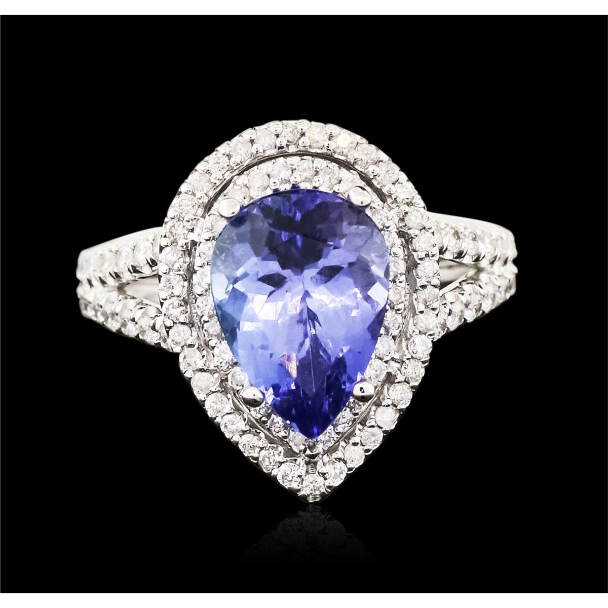 One electronically tested 14KT white gold ladies combination cast & assembled tanzanite and diamond ring with a split shank with a bright polish finish. Identified with markings of 14K. Condition is new. Containing: One prong set pear modified brilliant cut natural tanzanite, measuring 10.95 x 7.79 x 6.80mm, approximate weight of 3.89ct., clarity is eye clean, type I, medium light, very slightly grayish, violet color, (GIA V 4/3), cut is good. Ninety-Four prong set round brilliant cut diamonds, measuring 1.30 - 1.10 x 0.72mm (depth est.) approximate total weight of 94 Stones = 0.59ct. Clarity: I-1 to I-2. Color: H - I, Cut is Good. Colored gemstones are presumed to have been subjected to commonly used enhancement processes. All diamonds and colored gemstones are graded in the mounting, unless otherwise stated. Total Weight of Colored Stones 3.89ct. Total Weight of Diamonds 0.59ct. Total Weight of Ring 5.76 grams. GGL Appraised at $5,960.00.