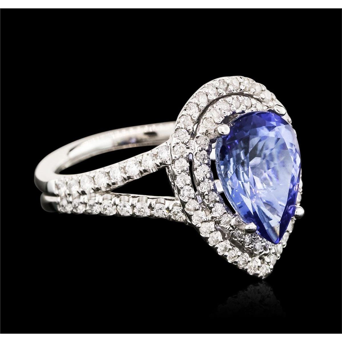 One electronically tested 14KT white gold ladies combination cast & assembled tanzanite and diamond ring with a split shank with a bright polish finish. Identified with markings of 14K. Condition is new. Containing: One prong set pear modified brilliant cut natural tanzanite, measuring 10.95 x 7.79 x 6.80mm, approximate weight of 3.89ct., clarity is eye clean, type I, medium light, very slightly grayish, violet color, (GIA V 4/3), cut is good. Ninety-Four prong set round brilliant cut diamonds, measuring 1.30 - 1.10 x 0.72mm (depth est.) approximate total weight of 94 Stones = 0.59ct. Clarity: I-1 to I-2. Color: H - I, Cut is Good. Colored gemstones are presumed to have been subjected to commonly used enhancement processes. All diamonds and colored gemstones are graded in the mounting, unless otherwise stated. Total Weight of Colored Stones 3.89ct. Total Weight of Diamonds 0.59ct. Total Weight of Ring 5.76 grams. GGL Appraised at $5,960.00.