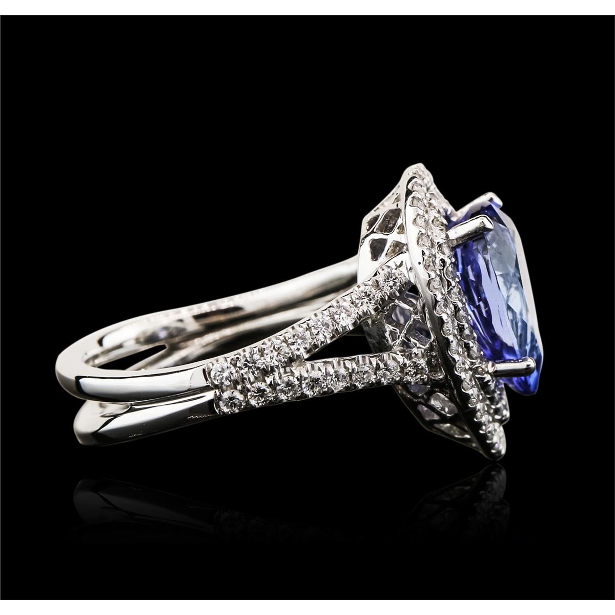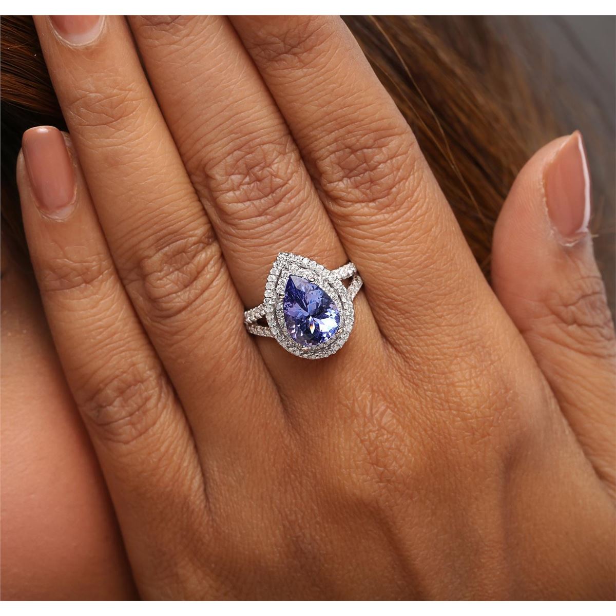 One electronically tested 14KT white gold ladies combination cast & assembled tanzanite and diamond ring with a split shank with a bright polish finish. Identified with markings of 14K. Condition is new. Containing: One prong set pear modified brilliant cut natural tanzanite, measuring 10.95 x 7.79 x 6.80mm, approximate weight of 3.89ct., clarity is eye clean, type I, medium light, very slightly grayish, violet color, (GIA V 4/3), cut is good. Ninety-Four prong set round brilliant cut diamonds, measuring 1.30 - 1.10 x 0.72mm (depth est.) approximate total weight of 94 Stones = 0.59ct. Clarity: I-1 to I-2. Color: H - I, Cut is Good. Colored gemstones are presumed to have been subjected to commonly used enhancement processes. All diamonds and colored gemstones are graded in the mounting, unless otherwise stated. Total Weight of Colored Stones 3.89ct. Total Weight of Diamonds 0.59ct. Total Weight of Ring 5.76 grams. GGL Appraised at $5,960.00.