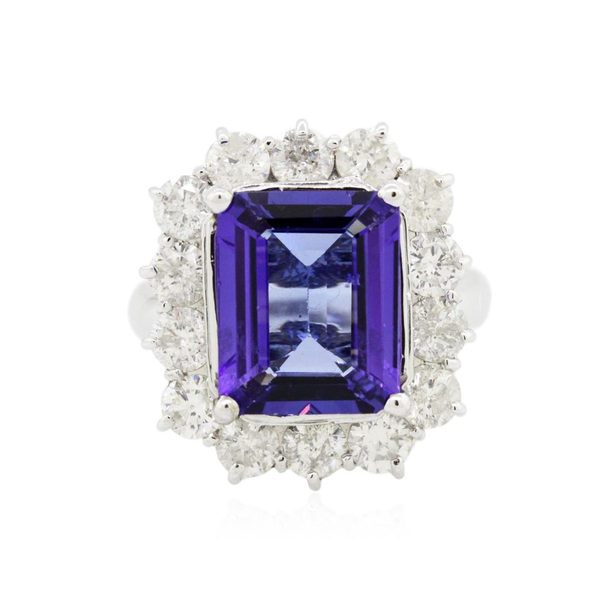 One electronically tested 14KT white gold Ladies combination cast & assembled ring with a bright polish finish. Condition is new. Identified with markings of "K14". Containing: One prong set emerald standard step cut natural tanzanite, measuring 11.10 x 9.00 x 4.30mm, approximate weight of 3.89ct., clarity is eye clean, type I, medium, moderately strong, bluish violet color, (GIA bV 5/4), cut is good. Colored gemstones are presumed to have been subjected to commonly used color/clarity enhancement processes. Fourteen prong set round brilliant cut diamonds, measuring 3.40 - 3.40 x 2.04mm (depth est.) approximate. Total Weight of 14 Stones = 2.01ct. Clarity: I-1 to I-2. Color: I - J, Cut is Good. Total Weight of Colored Stones 3.89ct. Total Weight of Diamonds 2.01ct. Total Weight of Ring 7.80 grams. GGL Appraised at $11,710.00.