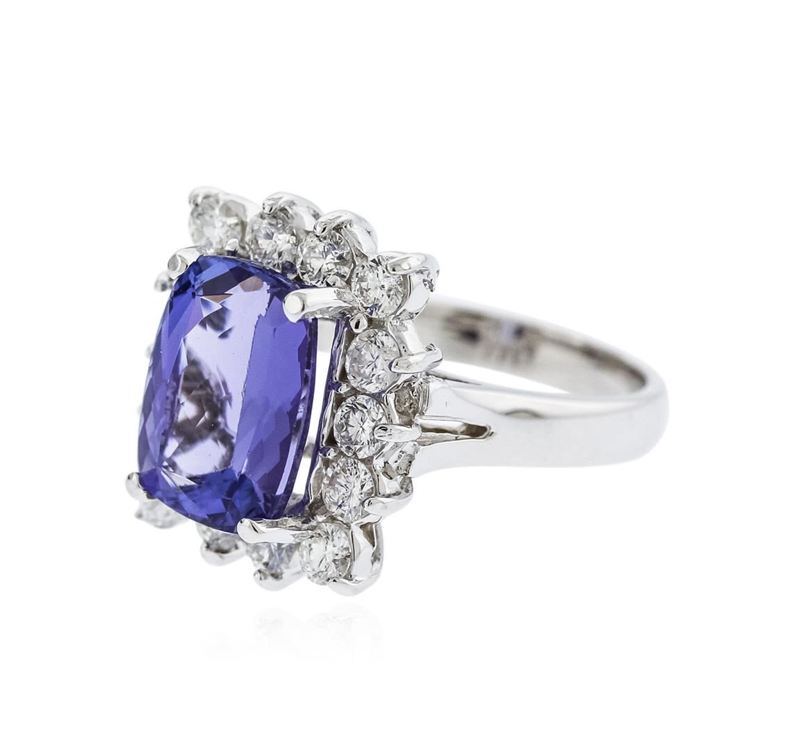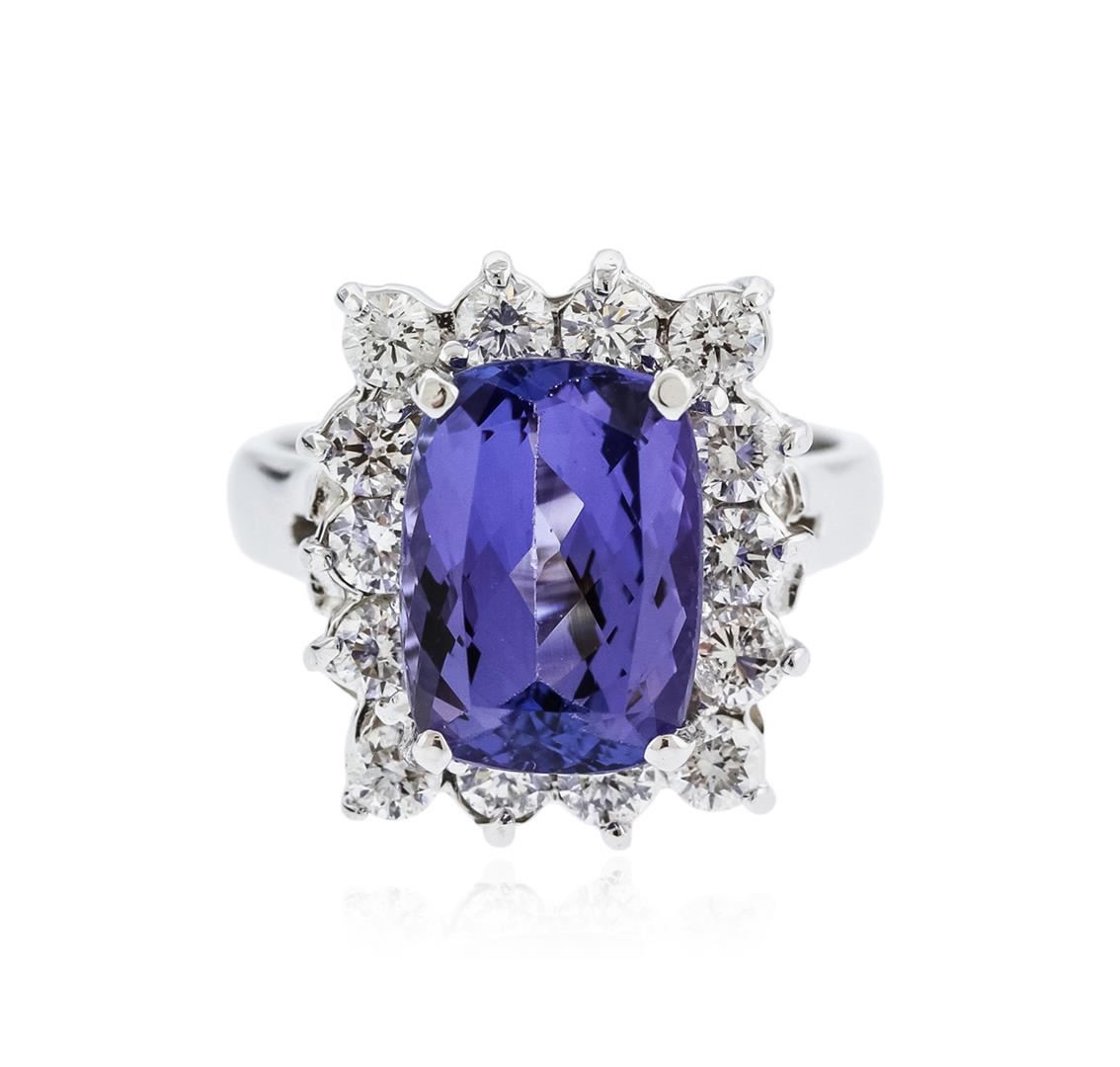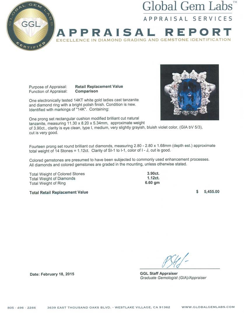 One electronically tested 14KT white gold ladies cast tanzanite and diamond ring with a bright polish finish. Identified with markings of "14K". Condition is new. Containing: One prong set rectangular cushion modified brilliant cut natural tanzanite, measuring 11.30 x 8.20 x 5.34mm, approximate weight of 3.90ct., clarity is eye clean, type I, medium, very slightly grayish, bluish violet color, (GIA bV 5/3), cut is very good. Fourteen prong set round brilliant cut diamonds, measuring 2.80 - 2.80 x 1.68mm (depth est.) approximate total weight of 14 Stones = 1.12ct. Clarity: SI-1 to I-1. Color: I - J, Cut is Good. Colored gemstones are presumed to have been subjected to commonly used enhancement processes. All diamonds and colored gemstones are graded in the mounting, unless otherwise stated. Total Weight of Colored Stones 3.90ct. Total Weight of Diamonds 1.12ct. Total Weight of Ring 6.60 grams. GGL Appraised at $5,455.00.