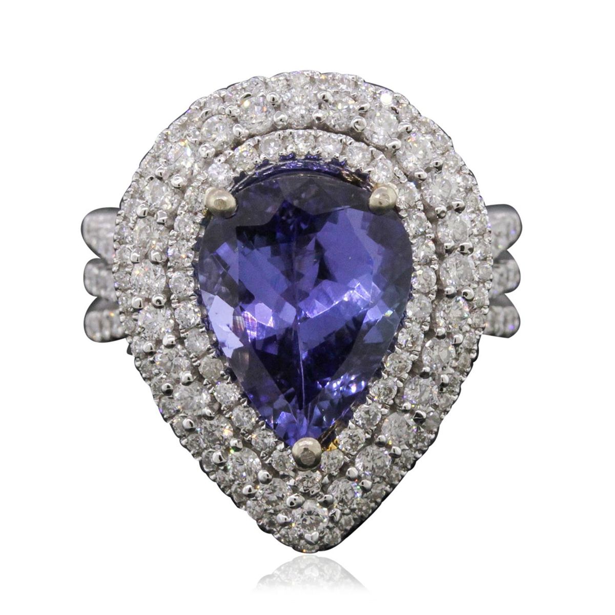 One electronically tested 14KT white gold ladies combination cast & assembled tanzanite and diamond ring with a split shank with a bright polish finish. Identified with markings of "14K". Condition is new. Containing: One prong set pear modified brilliant cut natural tanzanite, measuring 13.00 x 9.80 x 4.57mm, approximate weight of 3.90ct., clarity is eye clean, type I, medium, moderately strong, violet color, (GIA V 5/4), cut is good. One Hundred Forty-Nine prong set round brilliant cut diamonds, measuring 1.70 - 1.10 x 0.84mm (depth est.) approximate total weight of 149 Stones = 1.49ct. Clarity: SI-2 to I-2. Color: I - J, Cut is Good. Colored gemstones are presumed to have been subjected to commonly used enhancement processes. All diamonds and colored gemstones are graded in the mounting, unless otherwise stated total weight of Colored Stones 3.90ct. Total Weight of Diamonds 1.49ct. Total Weight of Ring 11.00 grams. GGL Appraised at $11,685.00.