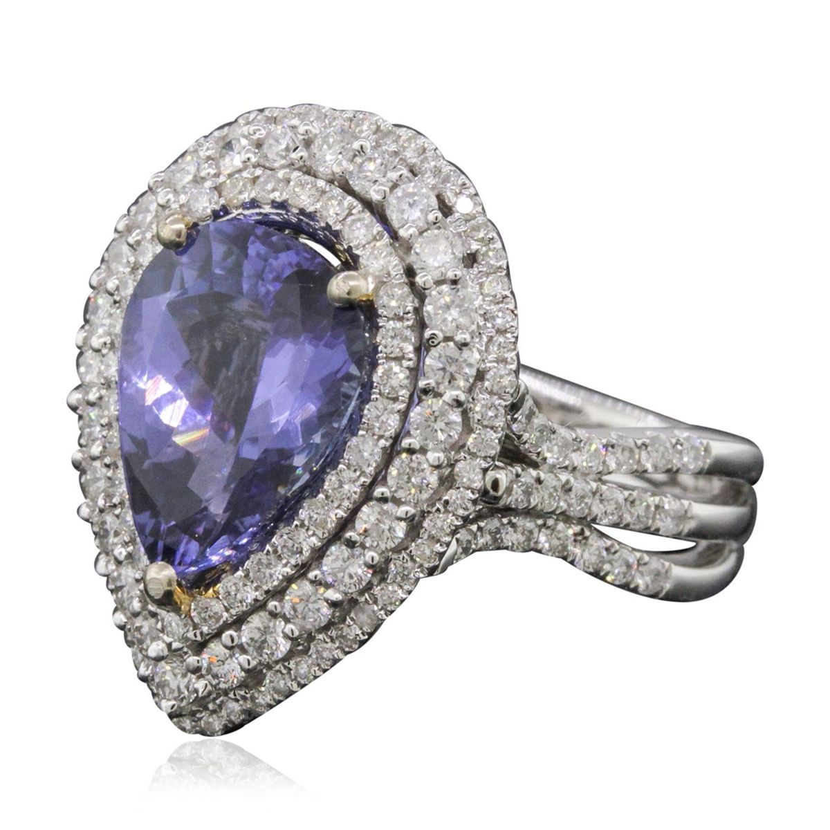 One electronically tested 14KT white gold ladies combination cast & assembled tanzanite and diamond ring with a split shank with a bright polish finish. Identified with markings of "14K". Condition is new. Containing: One prong set pear modified brilliant cut natural tanzanite, measuring 13.00 x 9.80 x 4.57mm, approximate weight of 3.90ct., clarity is eye clean, type I, medium, moderately strong, violet color, (GIA V 5/4), cut is good. One Hundred Forty-Nine prong set round brilliant cut diamonds, measuring 1.70 - 1.10 x 0.84mm (depth est.) approximate total weight of 149 Stones = 1.49ct. Clarity: SI-2 to I-2. Color: I - J, Cut is Good. Colored gemstones are presumed to have been subjected to commonly used enhancement processes. All diamonds and colored gemstones are graded in the mounting, unless otherwise stated total weight of Colored Stones 3.90ct. Total Weight of Diamonds 1.49ct. Total Weight of Ring 11.00 grams. GGL Appraised at $11,685.00.