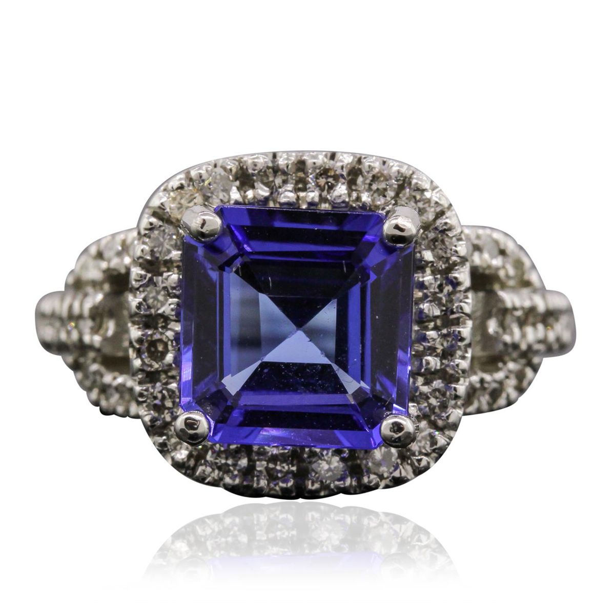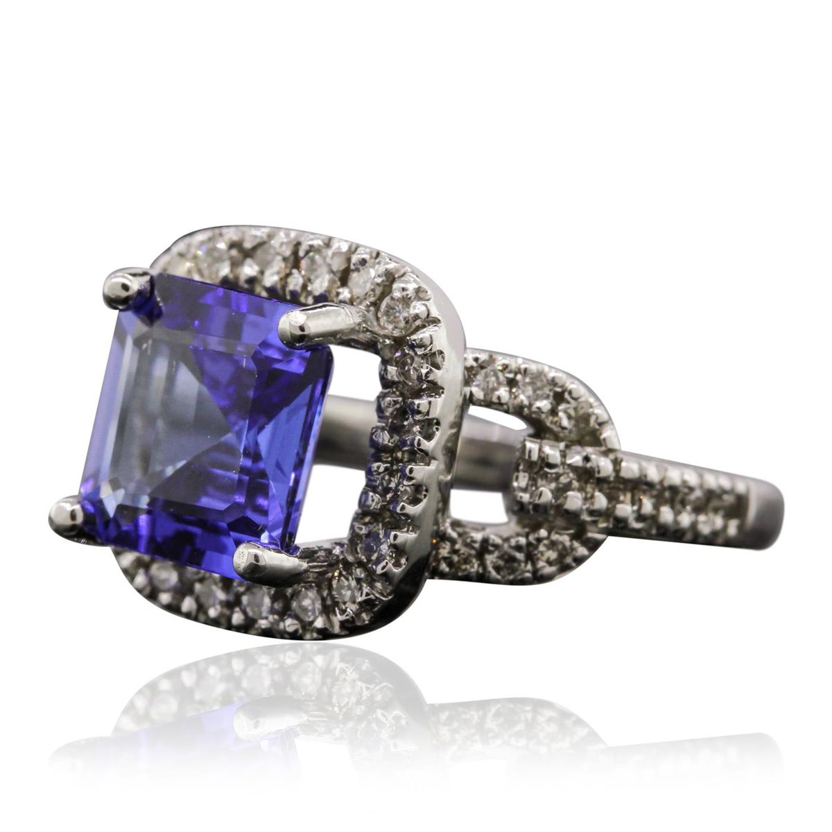 One electronically tested 14KT white gold Ladies combination cast & assembled ring with a bright polish finish. Condition is new. Identified with markings of "14K". Containing: One prong set emerald standard step cut natural tanzanite, measuring 9.30 x 9.30 x 5.00mm, approximate weight of 3.91ct., clarity is eye clean, type I, medium, moderately strong, bluish violet color, (GIA bV 5/4), cut is very good. Colored gemstones are presumed to have been subjected to commonly used color/clarity enhancement processes. Forty-Three prong set round brilliant cut diamonds, measuring 1.30 - 1.30 x 0.78mm (depth est.) approximate. Total Weight of 43 Stones = 0.34ct. Clarity: I-1 to I-2. Color: J - K, Cut is Good. Total Weight of Colored Stones 3.91ct. Total Weight of Diamonds 0.34ct. Total Weight of Ring 8.40 grams. GGL Appraised at $8,920.00.