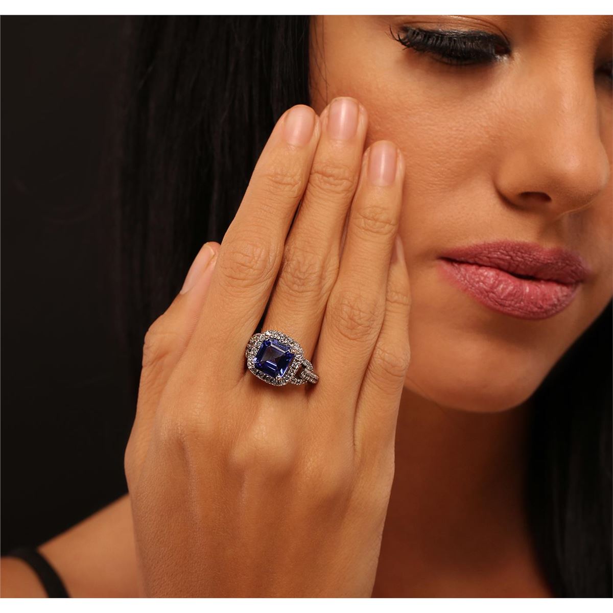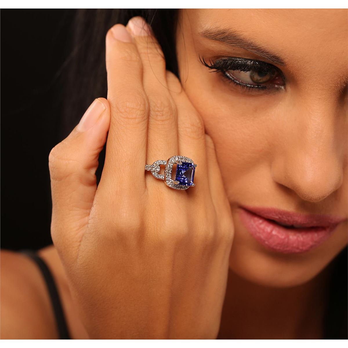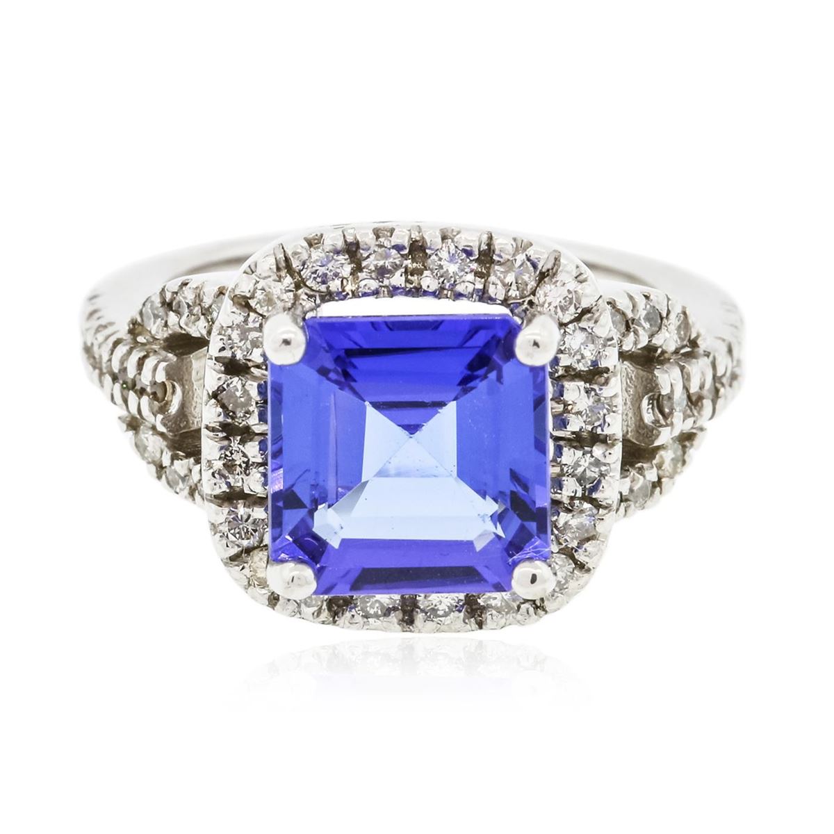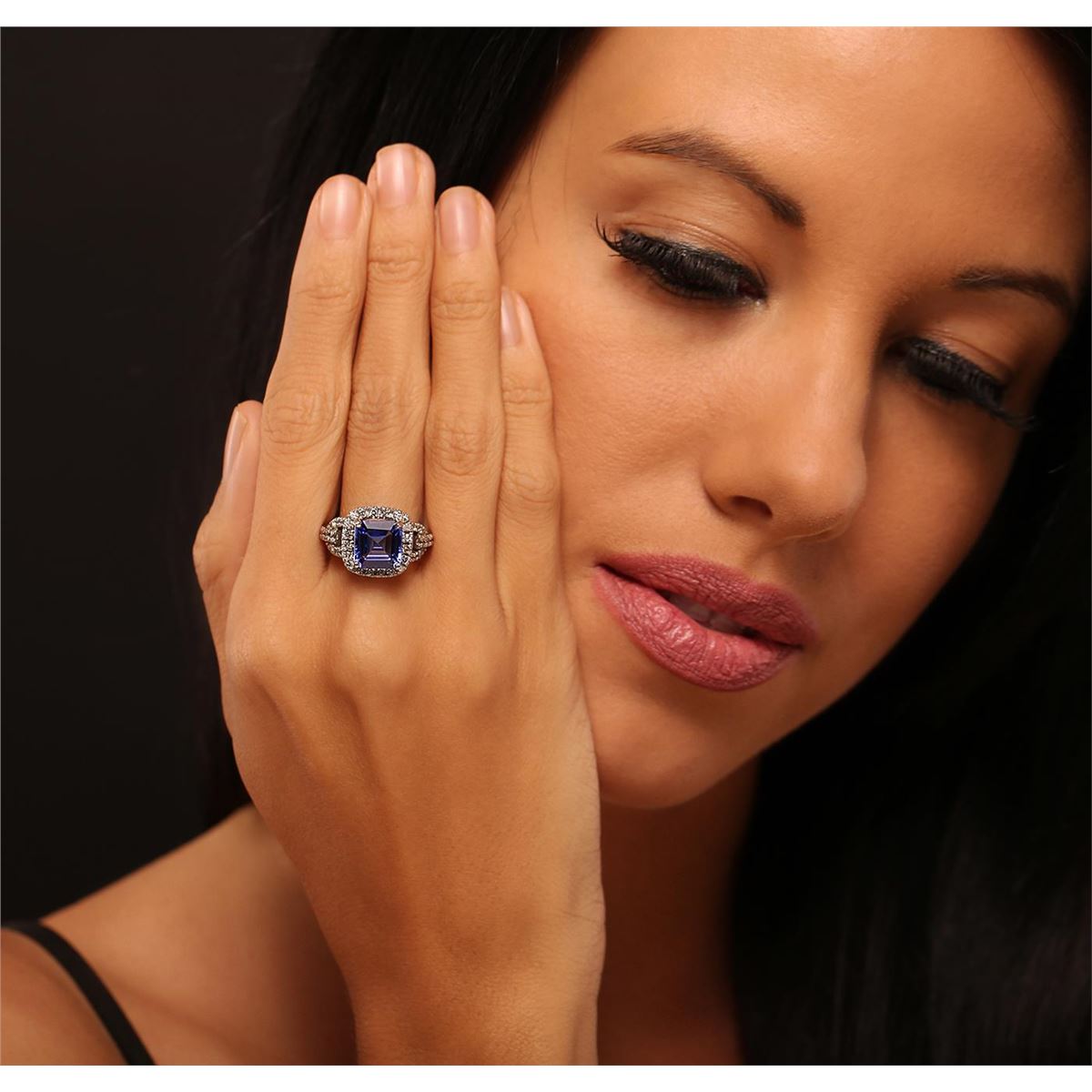 One electronically tested 14KT white gold Ladies combination cast & assembled ring with a bright polish finish. Condition is new. Identified with markings of "14K". Containing: One prong set emerald standard step cut natural tanzanite, measuring 9.30 x 9.30 x 5.00mm, approximate weight of 3.91ct., clarity is eye clean, type I, medium, moderately strong, bluish violet color, (GIA bV 5/4), cut is very good. Colored gemstones are presumed to have been subjected to commonly used color/clarity enhancement processes. Forty-Three prong set round brilliant cut diamonds, measuring 1.30 - 1.30 x 0.78mm (depth est.) approximate. Total Weight of 43 Stones = 0.34ct. Clarity: I-1 to I-2. Color: J - K, Cut is Good. Total Weight of Colored Stones 3.91ct. Total Weight of Diamonds 0.34ct. Total Weight of Ring 8.40 grams. GGL Appraised at $8,920.00.