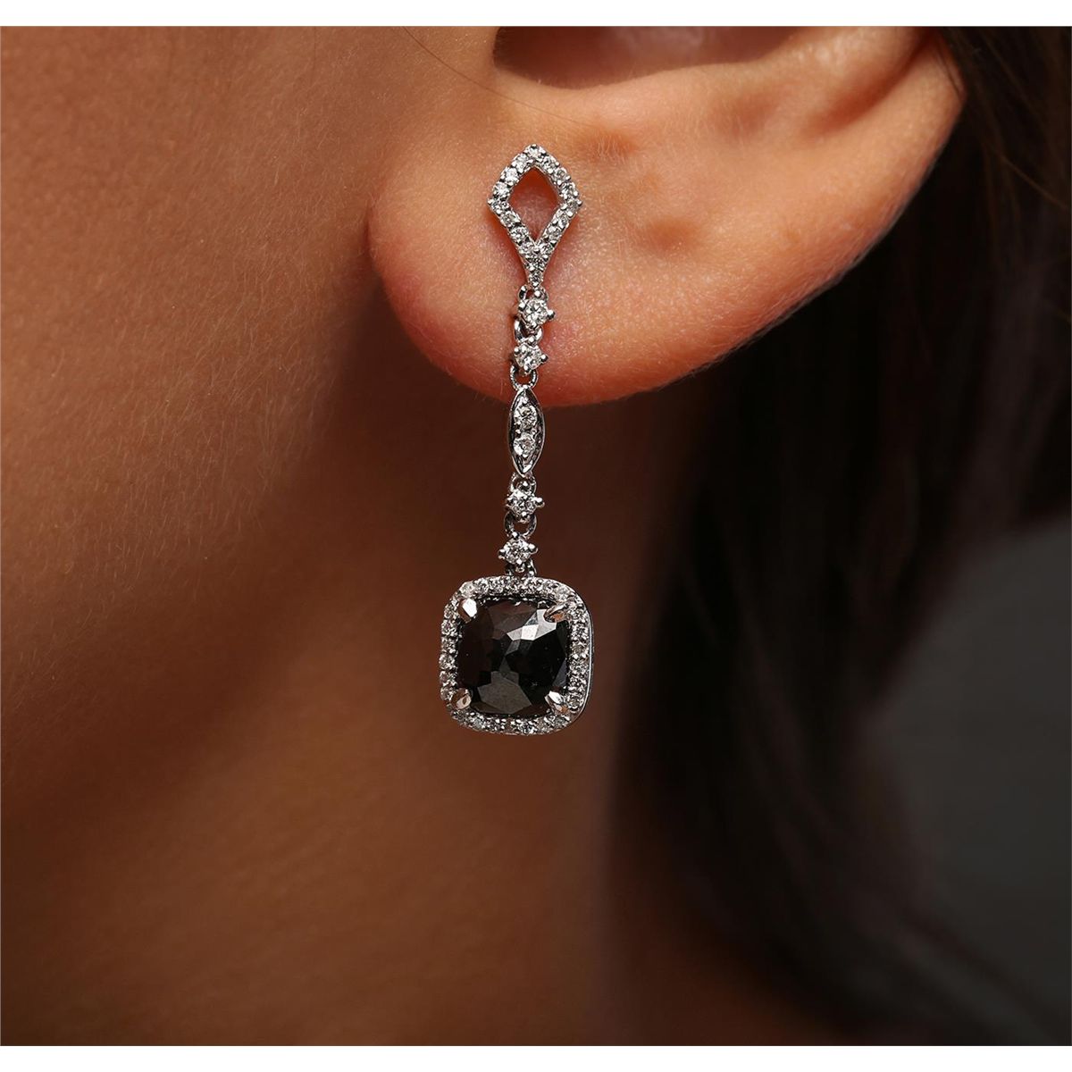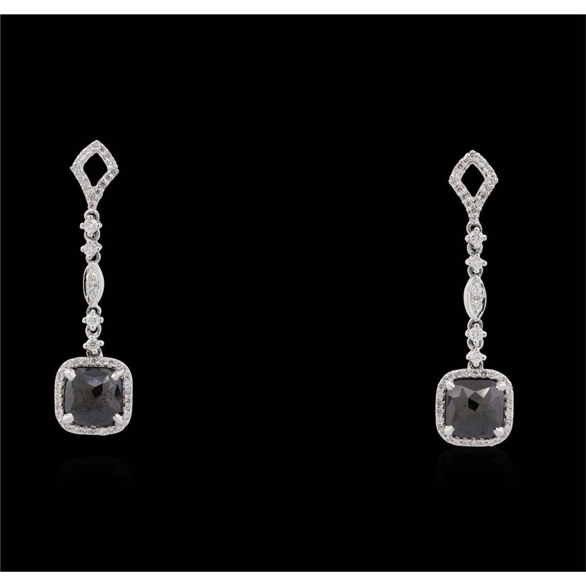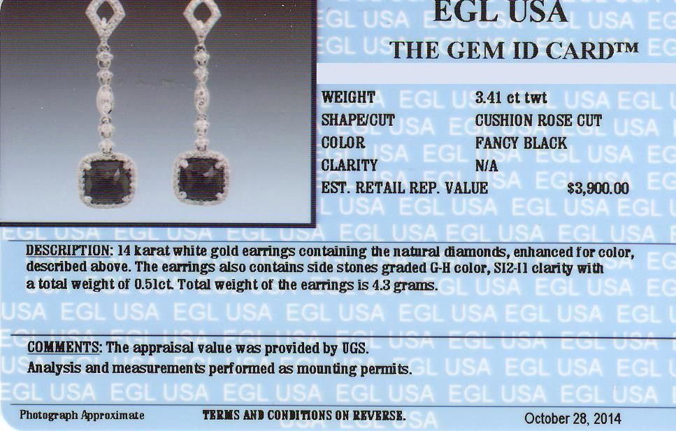 One 14KT white gold earrings containing two cushion rose cut fancy black diamonds, enhanced for color, with a total weight of 3.41ct. The earrings also contain diamonds graded G-H color , SI2-I1 clarity with a total weight of 0.51ct. Total weight of the e