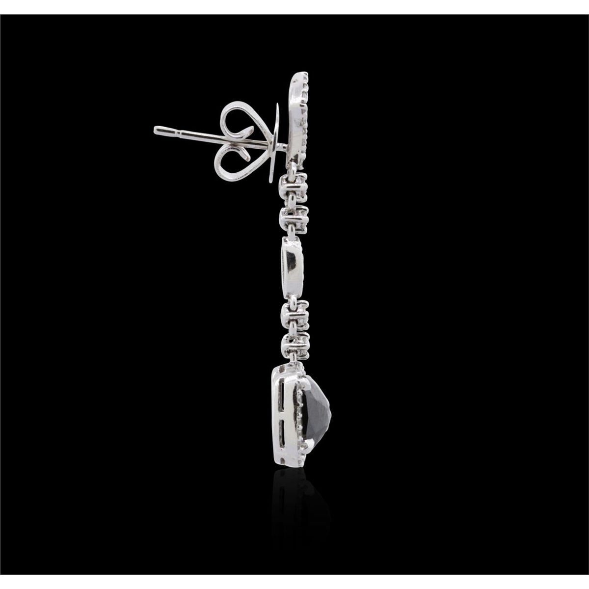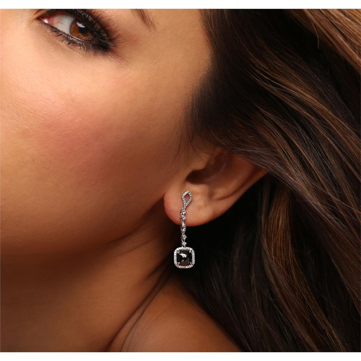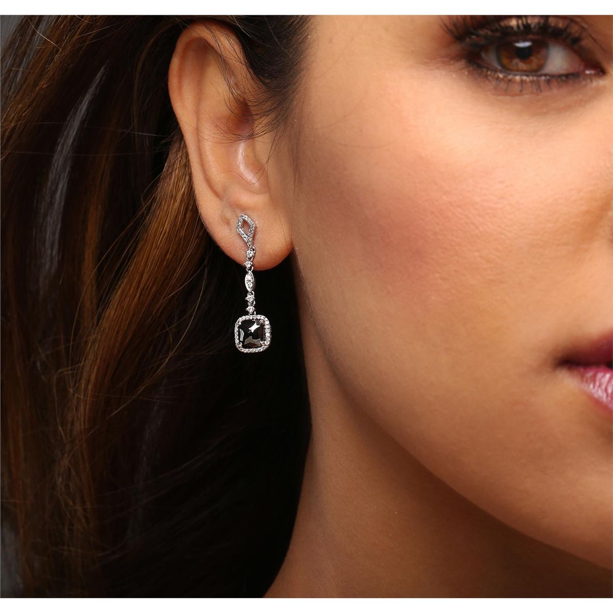 One 14KT white gold earrings containing two cushion rose cut fancy black diamonds, enhanced for color, with a total weight of 3.41ct. The earrings also contain diamonds graded G-H color , SI2-I1 clarity with a total weight of 0.51ct. Total weight of the e