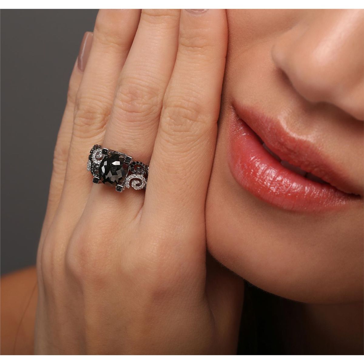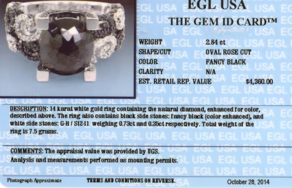 One 14KT white gold ring containing one natural oval rose cut fancy black diamond, enhanced for color, with a total weight of 2.84ct. The ring also contains black side stones: fancy black (color enhanced), and white side stones: G-H / SI2-I1 weighing 0.73ct and 0.35ct respectively. Total weight of the ring is 7.50 grams. EGL Appraised at $4,360.00.