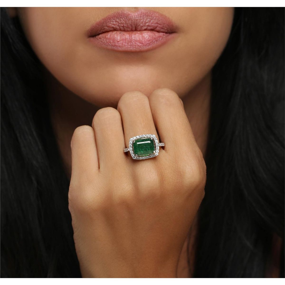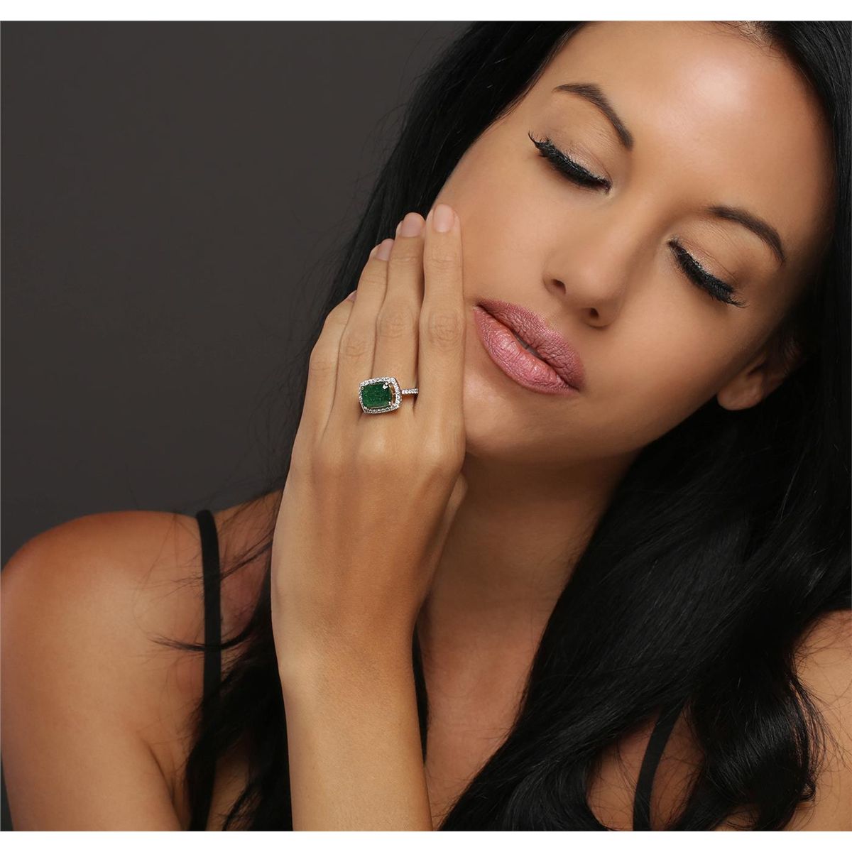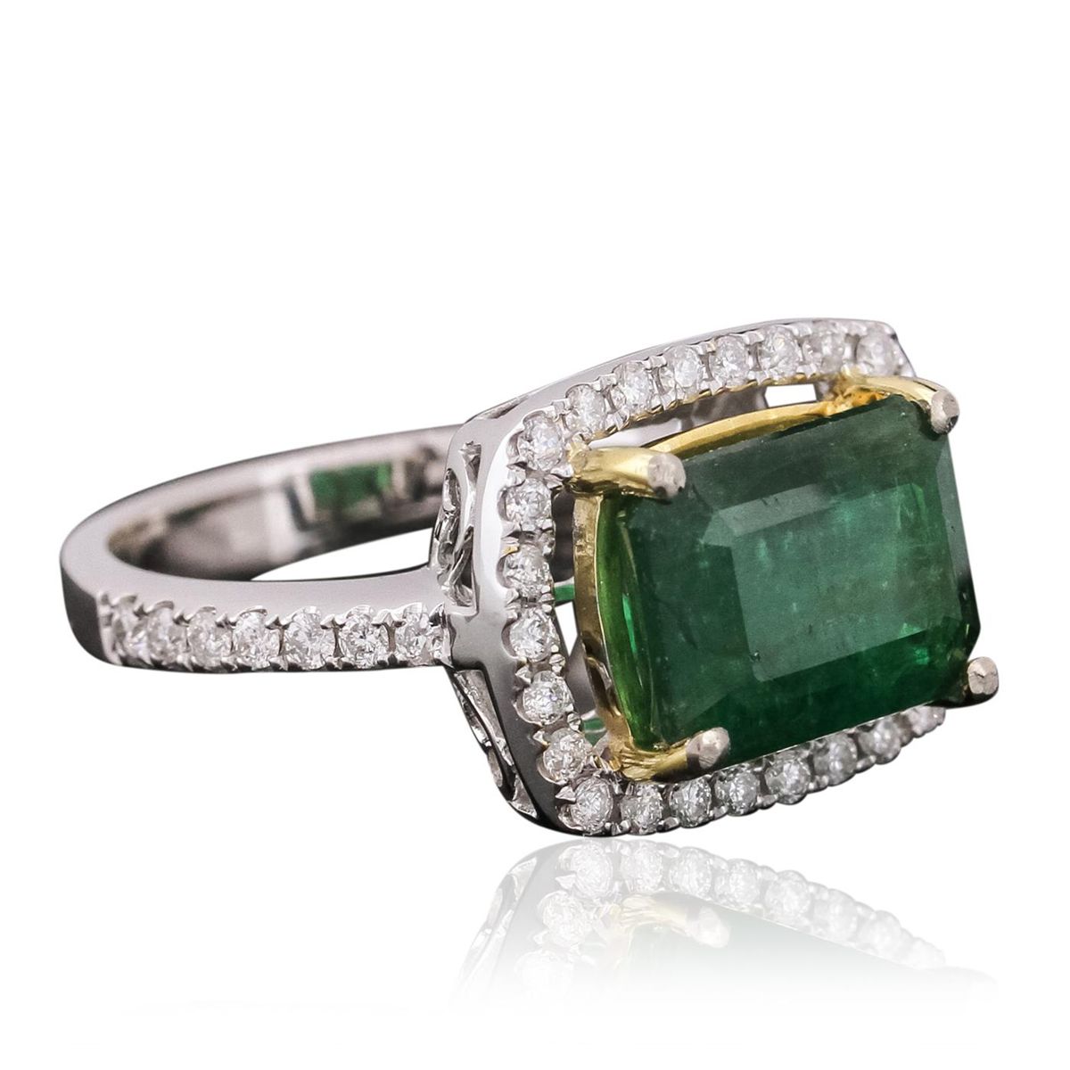 One electronically tested 14KT white gold ladies cast emerald and diamond ring with a bright polish finish. The featured emerald is set within a diamond bezel supported by diamond set shoulders, completed by a two and one-half millimeter wide band. Identified with markings of "14K". Condition is new, good workmanship. Containing: One prong set rectangular step cut natural emerald, measuring 10.60 x 8.10 x 5.20mm, 8% bulge factor, approximate weight of 3.93ct., clarity is heavily included, type III, dark, very slightly grayish, green color, (GIA G 7/3), cut is good. Transmitting light somewhat diffusely, transparent to translucent. Naturally occurring internal & external characteristics are present. Indications of oil residue. Graded in the setting. Forty prong set round brilliant cut diamonds, measuring 1.60 - 1.50 x 0.93mm (depth est.) approximate total weight of 40 Stones = 0.64ct. Graded in the setting. Clarity: SI-1 to I-1. Color: G - I. Total Weight of Colored Stones 3.93ct. Total Weight of Diamonds 0.64ct. Total Weight of Ring 5.57 grams. AIG Appraised at $9,350.00.