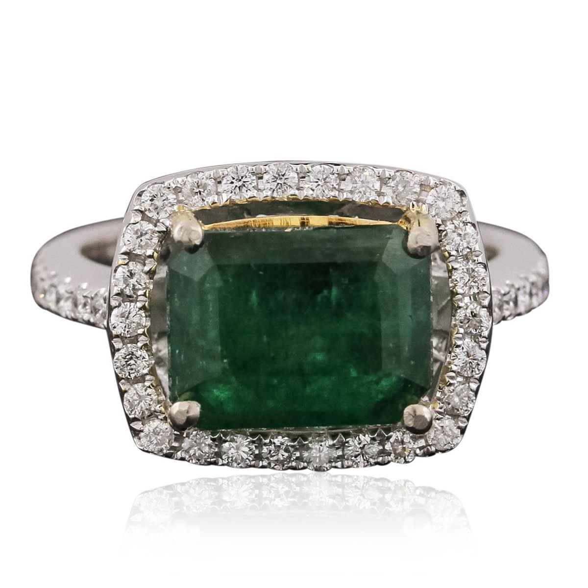 One electronically tested 14KT white gold ladies cast emerald and diamond ring with a bright polish finish. The featured emerald is set within a diamond bezel supported by diamond set shoulders, completed by a two and one-half millimeter wide band. Identified with markings of "14K". Condition is new, good workmanship. Containing: One prong set rectangular step cut natural emerald, measuring 10.60 x 8.10 x 5.20mm, 8% bulge factor, approximate weight of 3.93ct., clarity is heavily included, type III, dark, very slightly grayish, green color, (GIA G 7/3), cut is good. Transmitting light somewhat diffusely, transparent to translucent. Naturally occurring internal & external characteristics are present. Indications of oil residue. Graded in the setting. Forty prong set round brilliant cut diamonds, measuring 1.60 - 1.50 x 0.93mm (depth est.) approximate total weight of 40 Stones = 0.64ct. Graded in the setting. Clarity: SI-1 to I-1. Color: G - I. Total Weight of Colored Stones 3.93ct. Total Weight of Diamonds 0.64ct. Total Weight of Ring 5.57 grams. AIG Appraised at $9,350.00.