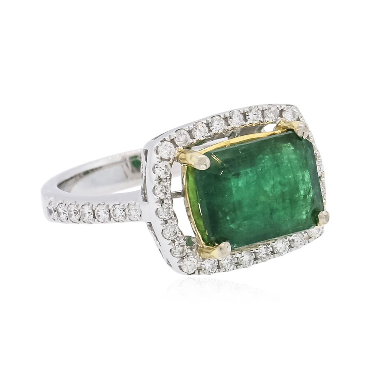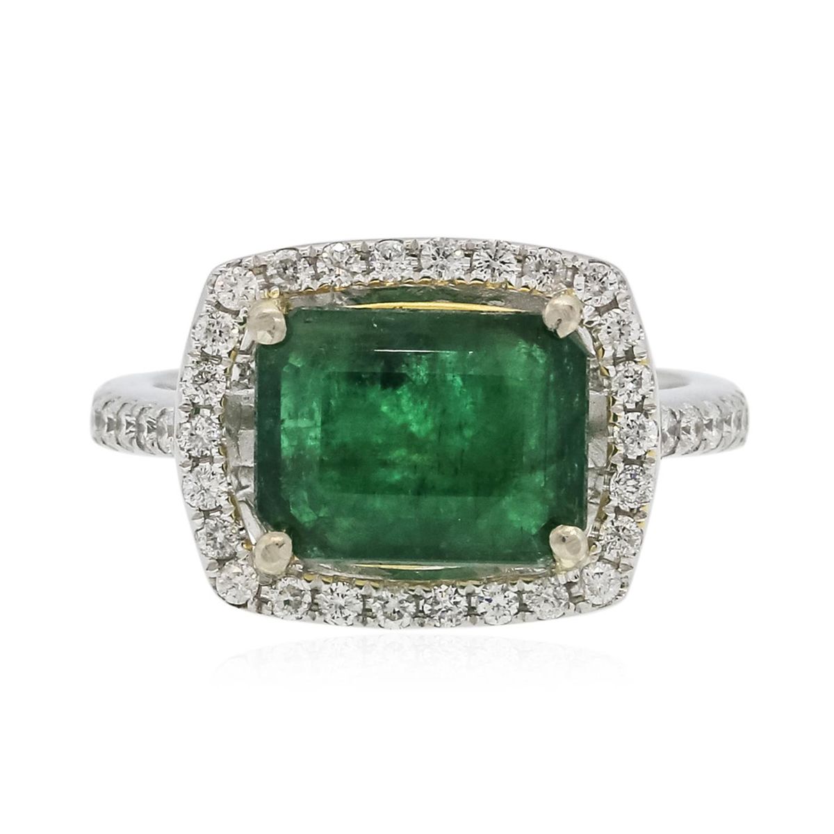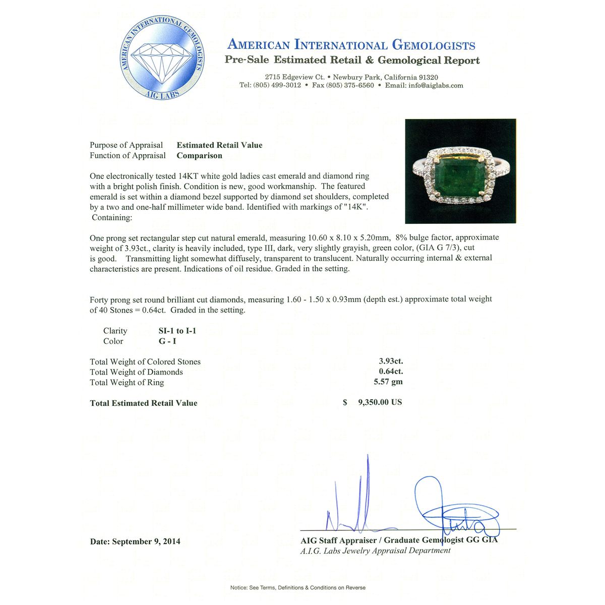 One electronically tested 14KT white gold ladies cast emerald and diamond ring with a bright polish finish. The featured emerald is set within a diamond bezel supported by diamond set shoulders, completed by a two and one-half millimeter wide band. Identified with markings of "14K". Condition is new, good workmanship. Containing: One prong set rectangular step cut natural emerald, measuring 10.60 x 8.10 x 5.20mm, 8% bulge factor, approximate weight of 3.93ct., clarity is heavily included, type III, dark, very slightly grayish, green color, (GIA G 7/3), cut is good. Transmitting light somewhat diffusely, transparent to translucent. Naturally occurring internal & external characteristics are present. Indications of oil residue. Graded in the setting. Forty prong set round brilliant cut diamonds, measuring 1.60 - 1.50 x 0.93mm (depth est.) approximate total weight of 40 Stones = 0.64ct. Graded in the setting. Clarity: SI-1 to I-1. Color: G - I. Total Weight of Colored Stones 3.93ct. Total Weight of Diamonds 0.64ct. Total Weight of Ring 5.57 grams. AIG Appraised at $9,350.00.