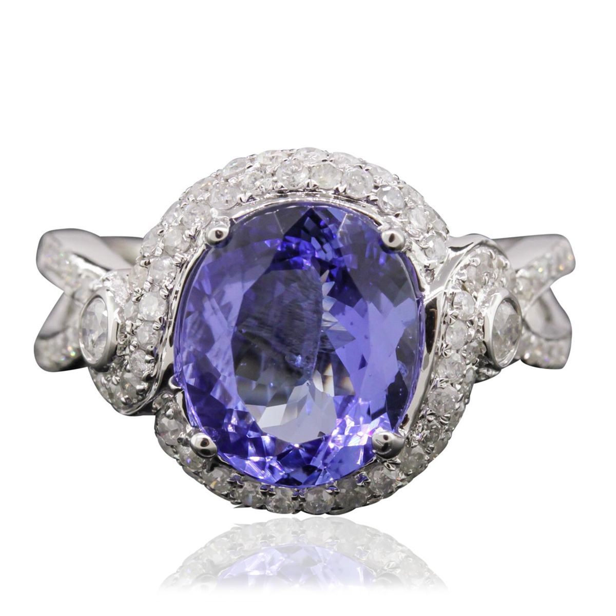One electronically tested 14KT white gold Ladies combination cast & assembled ring with a bright polish finish. Condition is new. Identified with markings of "14K". Containing: One prong set oval modified brilliant cut natural tanzanite, measuring 11.05 x 9.00 x 5.85mm, approximate weight of 3.94ct., clarity is eye clean, type I, medium light, very slightly grayish, violet color, (GIA V 4/3), cut is good. Colored gemstones are presumed to have been subjected to commonly used color/clarity enhancement processes. All grading of diamonds and colored gemstones in this piece of jewelry are graded in the mounting, unless otherwise stated. Two bezel set round brilliant cut diamonds, measuring 3.00 - 3.00 x 1.80mm (depth est.) approximate. Total Weight of 2 Stones = 0.20ct. Clarity: I-2 to I-3. Color: I - J, Cut is Good. Eighty-Eight bead set round brilliant cut diamonds, measuring 1.10 - 1.10 x 0.66mm (depth est.) approximate. Total Weight of 88 Stones = 0.42ct. Clarity: I-2 to I-3. Color: I - J. Total Weight of Colored Stones 3.94ct. Total Weight of Diamonds 0.62ct. Total Weight of Ring 5.60 grams. GGL Appraised at $8,660.00.