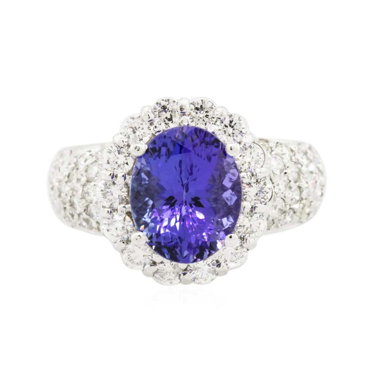 One electronically tested 14KT white gold Ladies cast ring with a bright polish finish. Condition is new. Identified with markings of "14K". Containing: One prong set oval modified brilliant cut natural tanzanite, measuring 10.30 x 8.50 x 6.65mm, approximate weight of 3.94ct., clarity is eye clean, type I, medium, moderately strong, bluish violet color, (GIA bV 5/4), cut is good. Colored gemstones are presumed to have been subjected to commonly used color/clarity enhancement processes. Fourteen prong set round brilliant cut diamonds, measuring 2.40 - 2.40 x 1.44mm (depth est.) approximate. Total Weight of 14 Stones = 0.71ct. Clarity: I-1 to I-2. Color: H - I, Cut is Good. Thirty-Eight prong set round brilliant cut diamonds, measuring 1.50 - 1.50 x 0.90mm (depth est.) approximate. Total Weight of 38 Stones = 0.47ct. Clarity: I-1 to I-2. Color: H - I, Cut is Good. All grading of diamonds and colored gemstones in this piece of jewelry are graded in the mounting, unless otherwise stated. Total Weight of Colored Stones 3.94ct. Total Weight of Diamonds 1.18ct. Total Weight of Ring 8.10 grams. GGL Appraised at $10,345.00.