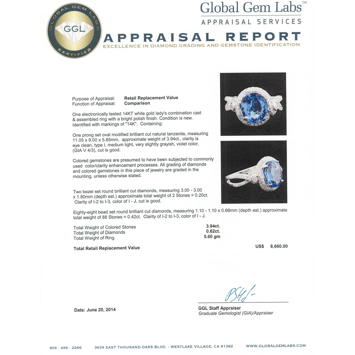 One electronically tested 14KT white gold Ladies combination cast & assembled ring with a bright polish finish. Condition is new. Identified with markings of "14K". Containing: One prong set oval modified brilliant cut natural tanzanite, measuring 11.05 x 9.00 x 5.85mm, approximate weight of 3.94ct., clarity is eye clean, type I, medium light, very slightly grayish, violet color, (GIA V 4/3), cut is good. Colored gemstones are presumed to have been subjected to commonly used color/clarity enhancement processes. All grading of diamonds and colored gemstones in this piece of jewelry are graded in the mounting, unless otherwise stated. Two bezel set round brilliant cut diamonds, measuring 3.00 - 3.00 x 1.80mm (depth est.) approximate. Total Weight of 2 Stones = 0.20ct. Clarity: I-2 to I-3. Color: I - J, Cut is Good. Eighty-Eight bead set round brilliant cut diamonds, measuring 1.10 - 1.10 x 0.66mm (depth est.) approximate. Total Weight of 88 Stones = 0.42ct. Clarity: I-2 to I-3. Color: I - J. Total Weight of Colored Stones 3.94ct. Total Weight of Diamonds 0.62ct. Total Weight of Ring 5.60 grams. GGL Appraised at $8,660.00.