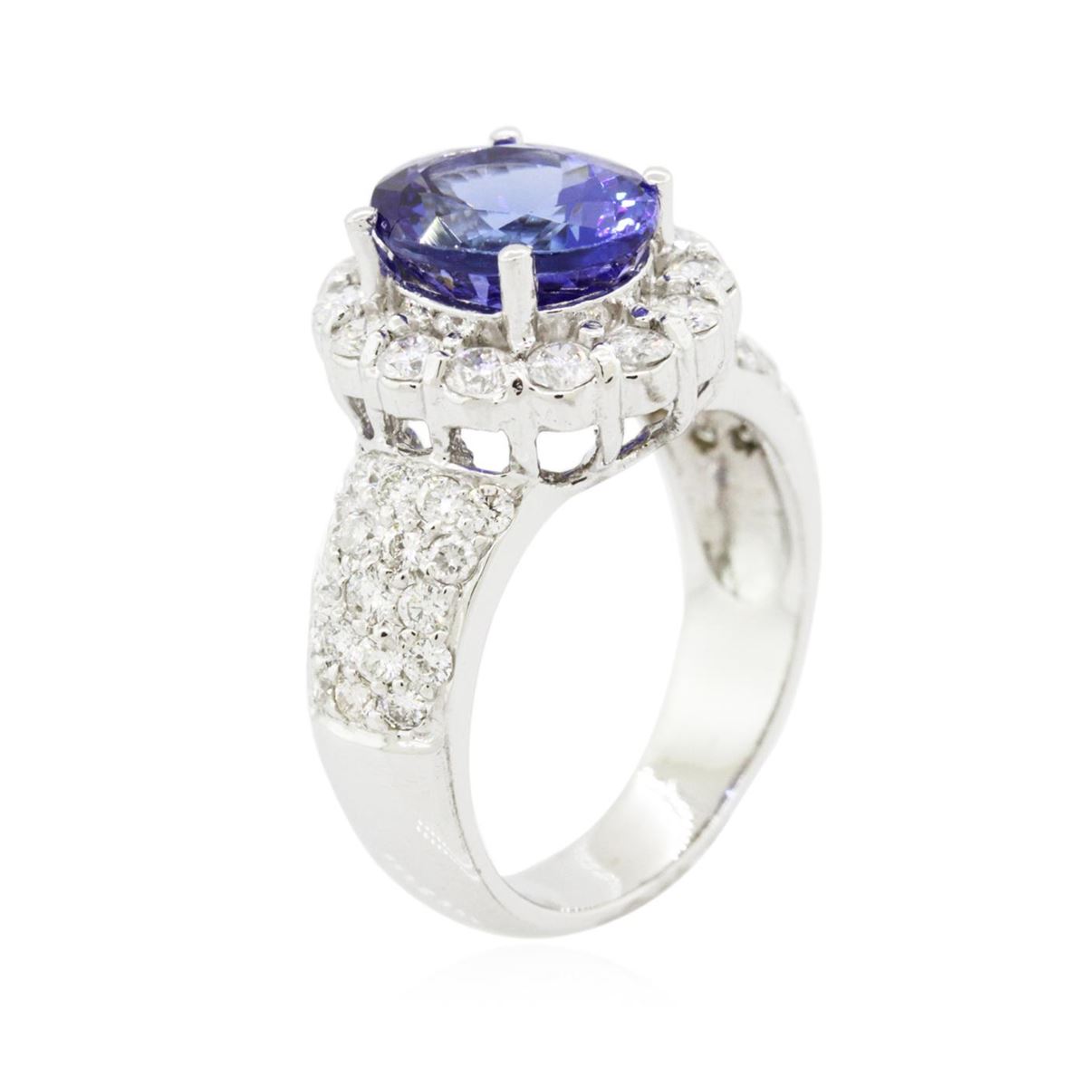 One electronically tested 14KT white gold Ladies cast ring with a bright polish finish. Condition is new. Identified with markings of "14K". Containing: One prong set oval modified brilliant cut natural tanzanite, measuring 10.30 x 8.50 x 6.65mm, approximate weight of 3.94ct., clarity is eye clean, type I, medium, moderately strong, bluish violet color, (GIA bV 5/4), cut is good. Colored gemstones are presumed to have been subjected to commonly used color/clarity enhancement processes. Fourteen prong set round brilliant cut diamonds, measuring 2.40 - 2.40 x 1.44mm (depth est.) approximate. Total Weight of 14 Stones = 0.71ct. Clarity: I-1 to I-2. Color: H - I, Cut is Good. Thirty-Eight prong set round brilliant cut diamonds, measuring 1.50 - 1.50 x 0.90mm (depth est.) approximate. Total Weight of 38 Stones = 0.47ct. Clarity: I-1 to I-2. Color: H - I, Cut is Good. All grading of diamonds and colored gemstones in this piece of jewelry are graded in the mounting, unless otherwise stated. Total Weight of Colored Stones 3.94ct. Total Weight of Diamonds 1.18ct. Total Weight of Ring 8.10 grams. GGL Appraised at $10,345.00.