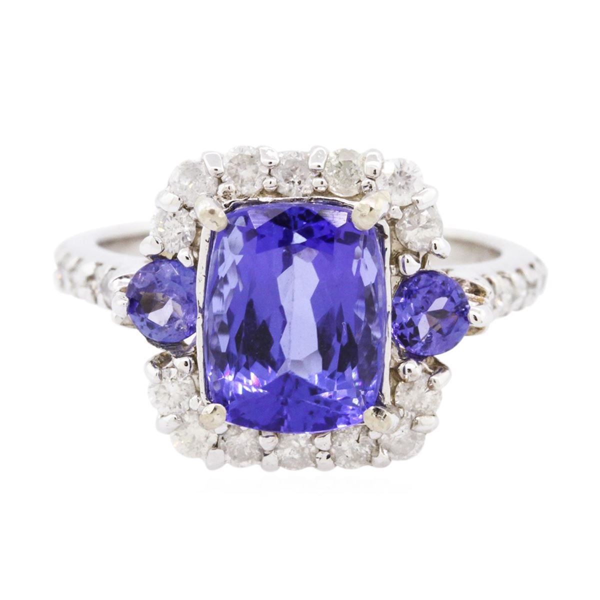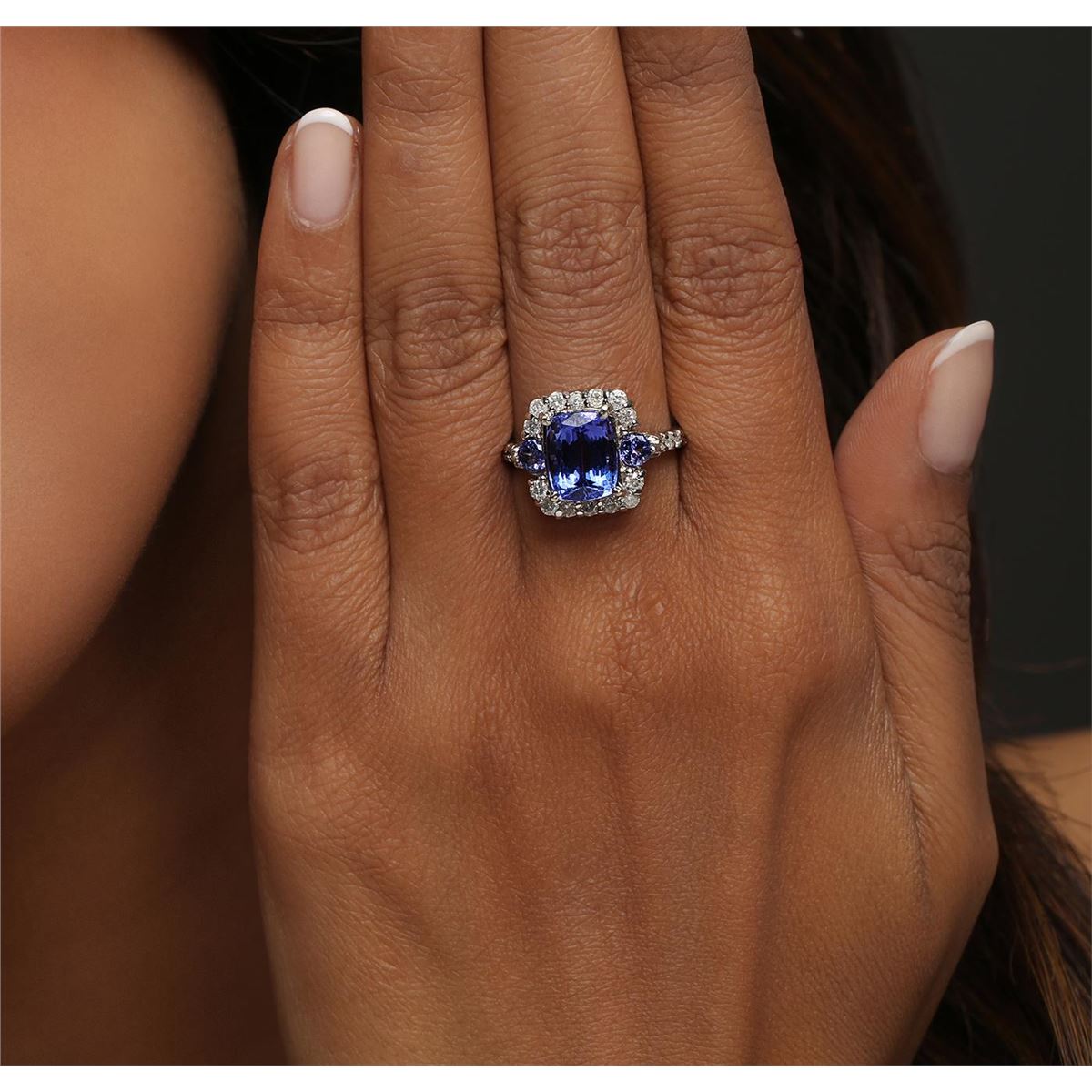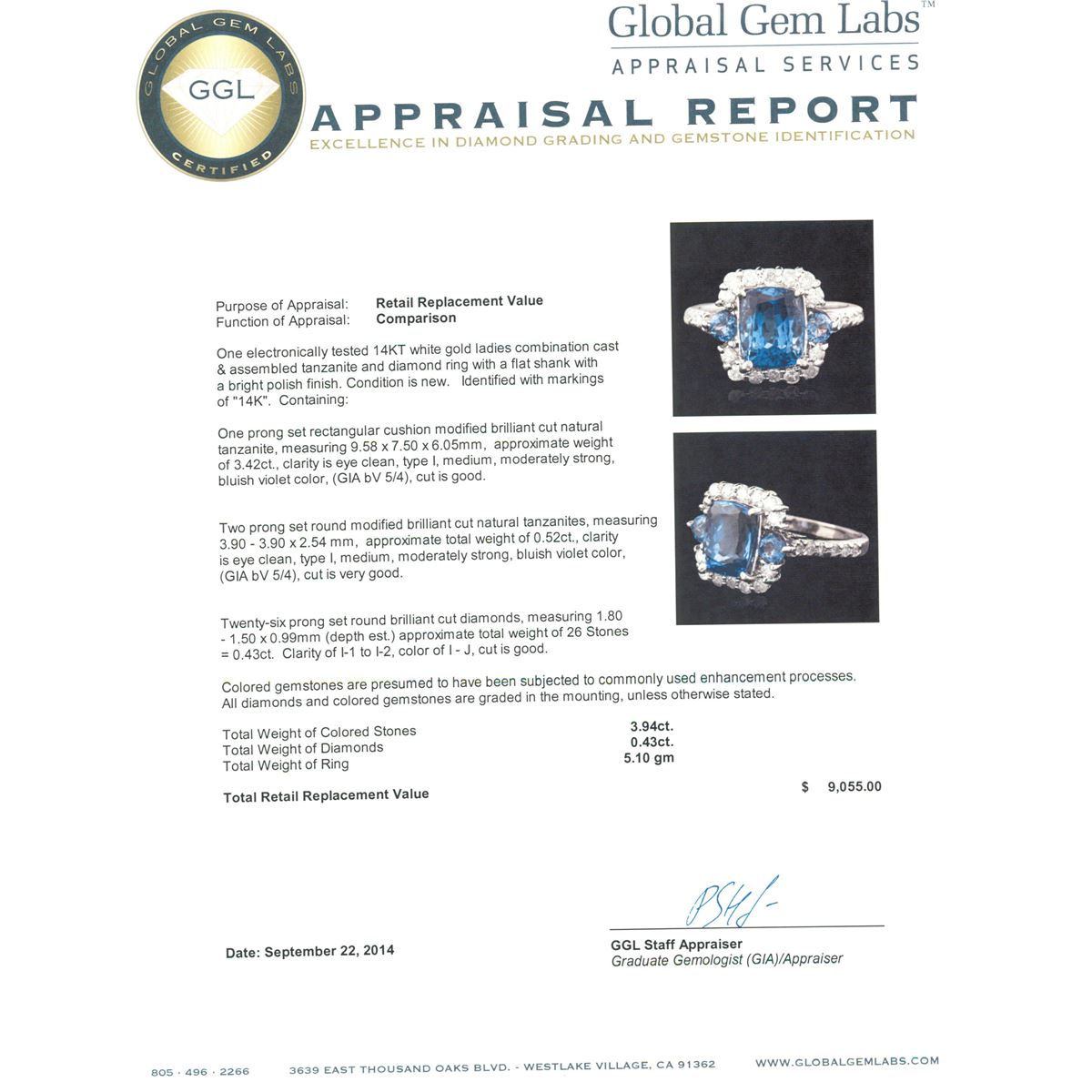 One electronically tested 14KT white gold ladies combination cast & assembled tanzanite and diamond ring with a flat shank with a bright polish finish. Identified with markings of "14K". Condition is new. Containing: One prong set rectangular cushion modified brilliant cut natural tanzanite, measuring 9.58 x 7.50 x 6.05mm, approximate weight of 3.42ct., clarity is eye clean, type I, medium, moderately strong, bluish violet color, (GIA bV 5/4), cut is good. Two prong set round modified brilliant cut natural tanzanites, measuring 3.90 - 3.90 x 2.54 mm, approximate total weight of 0.52ct., clarity is eye clean, type I, medium, moderately strong, bluish violet color, (GIA bV 5/4), cut is very good. Twenty-Six prong set round brilliant cut diamonds, measuring 1.80 - 1.50 x 0.99mm (depth est.) approximate total weight of 26 Stones = 0.43ct. Clarity: I-1 to I-2. Color: I - J, Cut is Good. Colored gemstones are presumed to have been subjected to commonly used enhancement processes. All diamonds and colored gemstones are graded in the mounting, unless otherwise stated. Total Weight of Colored Stones 3.94ct. Total Weight of Diamonds 0.43ct. Total Weight of Ring 5.10 grams. GGL Appraised at $9,055.00.