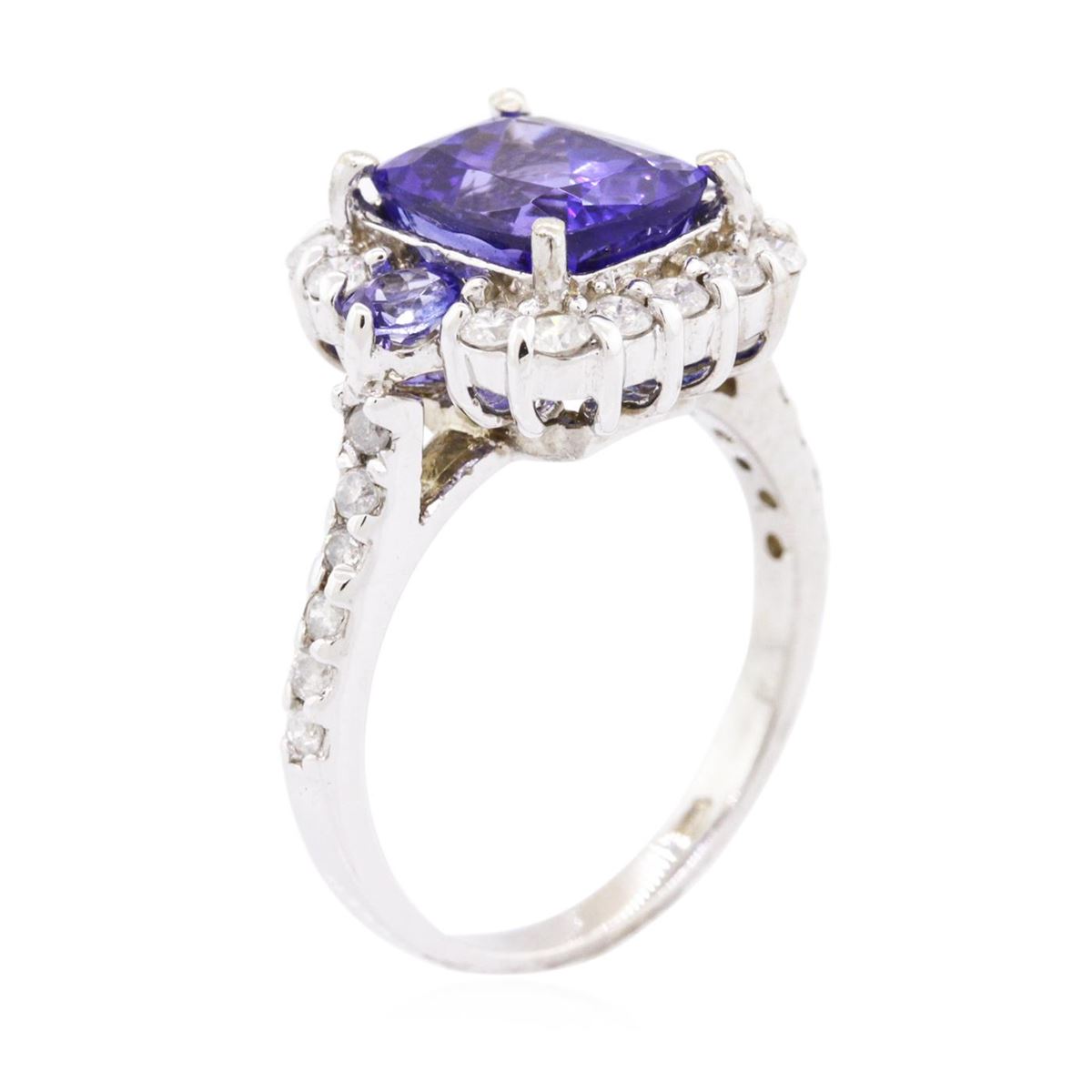 One electronically tested 14KT white gold ladies combination cast & assembled tanzanite and diamond ring with a flat shank with a bright polish finish. Identified with markings of "14K". Condition is new. Containing: One prong set rectangular cushion modified brilliant cut natural tanzanite, measuring 9.58 x 7.50 x 6.05mm, approximate weight of 3.42ct., clarity is eye clean, type I, medium, moderately strong, bluish violet color, (GIA bV 5/4), cut is good. Two prong set round modified brilliant cut natural tanzanites, measuring 3.90 - 3.90 x 2.54 mm, approximate total weight of 0.52ct., clarity is eye clean, type I, medium, moderately strong, bluish violet color, (GIA bV 5/4), cut is very good. Twenty-Six prong set round brilliant cut diamonds, measuring 1.80 - 1.50 x 0.99mm (depth est.) approximate total weight of 26 Stones = 0.43ct. Clarity: I-1 to I-2. Color: I - J, Cut is Good. Colored gemstones are presumed to have been subjected to commonly used enhancement processes. All diamonds and colored gemstones are graded in the mounting, unless otherwise stated. Total Weight of Colored Stones 3.94ct. Total Weight of Diamonds 0.43ct. Total Weight of Ring 5.10 grams. GGL Appraised at $9,055.00.