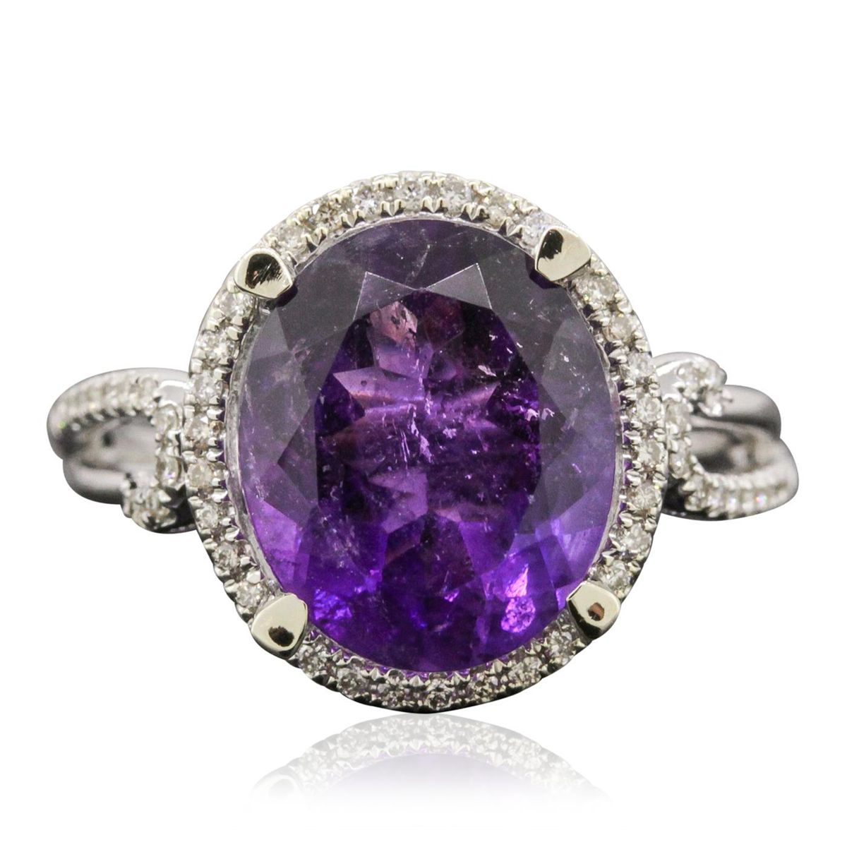 One electronically tested 14KT white gold ladies combination cast & assembled ring with a bright polish finish. Condition is new. Identified with markings of "14K". Containing: One prong set oval modified brilliant cut natural amethyst, measuring 11.80 x 9.80 x 6.37mm, approximate weight of 3.95ct., clarity is eye clean, type II, medium light, very slightly grayish, purple color, (GIA P 4/3), cut is very good. Fifty-Eight prong set round brilliant cut diamonds, measuring 1.00 - 1.00 x 0.60mm (depth est.) approximate total weight of 58 Stones = 0.21ct. Clarity: I-1 to I-2. Color: H - I, Cut is Good. Colored gemstones are presumed to have been subjected to commonly used enhancement processes. All diamonds and colored gemstones are graded in the mounting, unless otherwise stated. Total Weight of Colored Stones 3.95ct. Total Weight of Diamonds 0.21ct. Total Weight of Ring 4.20 grams. GGL Appraised at $2,920.00.
