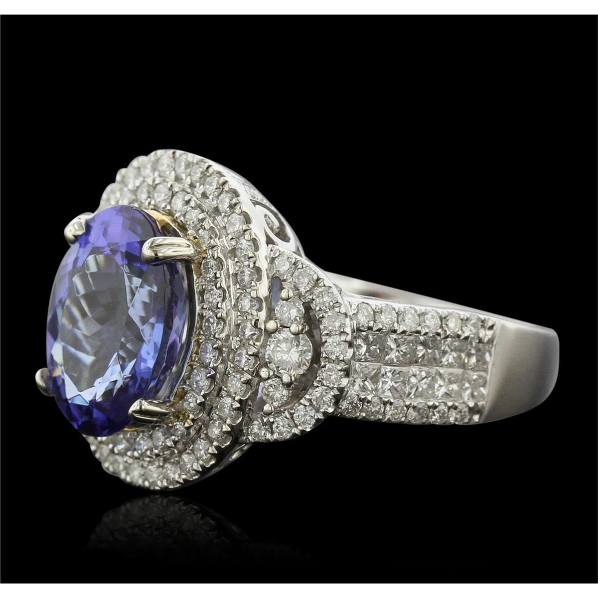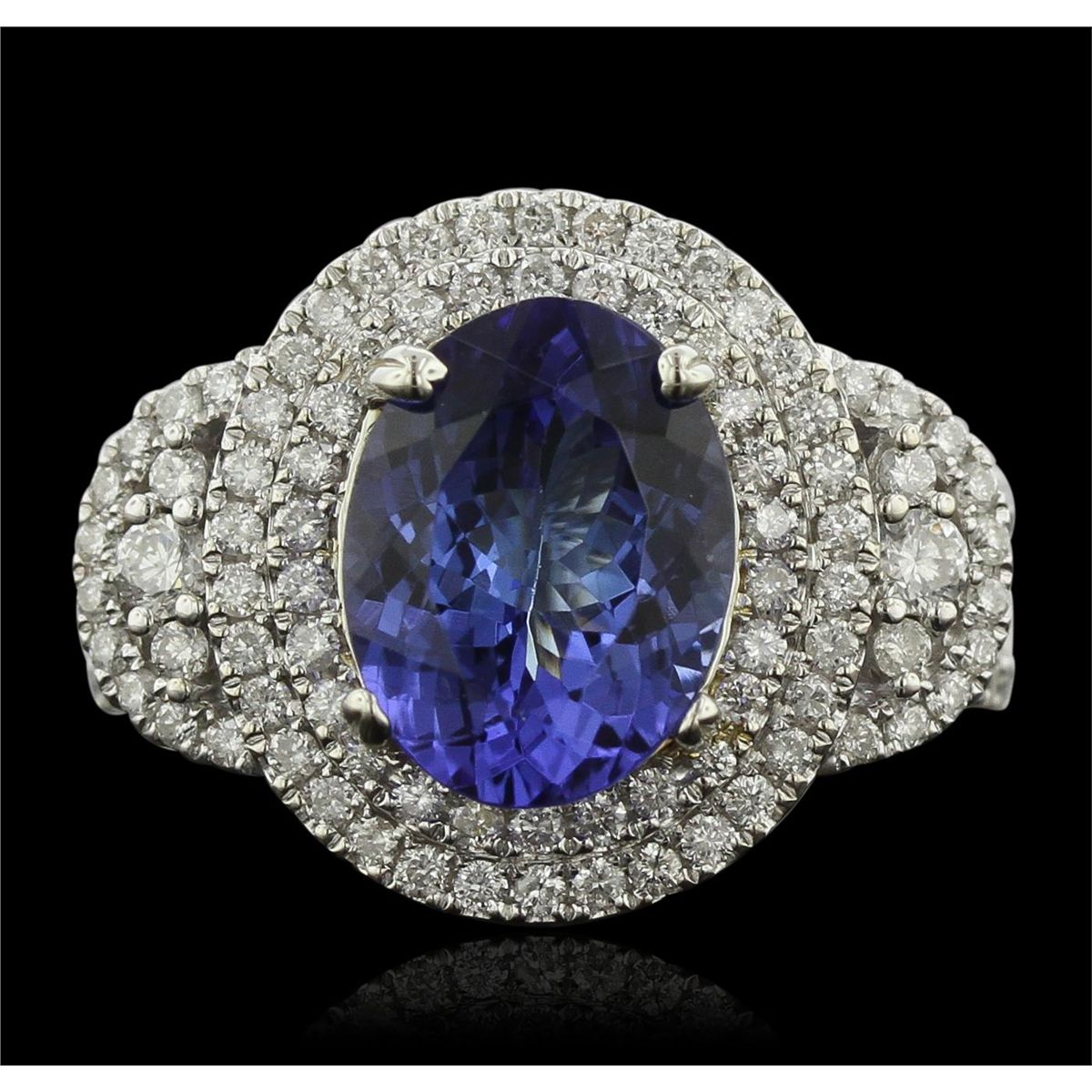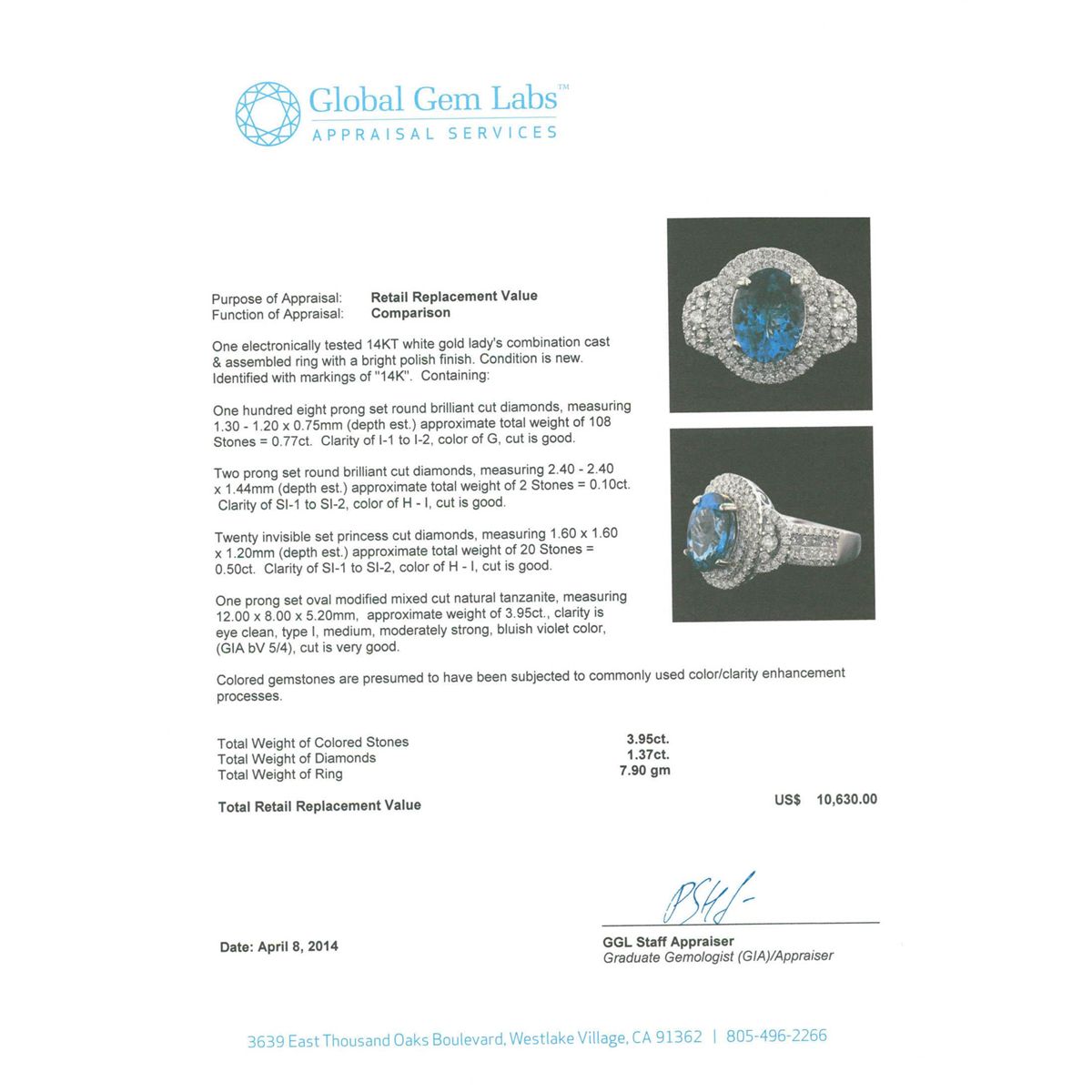 One electronically tested 14KT white gold Ladies combination cast & assembled ring with a bright polish finish. Condition is new. Identified with markings of "14K". Containing: One Hundred Eight prong set round brilliant cut diamonds, measuring 1.30 - 1.20 x 0.75mm (depth est.) approximate. Total Weight of 108 Stones = 0.77ct. Clarity: I-1 to I-2. Color: G, Cut is Good. Two prong set round brilliant cut diamonds, measuring 2.40 - 2.40 x 1.44mm (depth est.) approximate. Total Weight of 2 Stones = 0.10ct. Clarity: SI-1 to SI-2. Color: H - I, Cut is Good. Twenty invisible set princess cut diamonds, measuring 1.60 x 1.60 x 1.20mm (depth est.) approximate. Total Weight of 20 Stones = 0.50ct. Clarity: SI-1 to SI-2. Color: H - I, Cut is Good. One prong set oval modified mixed cut natural tanzanite, measuring 12.00 x 8.00 x 5.20mm, approximate weight of 3.95ct., clarity is eye clean, type I, medium, moderately strong, bluish violet color, (GIA bV 5/4), cut is very good. Colored gemstones are presumed to have been subjected to commonly used color/clarity enhancement processes. Total Weight of Colored Stones 3.95ct. Total Weight of Diamonds 1.37ct. Total Weight of Ring 7.90 grams. GGL Appraised at $10,630.00.