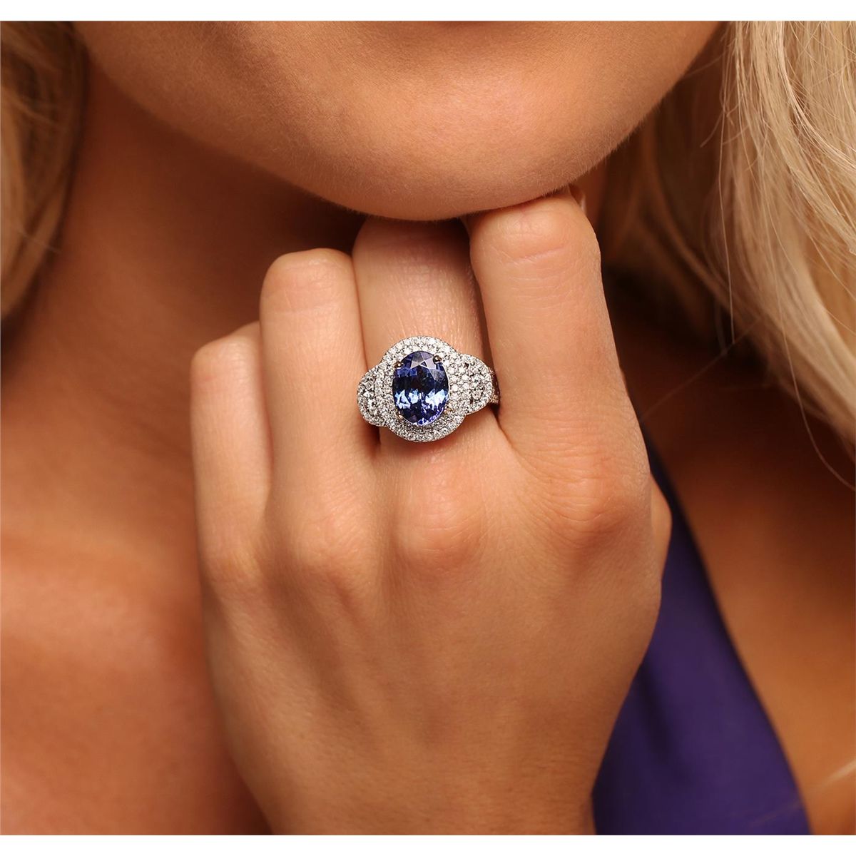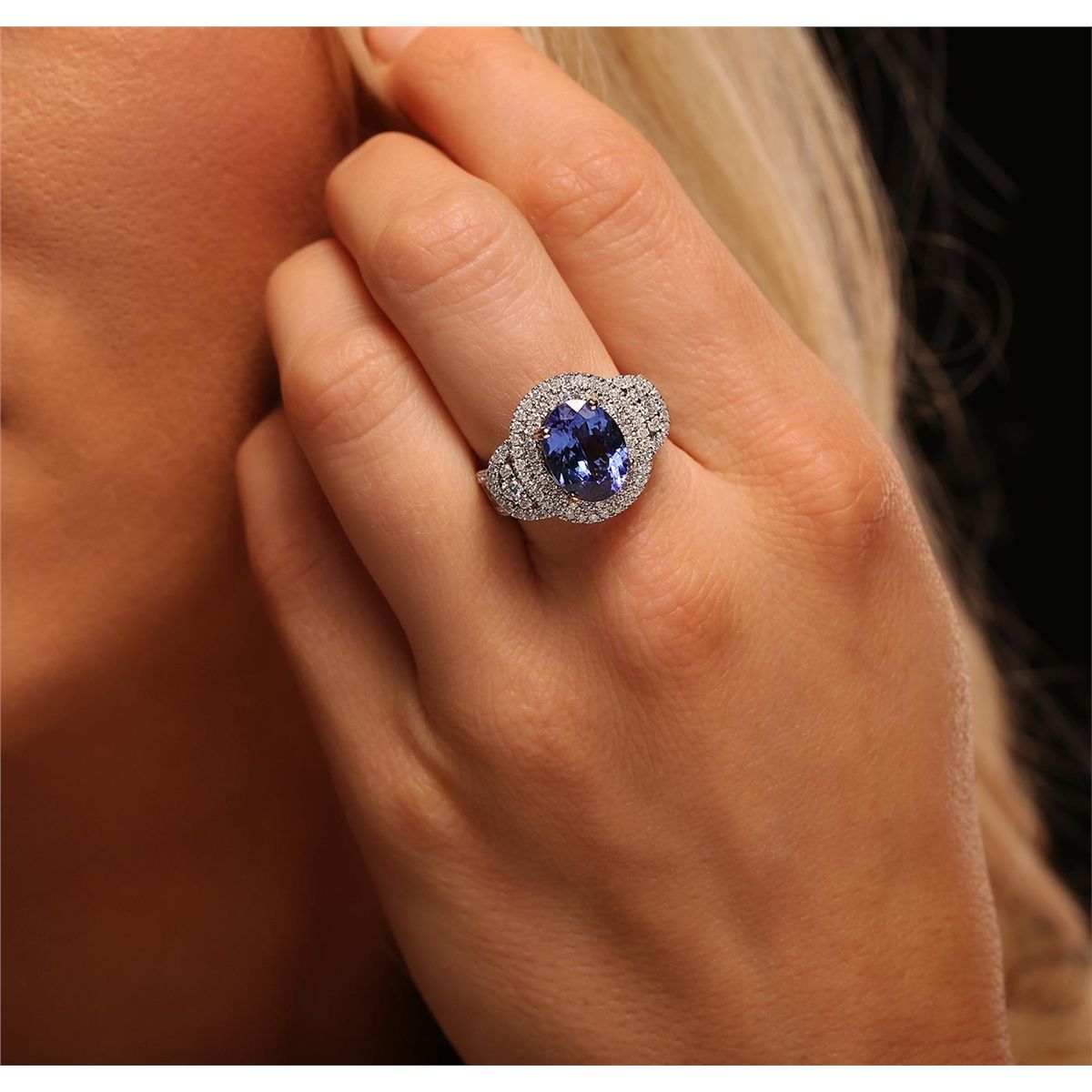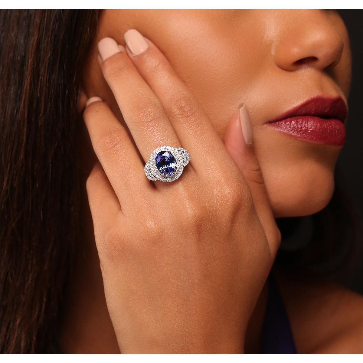 One electronically tested 14KT white gold Ladies combination cast & assembled ring with a bright polish finish. Condition is new. Identified with markings of "14K". Containing: One Hundred Eight prong set round brilliant cut diamonds, measuring 1.30 - 1.20 x 0.75mm (depth est.) approximate. Total Weight of 108 Stones = 0.77ct. Clarity: I-1 to I-2. Color: G, Cut is Good. Two prong set round brilliant cut diamonds, measuring 2.40 - 2.40 x 1.44mm (depth est.) approximate. Total Weight of 2 Stones = 0.10ct. Clarity: SI-1 to SI-2. Color: H - I, Cut is Good. Twenty invisible set princess cut diamonds, measuring 1.60 x 1.60 x 1.20mm (depth est.) approximate. Total Weight of 20 Stones = 0.50ct. Clarity: SI-1 to SI-2. Color: H - I, Cut is Good. One prong set oval modified mixed cut natural tanzanite, measuring 12.00 x 8.00 x 5.20mm, approximate weight of 3.95ct., clarity is eye clean, type I, medium, moderately strong, bluish violet color, (GIA bV 5/4), cut is very good. Colored gemstones are presumed to have been subjected to commonly used color/clarity enhancement processes. Total Weight of Colored Stones 3.95ct. Total Weight of Diamonds 1.37ct. Total Weight of Ring 7.90 grams. GGL Appraised at $10,630.00.
