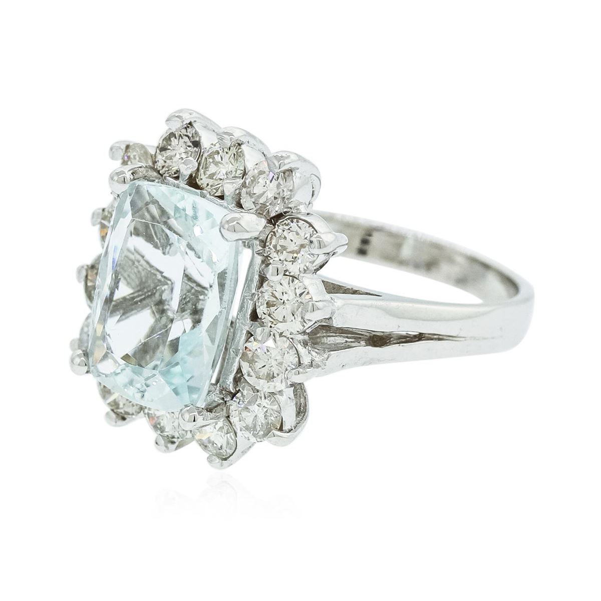 One electronically tested 14KT white gold ladies cast aquamarine and diamond ring with a bright polish finish. Condition is new, good workmanship. The featured aquamarine is set within a diamond bezel, supported by split shoulders and completed by a two and one-half millimeter wide band. Identified with markings of "14K". Containing: One prong set rectangular cushion mixed cut natural aquamarine, measuring 11.70 x 8.60 x 5.70mm, 8%. bulge factor, approximate weight of 3.96ct., clarity is eye clean, type I, medium light, very slightly grayish, very slightly greenish blue color, (GIA vslgB 4/3), cut is good. Transmitting light with no distortion, transparent. Refractive index testing results of 1.56 to 1.57. This is a conclusive result for Aquamarine (Beryl). Graded in the setting. Fourteen prong set round brilliant cut diamonds, measuring 3.30 - 3.10 x 1.92mm (depth est.) approximate. Total Weight of 14 Stones = 1.77ct. Graded in the setting. Clarity: SI-1 to I-1. Color: H - J. Total Weight of Colored Stones 3.96ct. Total Weight of Diamonds 1.77ct. Total Weight of Ring 7.10 grams. AIG Appraised at $7,615.00.