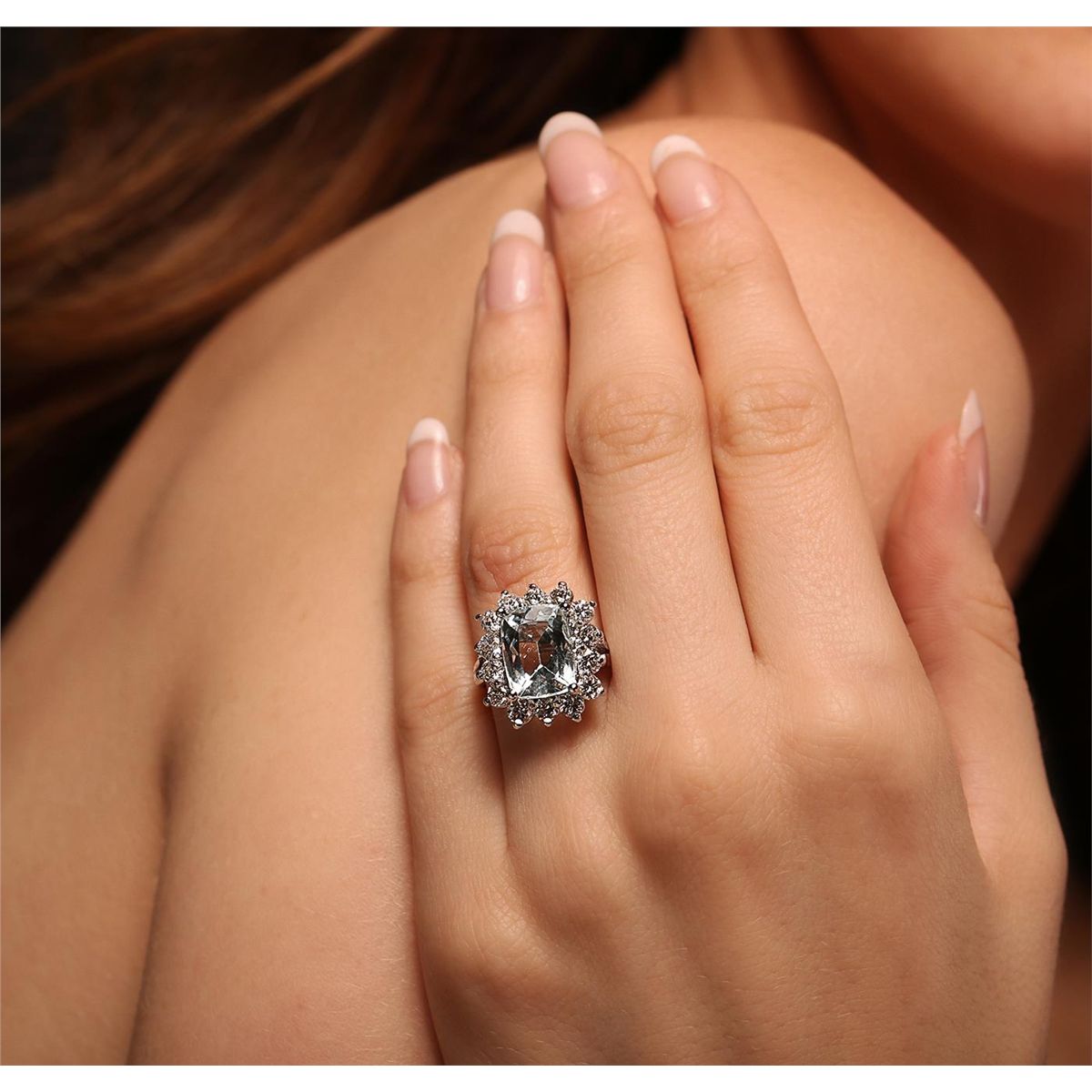 One electronically tested 14KT white gold ladies cast aquamarine and diamond ring with a bright polish finish. Condition is new, good workmanship. The featured aquamarine is set within a diamond bezel, supported by split shoulders and completed by a two and one-half millimeter wide band. Identified with markings of "14K". Containing: One prong set rectangular cushion mixed cut natural aquamarine, measuring 11.70 x 8.60 x 5.70mm, 8%. bulge factor, approximate weight of 3.96ct., clarity is eye clean, type I, medium light, very slightly grayish, very slightly greenish blue color, (GIA vslgB 4/3), cut is good. Transmitting light with no distortion, transparent. Refractive index testing results of 1.56 to 1.57. This is a conclusive result for Aquamarine (Beryl). Graded in the setting. Fourteen prong set round brilliant cut diamonds, measuring 3.30 - 3.10 x 1.92mm (depth est.) approximate. Total Weight of 14 Stones = 1.77ct. Graded in the setting. Clarity: SI-1 to I-1. Color: H - J. Total Weight of Colored Stones 3.96ct. Total Weight of Diamonds 1.77ct. Total Weight of Ring 7.10 grams. AIG Appraised at $7,615.00.