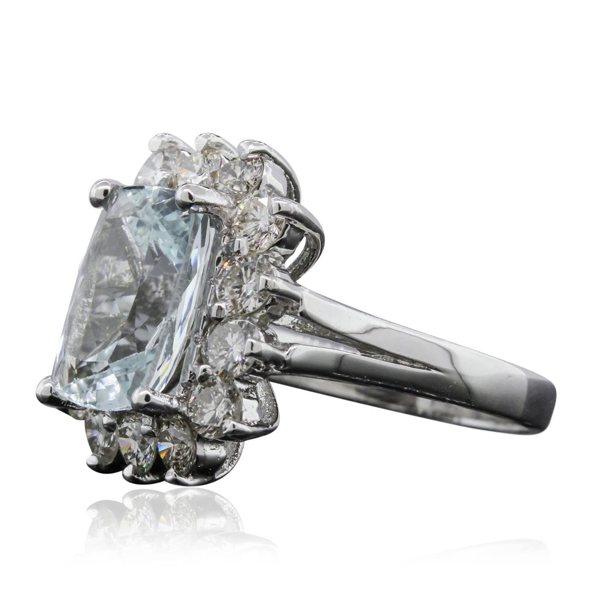One electronically tested 14KT white gold ladies cast aquamarine and diamond ring with a bright polish finish. Condition is new, good workmanship. The featured aquamarine is set within a diamond bezel, supported by split shoulders and completed by a two and one-half millimeter wide band. Identified with markings of "14K". Containing: One prong set rectangular cushion mixed cut natural aquamarine, measuring 11.70 x 8.60 x 5.70mm, 8%. bulge factor, approximate weight of 3.96ct., clarity is eye clean, type I, medium light, very slightly grayish, very slightly greenish blue color, (GIA vslgB 4/3), cut is good. Transmitting light with no distortion, transparent. Refractive index testing results of 1.56 to 1.57. This is a conclusive result for Aquamarine (Beryl). Graded in the setting. Fourteen prong set round brilliant cut diamonds, measuring 3.30 - 3.10 x 1.92mm (depth est.) approximate. Total Weight of 14 Stones = 1.77ct. Graded in the setting. Clarity: SI-1 to I-1. Color: H - J. Total Weight of Colored Stones 3.96ct. Total Weight of Diamonds 1.77ct. Total Weight of Ring 7.10 grams. AIG Appraised at $7,615.00.