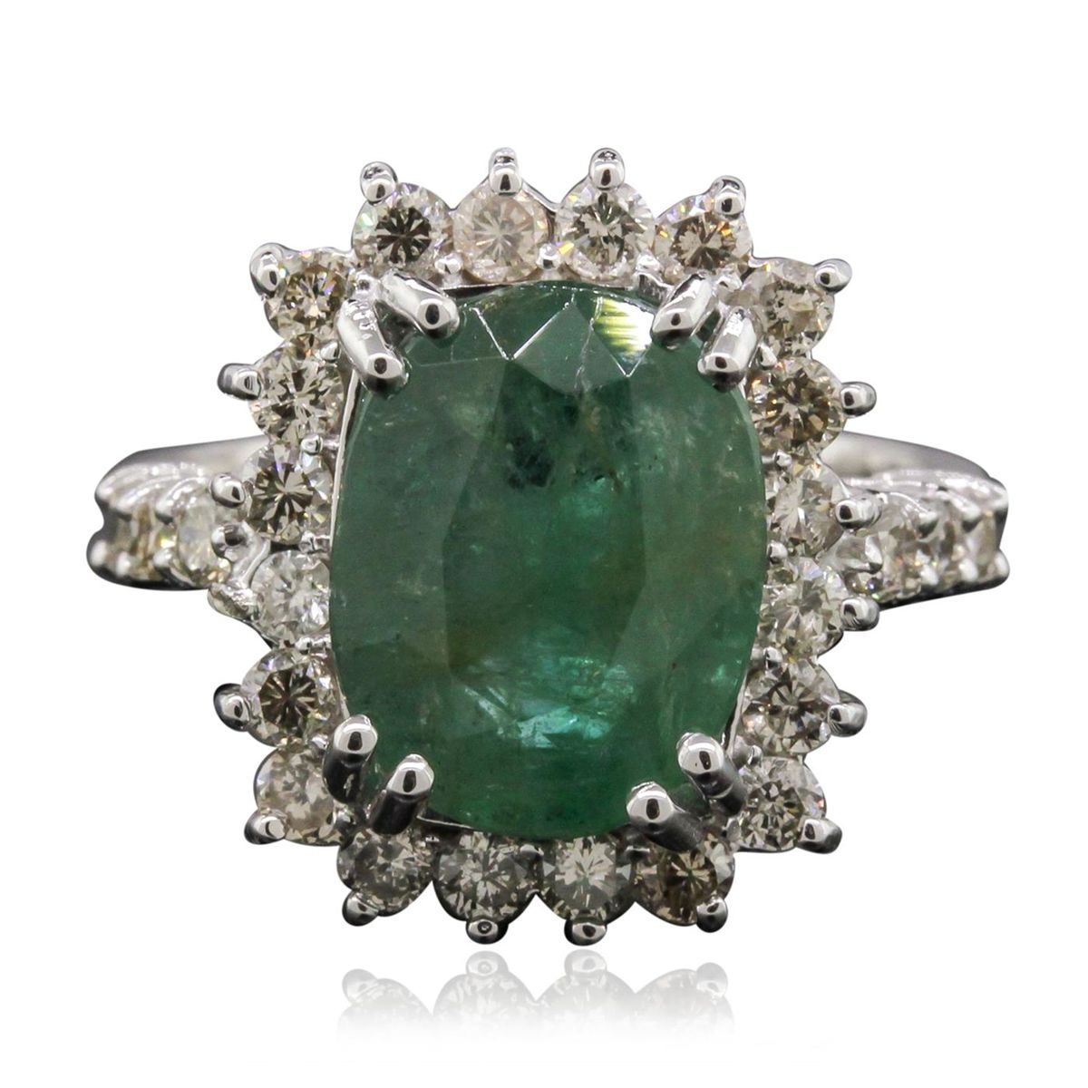One electronically tested 14KT white gold Ladies combination cast & assembled ring with a bright polish finish. Identified with markings of "K14". Condition is new. Containing: One prong set oval modified mixed cut natural emerald, measuring 12.00 x 9.50 x 6.30mm, approximate weight of 3.96ct., clarity is heavily included, type III, medium, very slightly grayish, green color, (GIA G 5/3), cut is good. Colored gemstones are presumed to have been subjected to commonly used color/clarity enhancement processes. Twenty-Six prong set round brilliant cut diamonds, measuring 2.00 - 2.00 x 1.20mm (depth est.) approximate. Total Weight of 26 Stones = 0.76ct. Clarity: I-1 to I-2. Color: I - J, Cut is Good. Total Weight of Colored Stones 3.96ct. Total Weight of Diamonds 0.76ct. Total Weight of Ring 9.40 grams. GGL Appraised at $10,770.00.