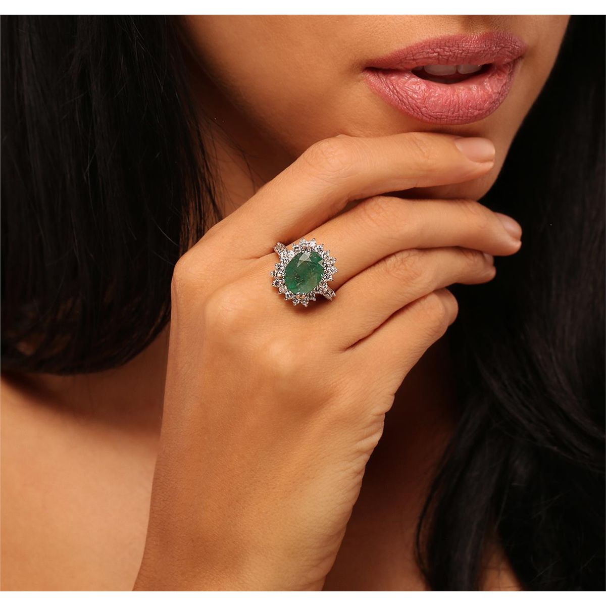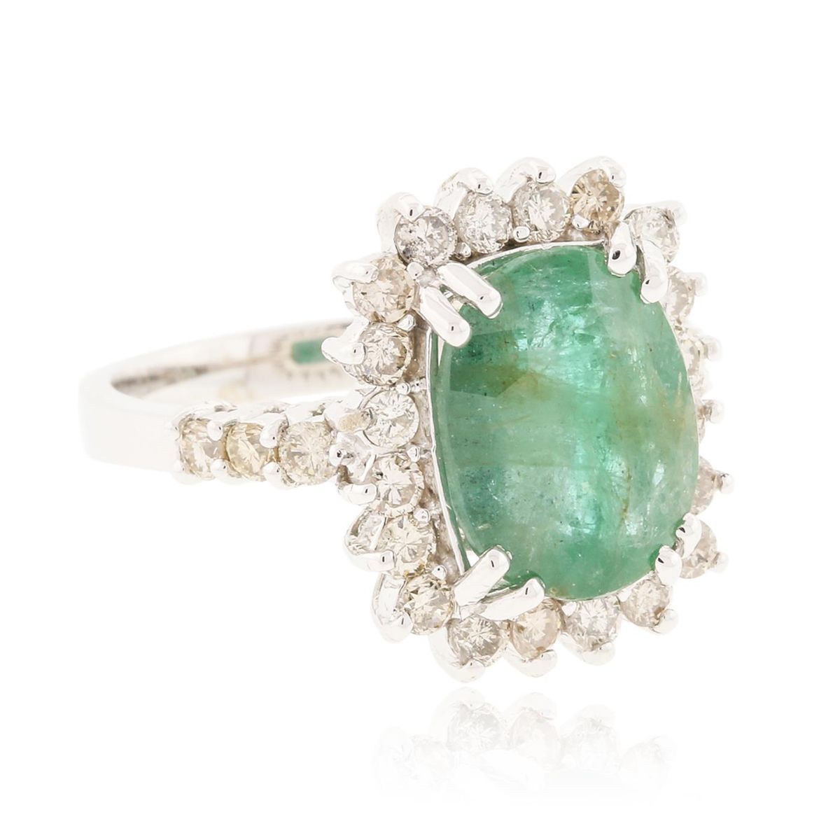 One electronically tested 14KT white gold Ladies combination cast & assembled ring with a bright polish finish. Identified with markings of "K14". Condition is new. Containing: One prong set oval modified mixed cut natural emerald, measuring 12.00 x 9.50 x 6.30mm, approximate weight of 3.96ct., clarity is heavily included, type III, medium, very slightly grayish, green color, (GIA G 5/3), cut is good. Colored gemstones are presumed to have been subjected to commonly used color/clarity enhancement processes. Twenty-Six prong set round brilliant cut diamonds, measuring 2.00 - 2.00 x 1.20mm (depth est.) approximate. Total Weight of 26 Stones = 0.76ct. Clarity: I-1 to I-2. Color: I - J, Cut is Good. Total Weight of Colored Stones 3.96ct. Total Weight of Diamonds 0.76ct. Total Weight of Ring 9.40 grams. GGL Appraised at $10,770.00.