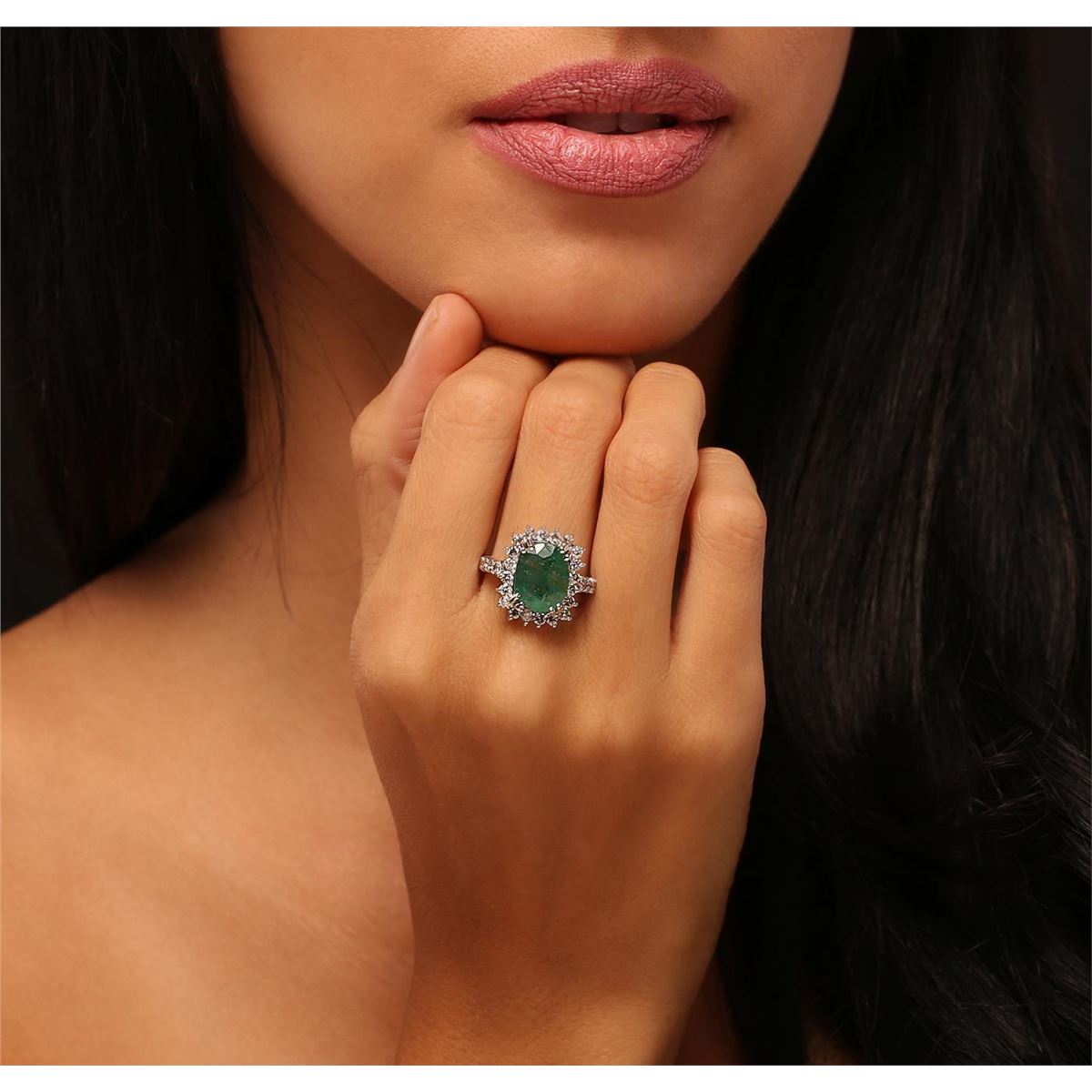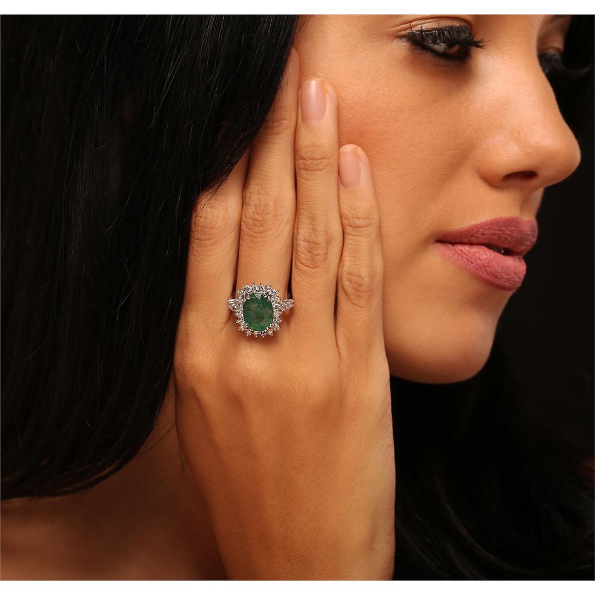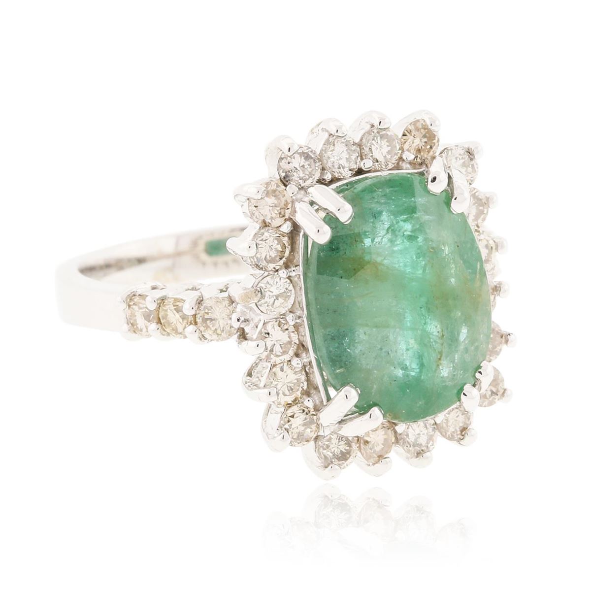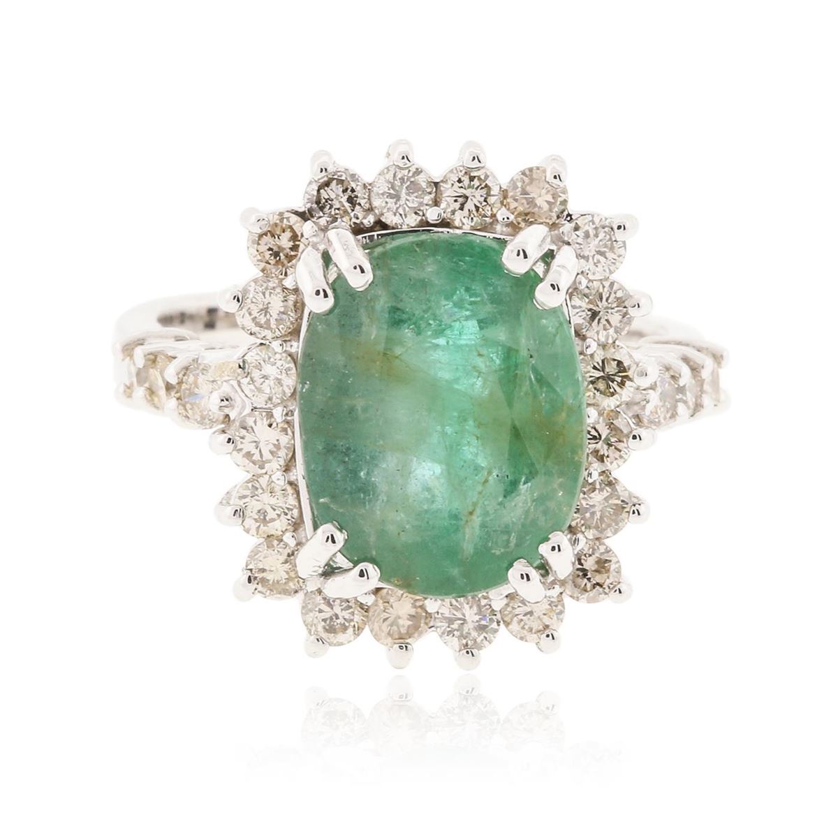 One electronically tested 14KT white gold Ladies combination cast & assembled ring with a bright polish finish. Identified with markings of "K14". Condition is new. Containing: One prong set oval modified mixed cut natural emerald, measuring 12.00 x 9.50 x 6.30mm, approximate weight of 3.96ct., clarity is heavily included, type III, medium, very slightly grayish, green color, (GIA G 5/3), cut is good. Colored gemstones are presumed to have been subjected to commonly used color/clarity enhancement processes. Twenty-Six prong set round brilliant cut diamonds, measuring 2.00 - 2.00 x 1.20mm (depth est.) approximate. Total Weight of 26 Stones = 0.76ct. Clarity: I-1 to I-2. Color: I - J, Cut is Good. Total Weight of Colored Stones 3.96ct. Total Weight of Diamonds 0.76ct. Total Weight of Ring 9.40 grams. GGL Appraised at $10,770.00.