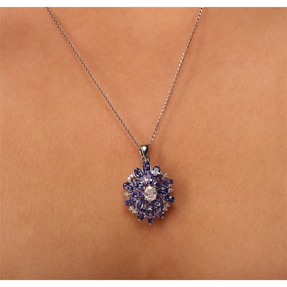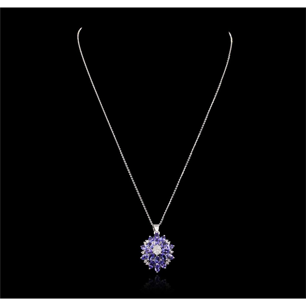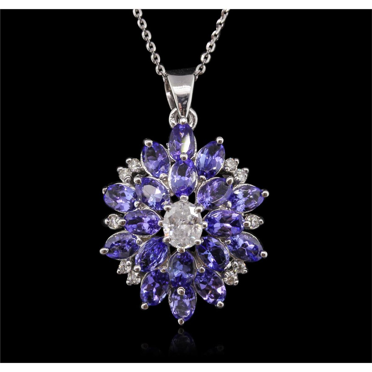 One electronically tested 14KT white gold ladies cast & assembled tanzanite and diamond pendant with chain. Condition is new, good workmanship. The pendant features a tanzanite and diamond floret completed by a white gold bail. The pendant is supported by an eighteen inch length 14KT white gold designer style chain terminating in a spring ring clasp. Bright polish finish. Identified with markings of "14K". Containing: One prong set oval shaped cut diamond, measuring 5.60 x 4.60 x 2.90mm (depth est.) approximate weight of 0.51ct with a strong blue fluorescence. Graded in the setting. Clarity: I-1. Color: Depth 63.0%. Table 60.9%. Eighteen prong set oval mixed cut natural tanzanites, measuring 5.00 x 3.00 x 1.95mm, approximate total weight of 3.96ct., clarity is eye clean, type I, medium dark, moderately strong, bluish violet color, (GIA bV 6/4), cut is good. Transmitting light with no distortion, transparent. Graded in the setting. Tanzanite is a very rare gemstone that is only found in the country of Tanzania. Originally discovered in 1967. Tiffany & Company, named the stone Tanzanite. It is found in the Usumburu Mountains that border the Umba Valley of northern Tanzania. Tanzanite occurs in gray, brown, violet, blue, reddish-purple, & green. The gem is interesting because of its exceptional pleochroism. Rotated in different directions a tanzanite will exhibit multiple changes of color. Tanzanite has a low tolerance to ultrasonic cleaning, and should not be cleaned using this method. Ten prong set round brilliant cut diamonds, measuring 1.50 - 1.50 x 0.90mm (depth est.) approximate total weight of 10 Stones = 0.18ct. Graded in the setting. Clarity: SI-2 to I-1. Color: F - H. Total Weight of Colored Stones 3.96ct. Total Weight of Diamonds 0.69ct. Total Weight of Pendant With Chain 8.10 grams. AIG Appraised at $8,030.00.