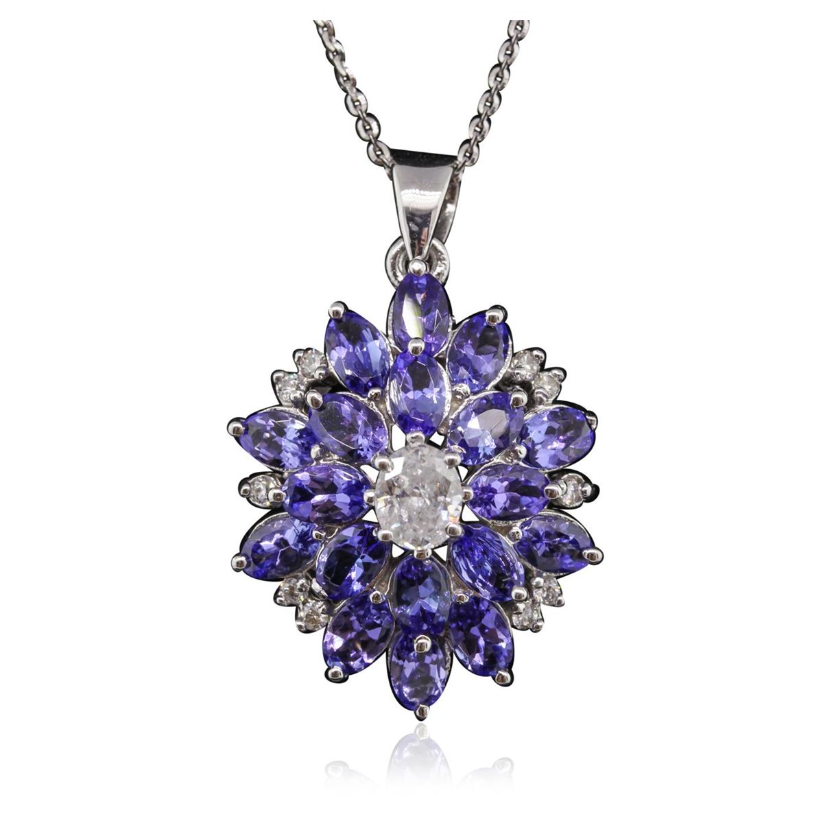 One electronically tested 14KT white gold ladies cast & assembled tanzanite and diamond pendant with chain. Condition is new, good workmanship. The pendant features a tanzanite and diamond floret completed by a white gold bail. The pendant is supported by an eighteen inch length 14KT white gold designer style chain terminating in a spring ring clasp. Bright polish finish. Identified with markings of "14K". Containing: One prong set oval shaped cut diamond, measuring 5.60 x 4.60 x 2.90mm (depth est.) approximate weight of 0.51ct with a strong blue fluorescence. Graded in the setting. Clarity: I-1. Color: Depth 63.0%. Table 60.9%. Eighteen prong set oval mixed cut natural tanzanites, measuring 5.00 x 3.00 x 1.95mm, approximate total weight of 3.96ct., clarity is eye clean, type I, medium dark, moderately strong, bluish violet color, (GIA bV 6/4), cut is good. Transmitting light with no distortion, transparent. Graded in the setting. Tanzanite is a very rare gemstone that is only found in the country of Tanzania. Originally discovered in 1967. Tiffany & Company, named the stone Tanzanite. It is found in the Usumburu Mountains that border the Umba Valley of northern Tanzania. Tanzanite occurs in gray, brown, violet, blue, reddish-purple, & green. The gem is interesting because of its exceptional pleochroism. Rotated in different directions a tanzanite will exhibit multiple changes of color. Tanzanite has a low tolerance to ultrasonic cleaning, and should not be cleaned using this method. Ten prong set round brilliant cut diamonds, measuring 1.50 - 1.50 x 0.90mm (depth est.) approximate total weight of 10 Stones = 0.18ct. Graded in the setting. Clarity: SI-2 to I-1. Color: F - H. Total Weight of Colored Stones 3.96ct. Total Weight of Diamonds 0.69ct. Total Weight of Pendant With Chain 8.10 grams. AIG Appraised at $8,030.00.