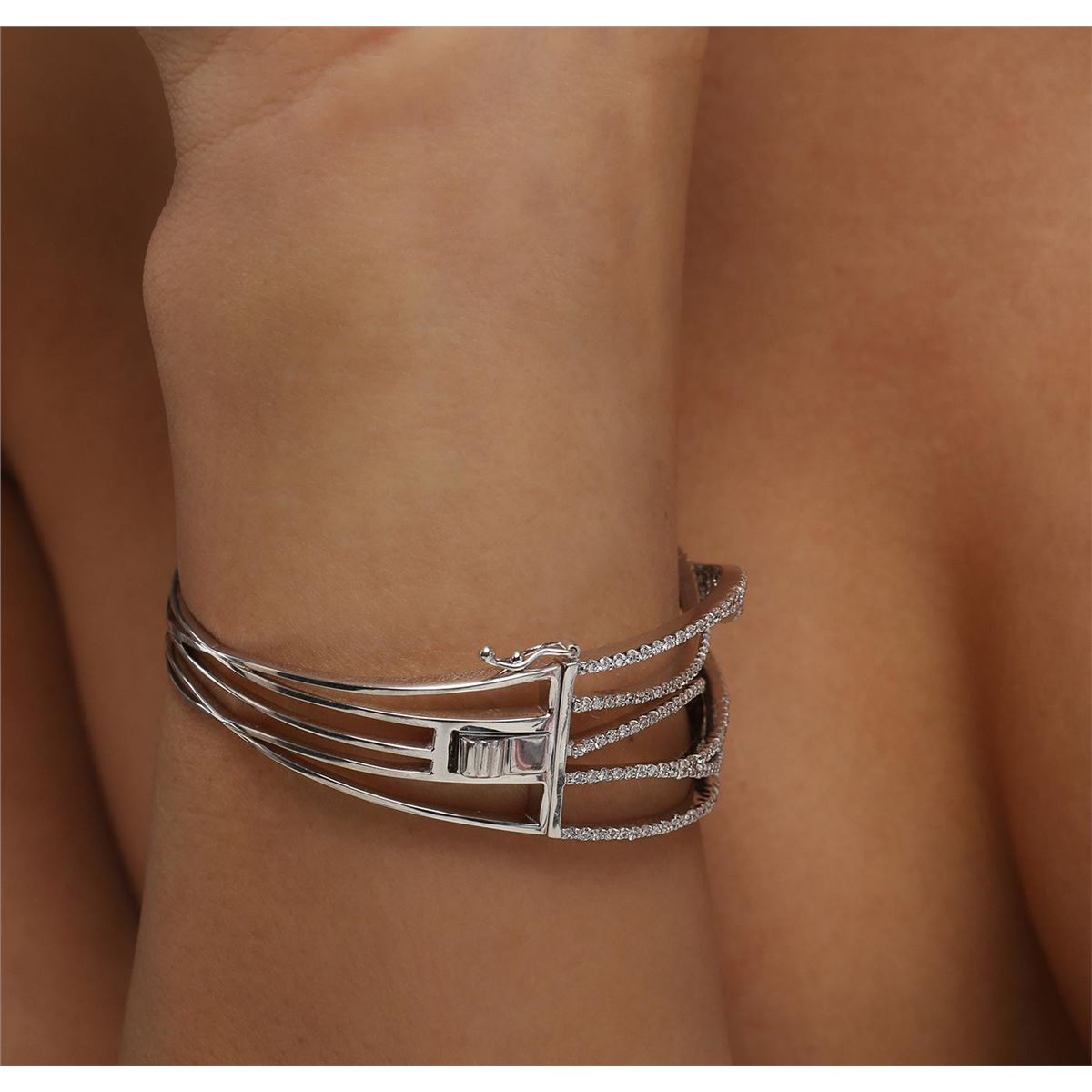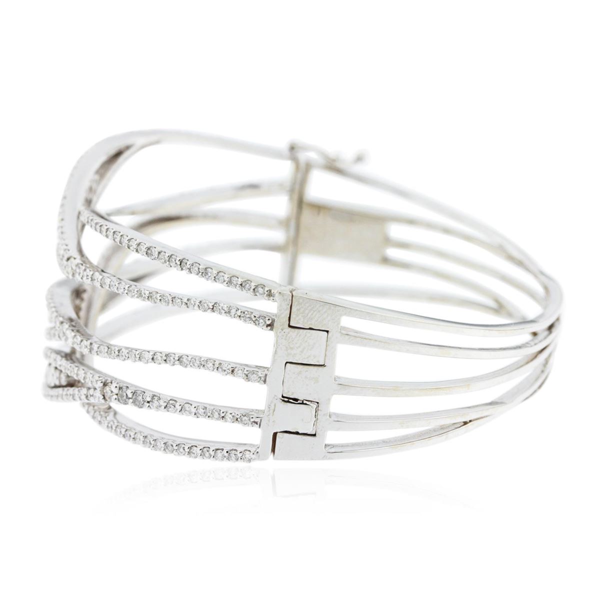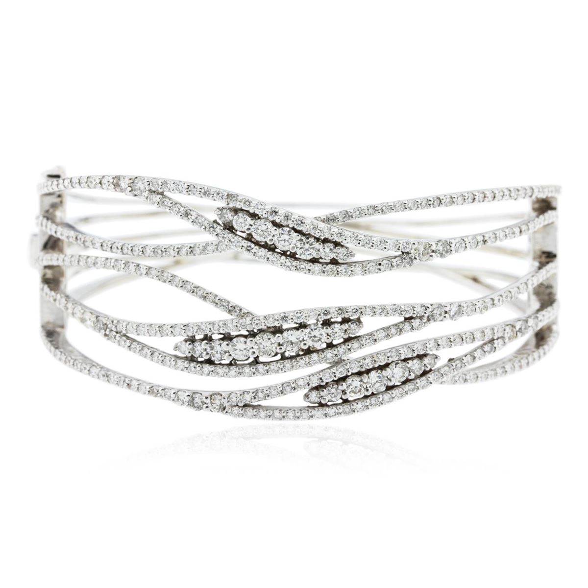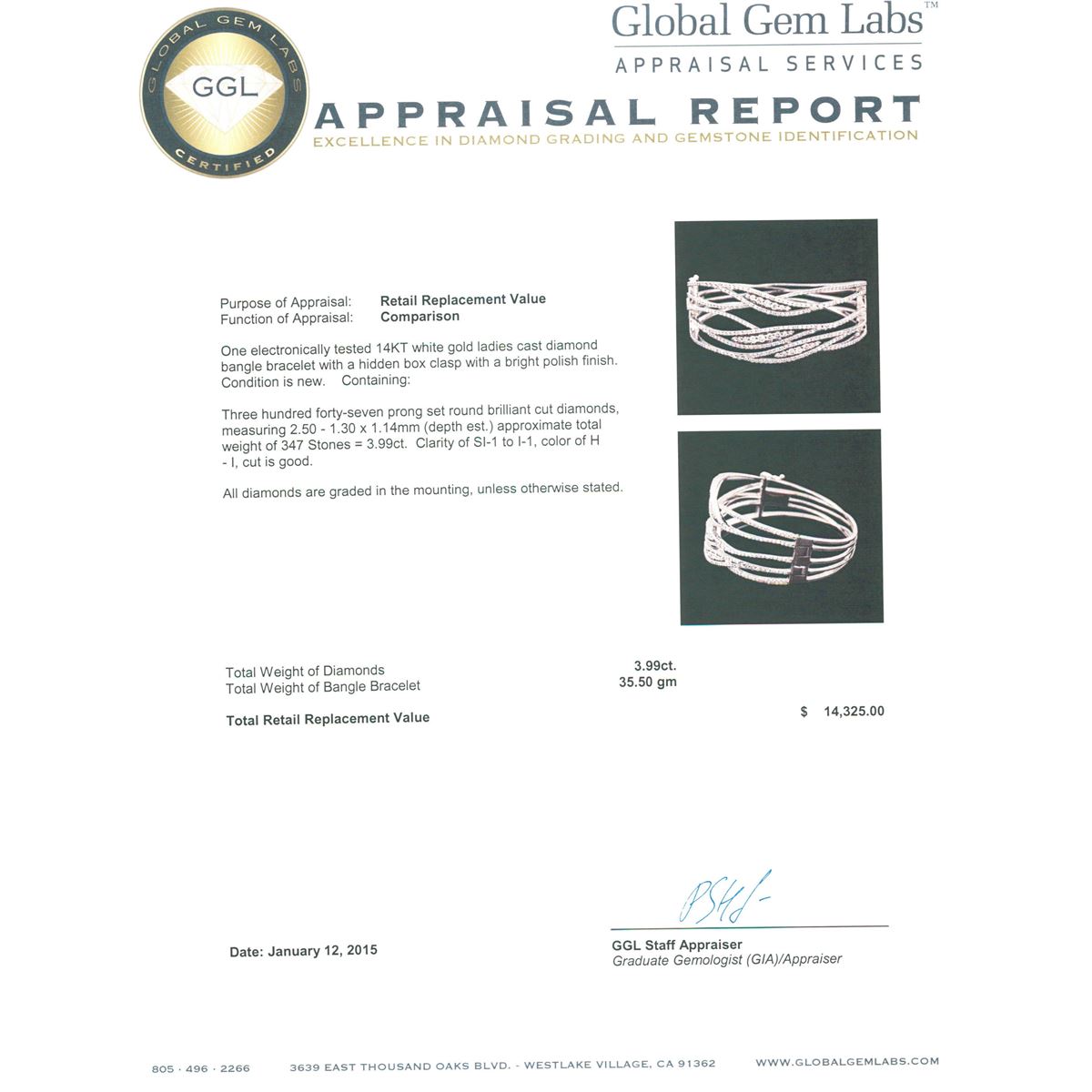 One electronically tested 14KT white gold ladies cast diamond bangle bracelet with a hidden box clasp with a bright polish finish. Condition is new. Containing: Three Hundred Forty-Seven prong set round brilliant cut diamonds, measuring 2.50 - 1.30 x 1.14mm (depth est.) approximate total weight of 347 Stones = 3.99ct. Clarity: SI-1 to I-1. Color: H - I, Cut is Good. All diamonds are graded in the mounting, unless otherwise stated. Total Weight of Diamonds 3.99ct. Total Weight of Bangle Bracelet 35.50 grams. GGL Appraised at $14,325.00.