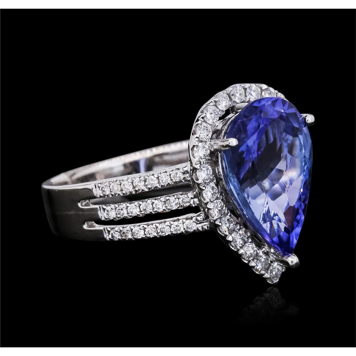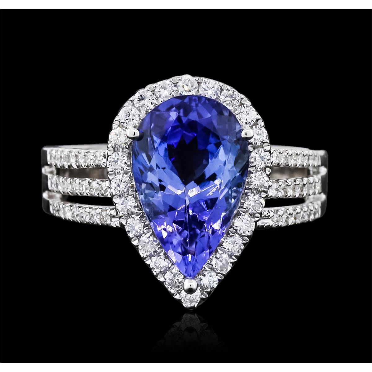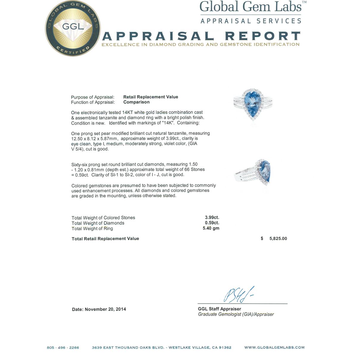 One electronically tested 14KT white gold ladies combination cast & assembled tanzanite and diamond ring with a bright polish finish. Identified with markings of "14K". Condition is new. Containing: One prong set pear modified brilliant cut natural tanzanite, measuring 12.50 x 8.12 x 5.87mm, approximate weight of 3.99ct., clarity is eye clean, type I, medium, moderately strong, violet color, (GIA V 5/4), cut is good. Sixty-Six prong set round brilliant cut diamonds, measuring 1.50 - 1.20 x 0.81mm (depth est.) approximate total weight of 66 Stones = 0.59ct. Clarity: SI-1 to SI-2. Color: I - J, Cut is Good. Colored gemstones are presumed to have been subjected to commonly used enhancement processes. All diamonds and colored gemstones are graded in the mounting, unless otherwise stated. Total Weight of Colored Stones 3.99ct. Total Weight of Diamonds 0.59ct. Total Weight of Ring 5.40 grams. GGL Appraised at $5,825.00.