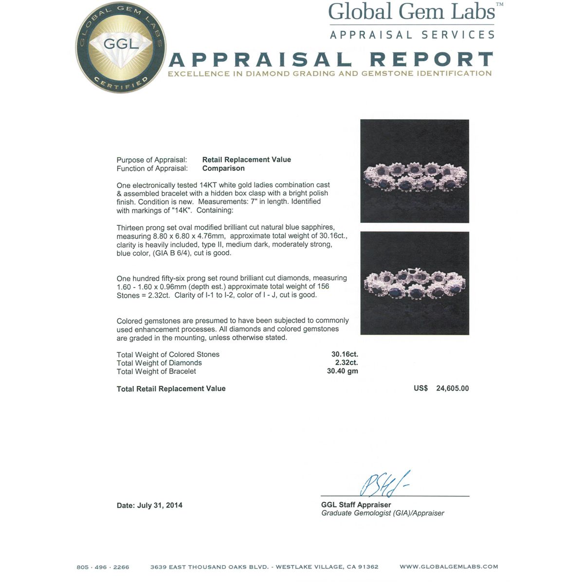 One electronically tested 14KT white gold ladies combination cast & assembled bracelet with a hidden box clasp with a bright polish finish. Condition is new. Measurements: 7" in length. Identified with markings of "14K". Containing: Thirteen prong set oval modified brilliant cut natural blue sapphires, measuring 8.80 x 6.80 x 4.76mm, approximate. Total Weight of 30.16ct., clarity is heavily included, type II, medium dark, moderately strong, blue color, (GIA B 6/4), cut is good. One Hundred Fifty-Six prong set round brilliant cut diamonds, measuring 1.60 - 1.60 x 0.96mm (depth est.) approximate. Total Weight of 156 Stones = 2.32ct. Clarity: I-1 to I-2. Color: I - J, Cut is Good. Colored gemstones are presumed to have been subjected to commonly used enhancement processes. All diamonds and colored gemstones are graded in the mounting, unless otherwise stated. Total Weight of Colored Stones 30.16ct. Total Weight of Diamonds 2.32ct. Total Weight of Bracelet 30.40 grams. GGL Appraised at $24,605.00.
