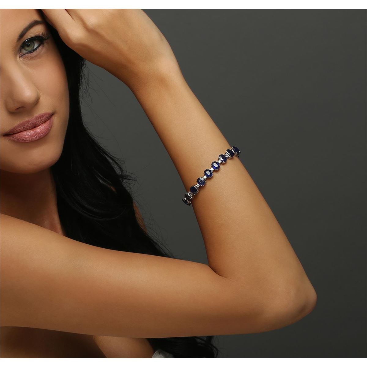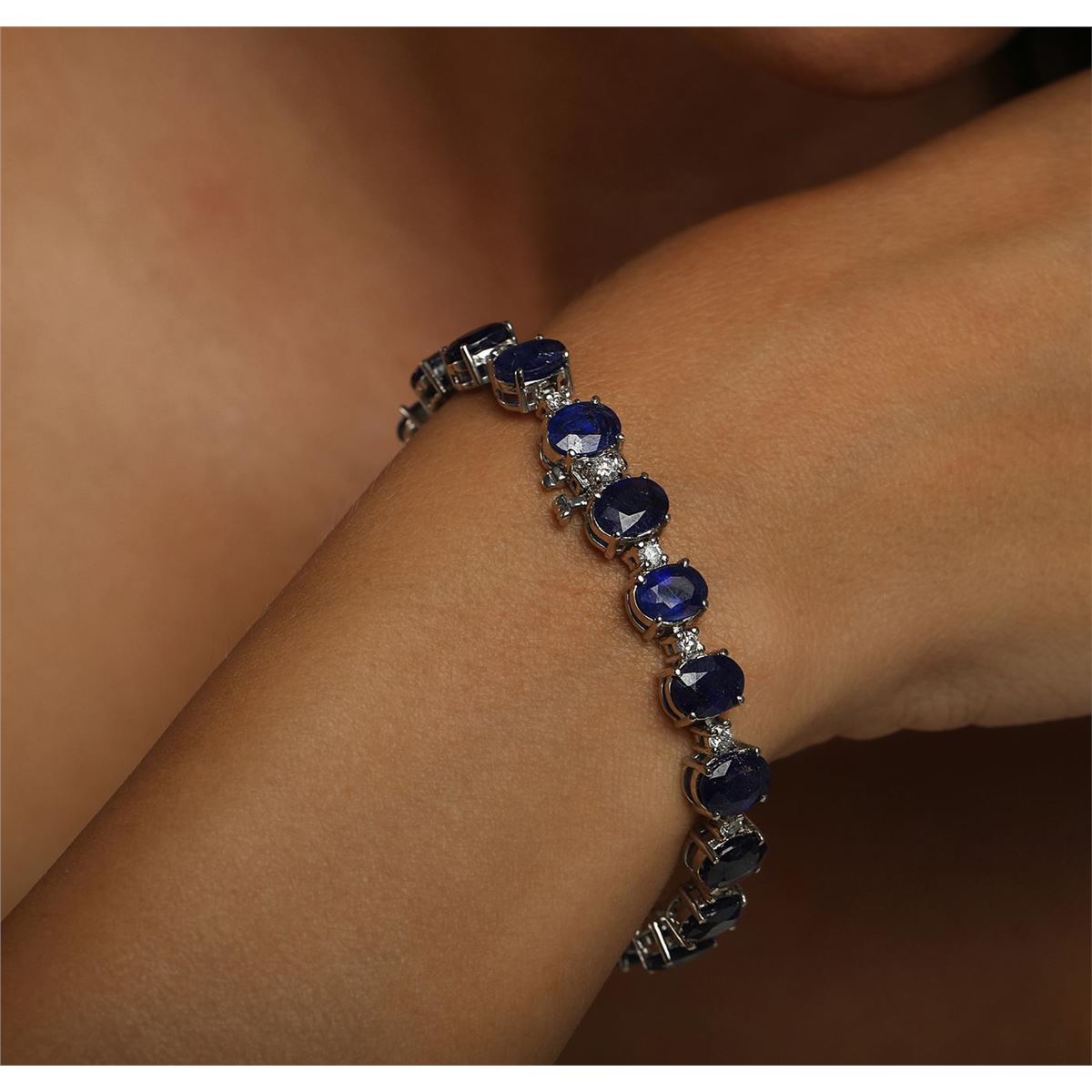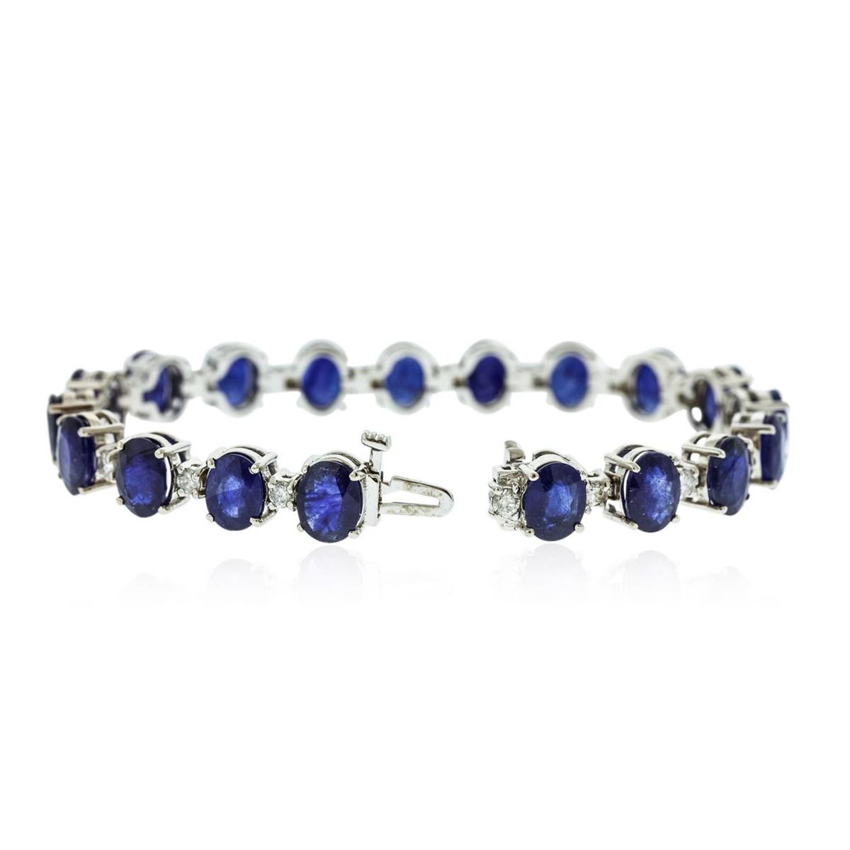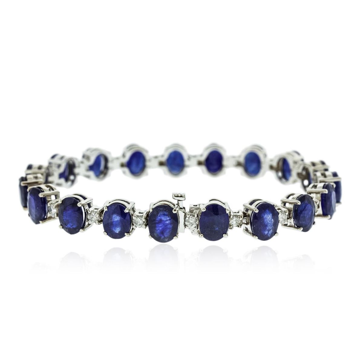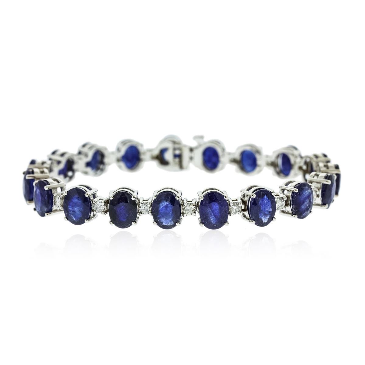 One electronically tested 14KT white gold ladies combination cast & assembled bracelet with a hidden box clasp with a bright polish finish. Measurements: 6.85" in length. Identified with markings of "14K". Condition is new. Containing: Nineteen prong set oval modified brilliant cut natural blue sapphires, measuring 7.90 x 5.90 x 4.17mm, approximate total weight of 30.21ct., clarity is heavily included, type II, medium dark, moderately strong, blue color, (GIA B 6/4), cut is good. Nineteen prong set round brilliant cut diamonds, measuring 2.50 - 2.50 x 1.50mm (depth est.) approximate total weight of 19 Stones = 1.09ct. Clarity: I-1 to I-2. Color: I - J, Cut is Good. Colored gemstones are presumed to have been subjected to commonly used enhancement processes. All diamonds and colored gemstones are graded in the mounting, unless otherwise stated. Total Weight of Colored Stones 30.21ct. Total Weight of Diamonds 1.09ct. Total Weight of Bracelet 22.50 grams. GGL Appraised at $14,270.00.