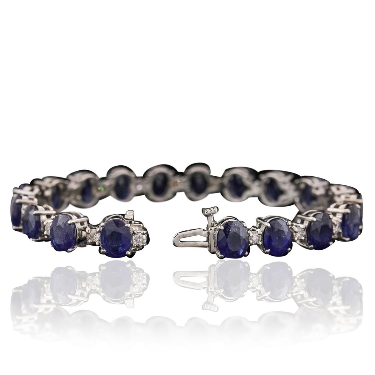 One electronically tested 14KT white gold ladies combination cast & assembled bracelet with a hidden box clasp with a bright polish finish. Measurements: 6.85" in length. Identified with markings of "14K". Condition is new. Containing: Nineteen prong set oval modified brilliant cut natural blue sapphires, measuring 7.90 x 5.90 x 4.17mm, approximate total weight of 30.21ct., clarity is heavily included, type II, medium dark, moderately strong, blue color, (GIA B 6/4), cut is good. Nineteen prong set round brilliant cut diamonds, measuring 2.50 - 2.50 x 1.50mm (depth est.) approximate total weight of 19 Stones = 1.09ct. Clarity: I-1 to I-2. Color: I - J, Cut is Good. Colored gemstones are presumed to have been subjected to commonly used enhancement processes. All diamonds and colored gemstones are graded in the mounting, unless otherwise stated. Total Weight of Colored Stones 30.21ct. Total Weight of Diamonds 1.09ct. Total Weight of Bracelet 22.50 grams. GGL Appraised at $14,270.00.