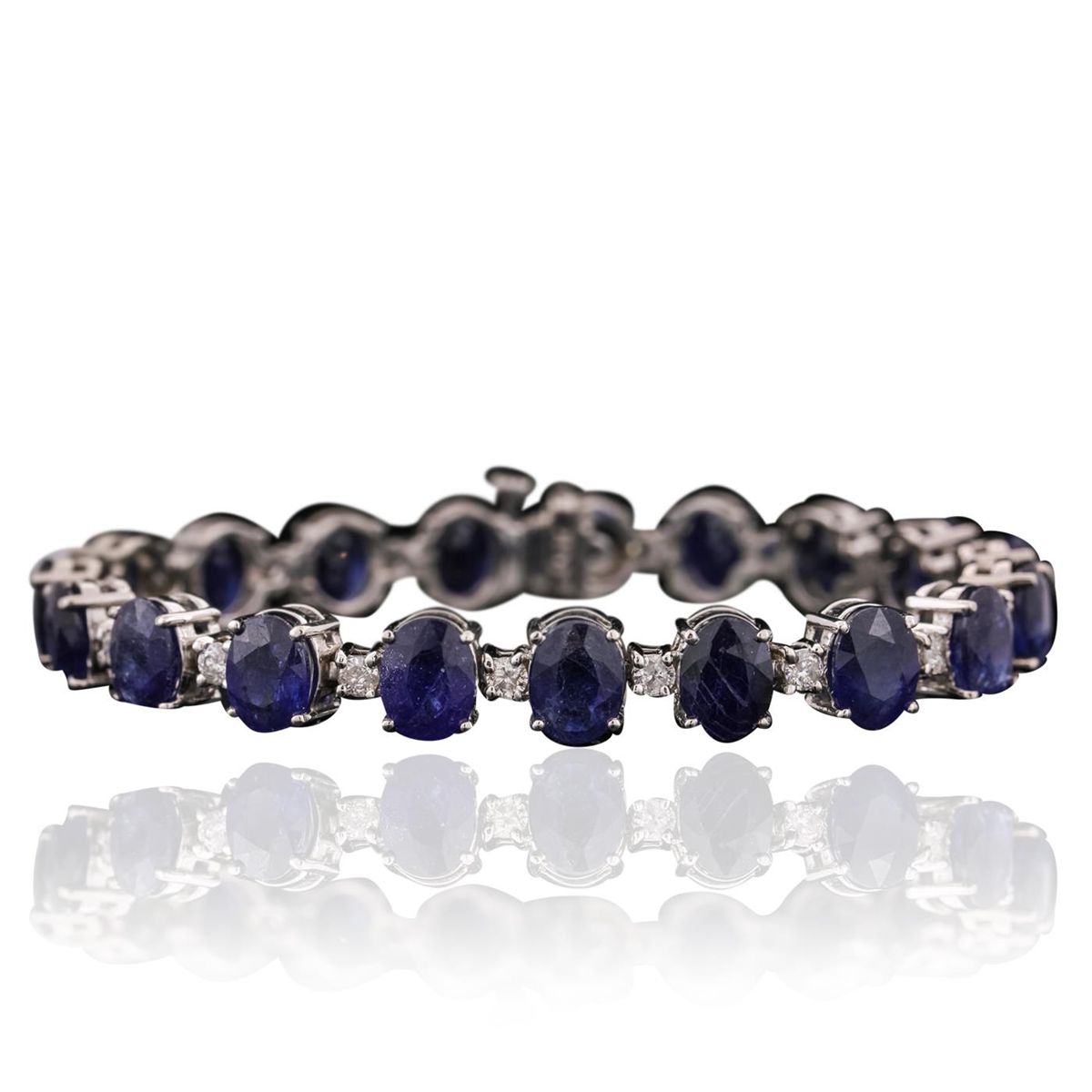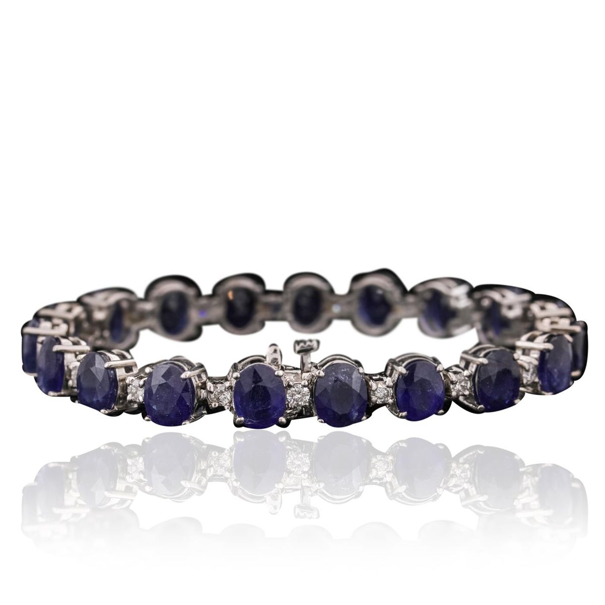 One electronically tested 14KT white gold ladies combination cast & assembled bracelet with a hidden box clasp with a bright polish finish. Measurements: 6.85" in length. Identified with markings of "14K". Condition is new. Containing: Nineteen prong set oval modified brilliant cut natural blue sapphires, measuring 7.90 x 5.90 x 4.17mm, approximate total weight of 30.21ct., clarity is heavily included, type II, medium dark, moderately strong, blue color, (GIA B 6/4), cut is good. Nineteen prong set round brilliant cut diamonds, measuring 2.50 - 2.50 x 1.50mm (depth est.) approximate total weight of 19 Stones = 1.09ct. Clarity: I-1 to I-2. Color: I - J, Cut is Good. Colored gemstones are presumed to have been subjected to commonly used enhancement processes. All diamonds and colored gemstones are graded in the mounting, unless otherwise stated. Total Weight of Colored Stones 30.21ct. Total Weight of Diamonds 1.09ct. Total Weight of Bracelet 22.50 grams. GGL Appraised at $14,270.00.