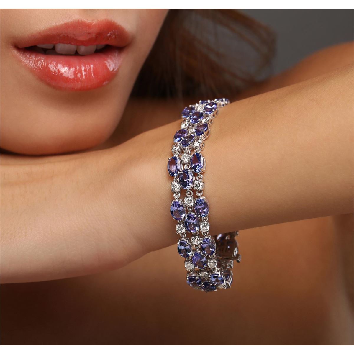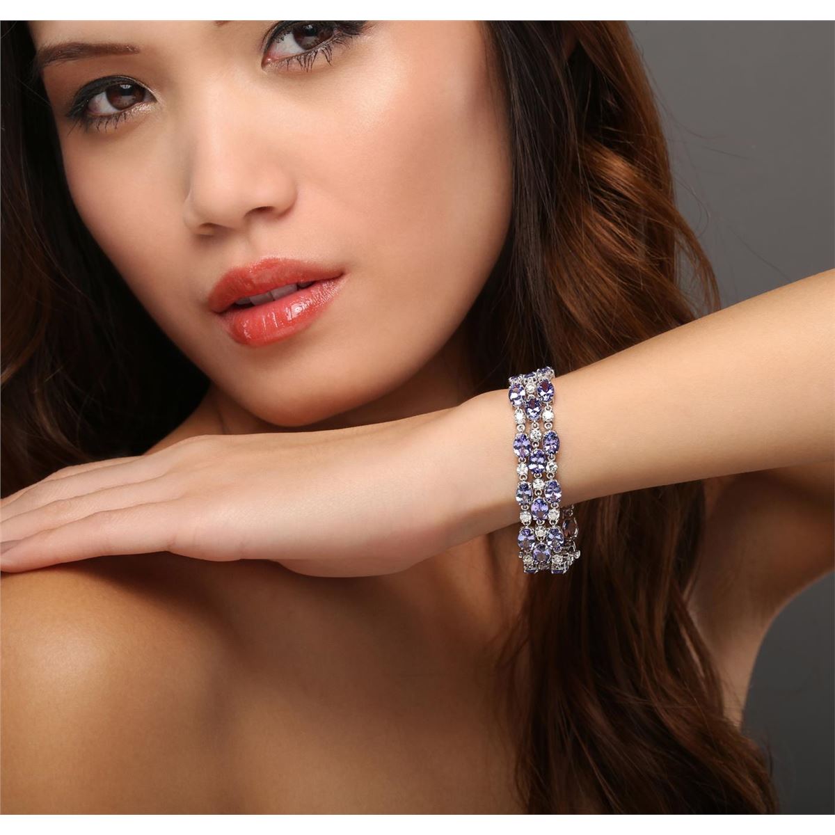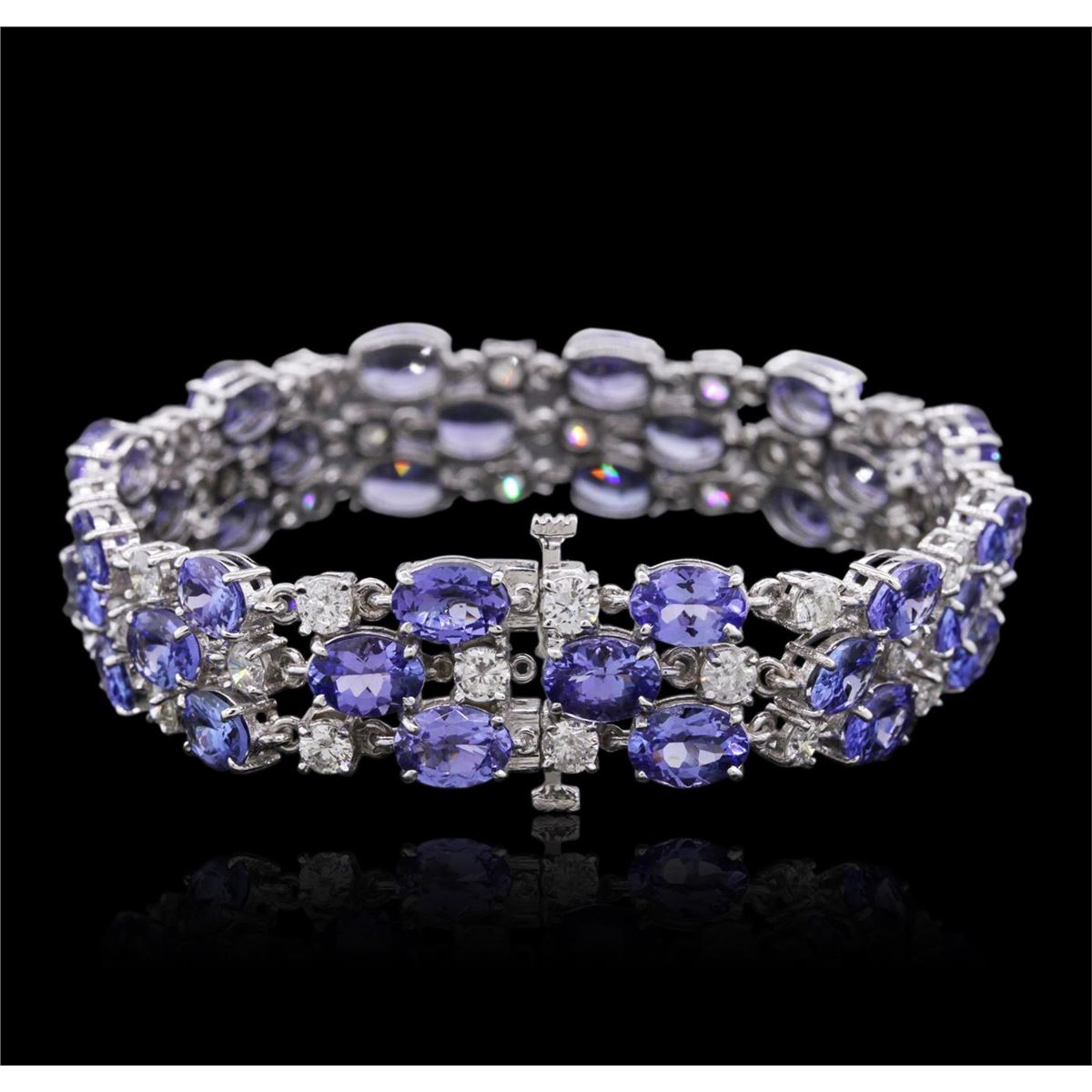 One electronically tested 14KT white gold ladies combination cast & assembled tanzanite and diamond bracelet with a hidden box clasp with a bright polish finish. Measurements: 7" in length. Condition is new. Containing: Thirty-six prong set oval modified brilliant cut natural tanzanites, measuring 7.00 x 5.00 x 3.50mm, approximate total weight of 30.24ct., clarity is eye clean, type I, medium light, very slightly grayish, violet color, (GIA V 4/3), cut is good. Thirty-Six prong set round brilliant cut diamonds, measuring 3.00 - 3.00 x 1.80mm (depth est.) approximate total weight of 36 Stones = 3.56ct. Clarity: SI-2 to I-1. Color: I - J, Cut is Good. Colored gemstones are presumed to have been subjected to commonly used enhancement processes. All diamonds and colored gemstones are graded in the mounting, unless otherwise stated. Total Weight of Colored Stones 30.24ct. Total Weight of Diamonds 3.56ct. Total Weight of Bracelet 24.80 grams. GGL Appraised at $23,210.00.