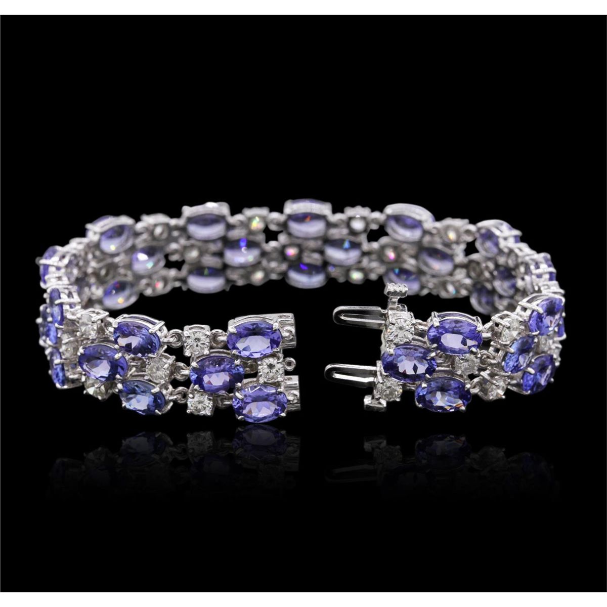 One electronically tested 14KT white gold ladies combination cast & assembled tanzanite and diamond bracelet with a hidden box clasp with a bright polish finish. Measurements: 7" in length. Condition is new. Containing: Thirty-six prong set oval modified brilliant cut natural tanzanites, measuring 7.00 x 5.00 x 3.50mm, approximate total weight of 30.24ct., clarity is eye clean, type I, medium light, very slightly grayish, violet color, (GIA V 4/3), cut is good. Thirty-Six prong set round brilliant cut diamonds, measuring 3.00 - 3.00 x 1.80mm (depth est.) approximate total weight of 36 Stones = 3.56ct. Clarity: SI-2 to I-1. Color: I - J, Cut is Good. Colored gemstones are presumed to have been subjected to commonly used enhancement processes. All diamonds and colored gemstones are graded in the mounting, unless otherwise stated. Total Weight of Colored Stones 30.24ct. Total Weight of Diamonds 3.56ct. Total Weight of Bracelet 24.80 grams. GGL Appraised at $23,210.00.