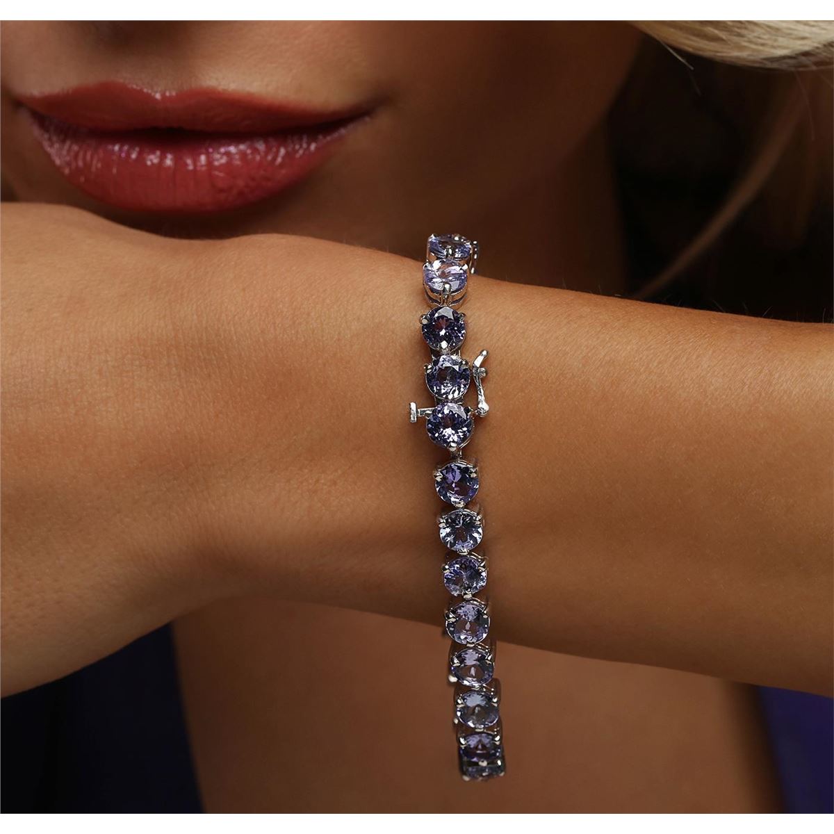 One electronically tested 14KT white gold ladies combination cast & assembled tanzanite bracelet with a hidden box clasp with a bright polish finish. Measurements: 7" in length. Identified with markings of "14K". Condition is new. Containing: Twenty-six prong set round modified brilliant cut natural tanzanites, measuring 6.50 - 6.35 x 4.18 mm, approximate total weight of 30.68ct., clarity is eye clean, type I, medium light, very slightly grayish, violet color, (GIA V 4/3), cut is good. Colored gemstones are presumed to have been subjected to commonly used enhancement processes. All colored gemstones are graded in the mounting, unless otherwise stated. Total Weight of Colored Stones 30.68ct. Total Weight of Bracelet 21.70 grams. GGL Appraised at $16,715.00.