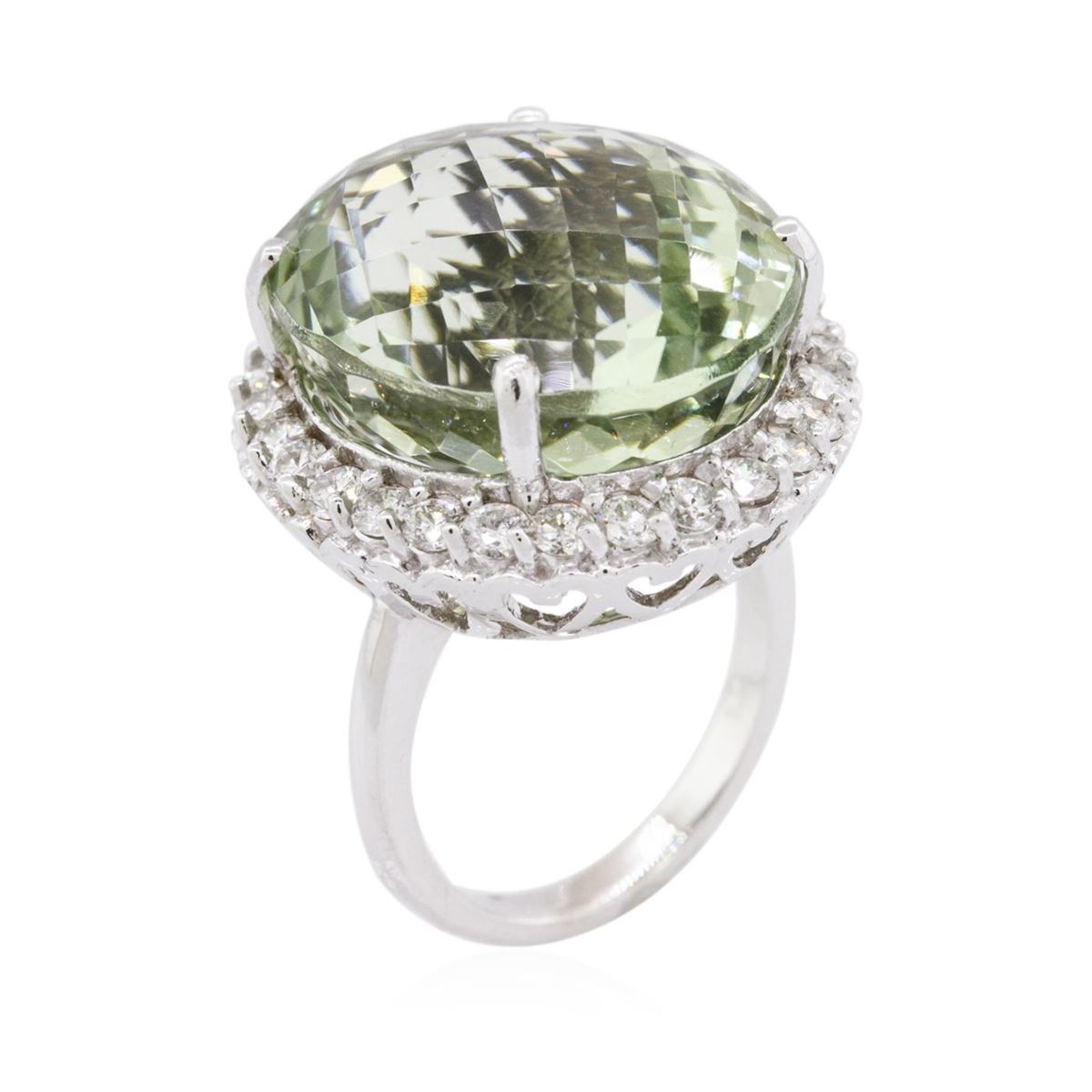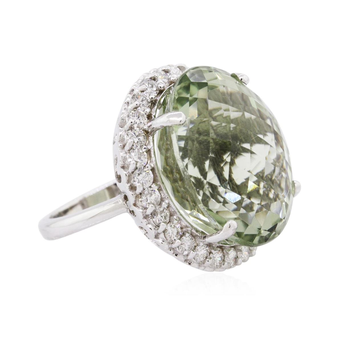One electronically tested 14KT white gold ladies cast green quartz and diamond ring with a bright polish finish. The featured green quartz is set within a diamond bezel supported by an open heart lattice under gallery, completed by a two and one-half millimeter wide band. Identified with markings of "14K". Condition is new, good workmanship. Containing: One prong set oval mixed cut natural green quartz, measuring 22.15 x 18.15 x 13.45mm, 6% bulge factor, approximate weight of 30.80ct., clarity is eye clean, medium dark, very slightly grayish, slightly yellowish green color, (GIA slyG 6/3), cut is good. Transmitting light with no distortion, transparent. Colored Stone Grading Report attached. Graded in the setting. Twenty-Eight prong set round brilliant cut diamonds, measuring 2.50 - 2.40 x 1.47mm (depth est.) approximate total weight of 28 Stones = 1.60ct. Graded in the setting. Clarity: VS-2 to SI-2. Color: F - H. Total Weight of Colored Stones 30.80ct. Total Weight of Diamonds 1.60ct. Total Weight of Ring 15.16 grams. AIG Appraised at $8,420.00.