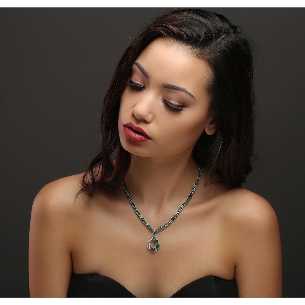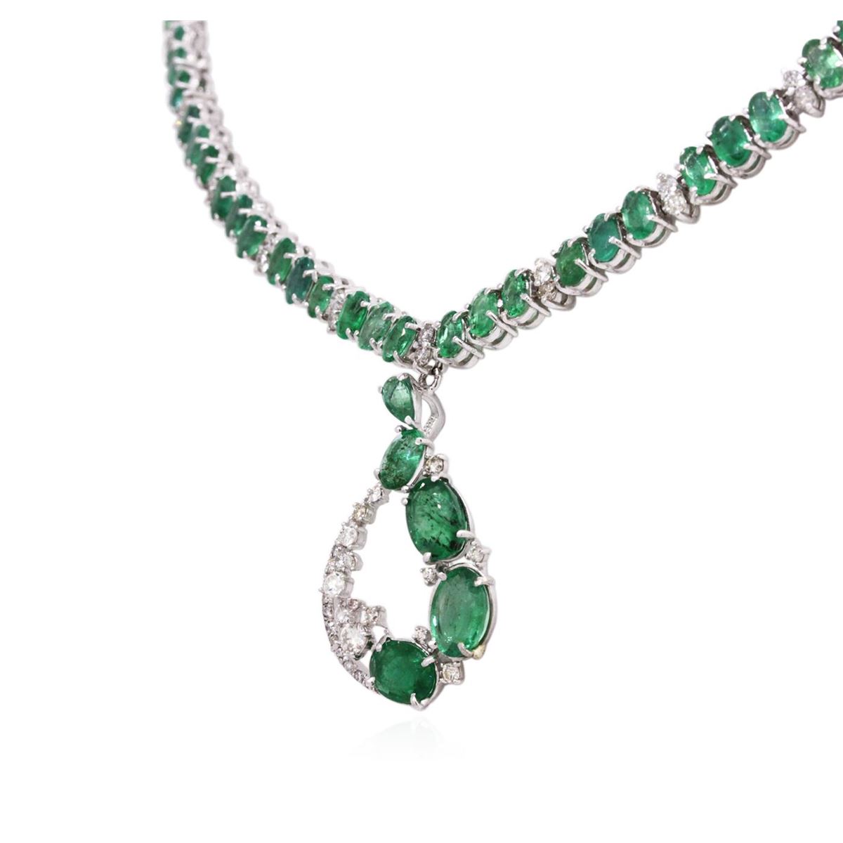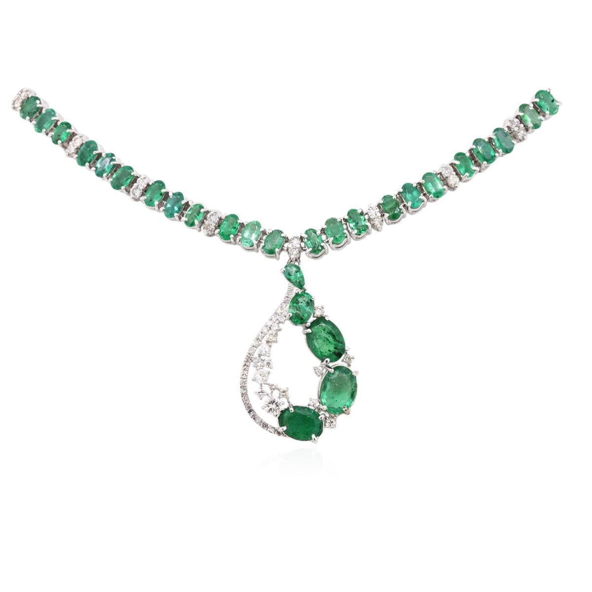 One electronically tested 14KT white gold ladies combination cast & assembled emerald and diamond necklace with a hidden box clasp with a bright polish finish. Measurements: 17" in length. Identified with markings of "14K". Condition is new. Containing: Three prong set oval modified brilliant cut natural emeralds, measuring 14.21 x 10.50 x 6.83mm, approximate total weight of 17.01ct., clarity is eye clean, type III, medium light, very slightly grayish, very slightly bluish green color, (GIA vslbG 4/3), cut is good. Ninety-two prong set oval modified brilliant cut natural emeralds, measuring 4.40 x 3.00 x 1.95mm, approximate total weight of 13.80ct., clarity is eye clean, type III, medium light, very slightly grayish, very slightly bluish green color, (GIA vslbG 4/3), cut is good. Ninety-Five prong set round brilliant cut diamonds, measuring 3.00 - 1.30 x 1.29mm (depth est.) approximate total weight of 95 Stones = 3.00ct. Clarity: SI-2 to I-2. Color: H - I, Cut is Good. Colored gemstones are presumed to have been subjected to commonly used enhancement processes. All diamonds and colored gemstones are graded in the mounting, unless otherwise stated. Total Weight of Colored Stones 30.81ct. Total Weight of Diamonds 3.00ct. Total Weight of Necklace 30.20 grams. GGL Appraised at $26,990.00.