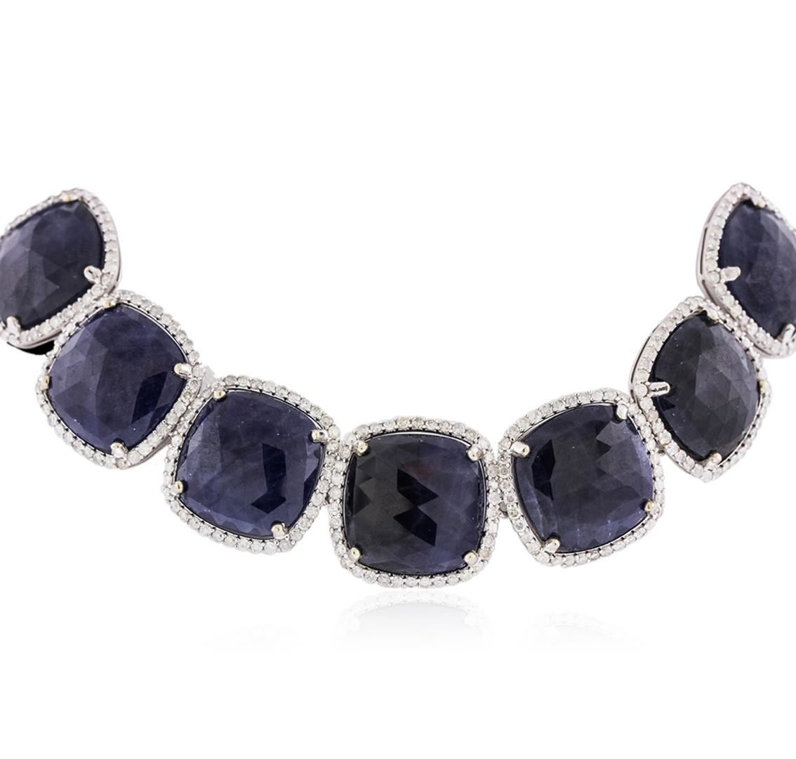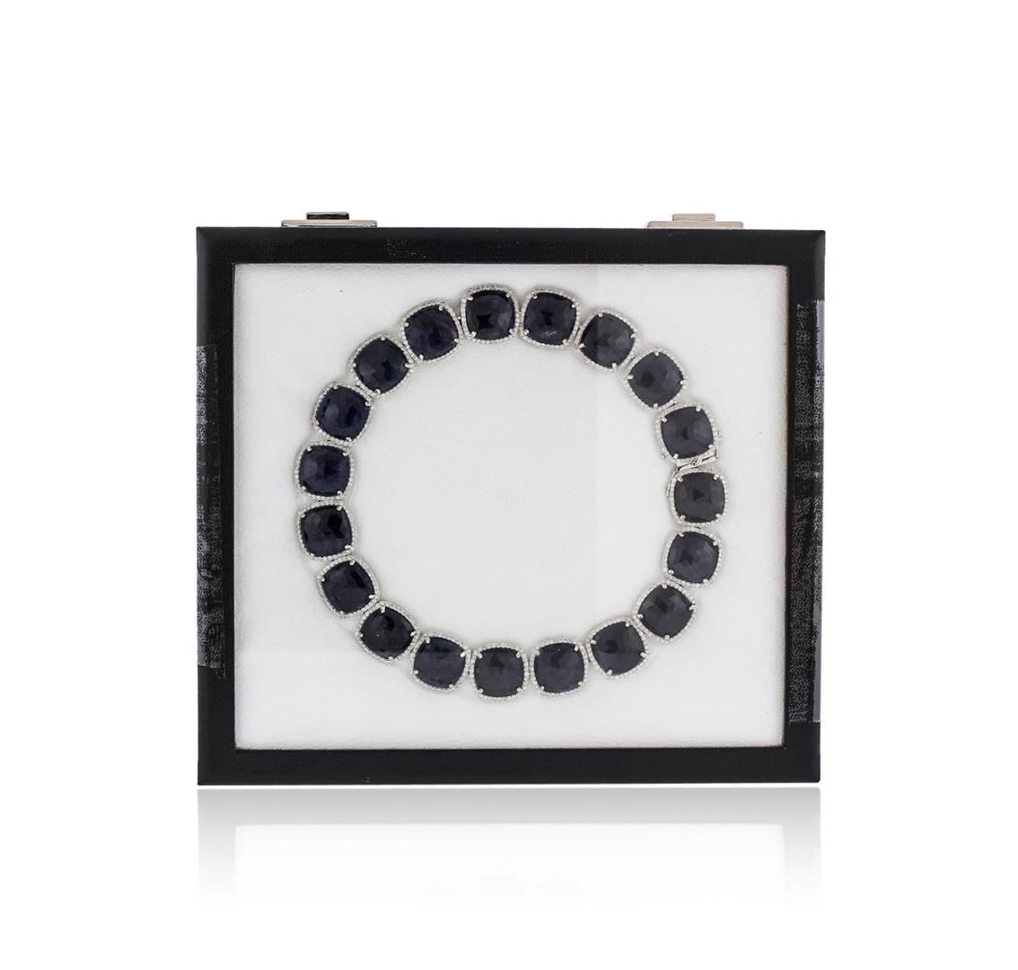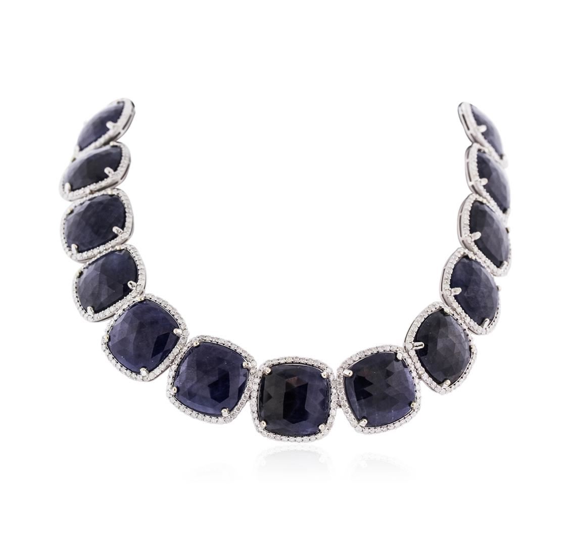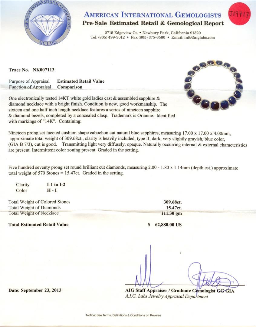 One electronically tested 14KT white gold ladies cast & assembled sapphire and diamond necklace with a bright finish. Condition is new, good workmanship. The sixteen and one half inch length necklace features a series of nineteen sapphire and diamond bezels, completed by a concealed clasp. Trademark is Orianne. Identified with markings of "14K". Containing: Nineteen prong set faceted cushion shape cabochon cut natural blue sapphires, measuring 17.00 x 17.00 x 4.00mm, approximate total weight of 309.68ct, clarity is heavily included, type II, dark, very slightly grayish, blue color, (GIA B 7/6), cut is good. Transmitting light very diffusely, opaque. Naturally occurring internal and external characteristics are present. Intermittent color zoning present. Graded in the setting. Five hundred seventy prong set round brilliant cut diamonds, measuring 2.00 - 1.80 x 1.14 (depth est.) approximate total weight of 570 stones = 15.47ct. Graded in the setting. Clarity I-1 to I-2. Color H-I. Total weight of necklace is 111.30 grams. AIG Appraised at $62,880.00.