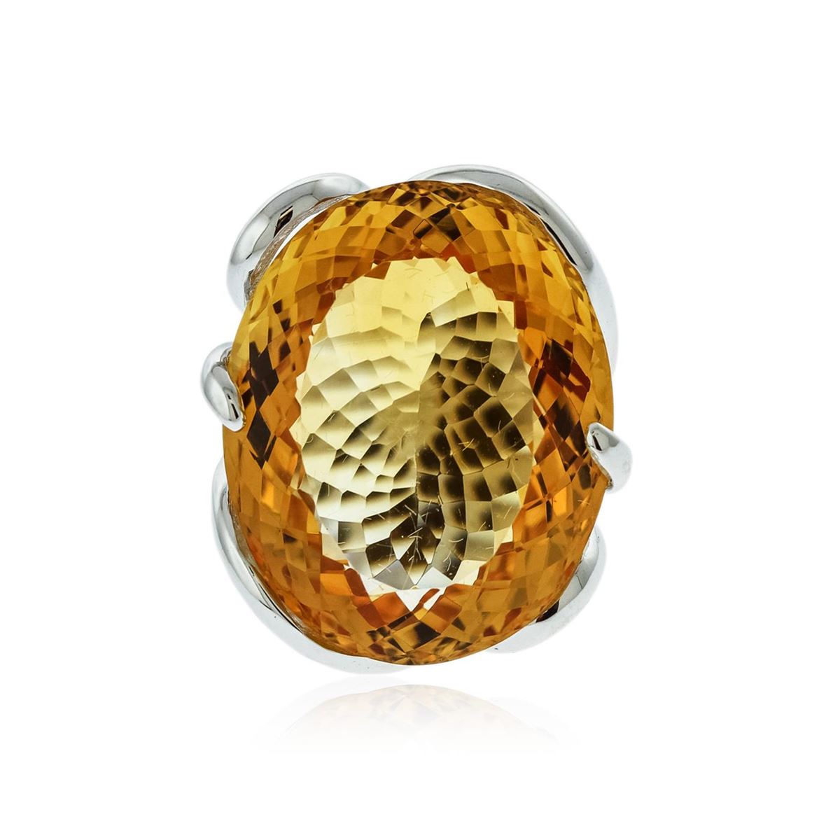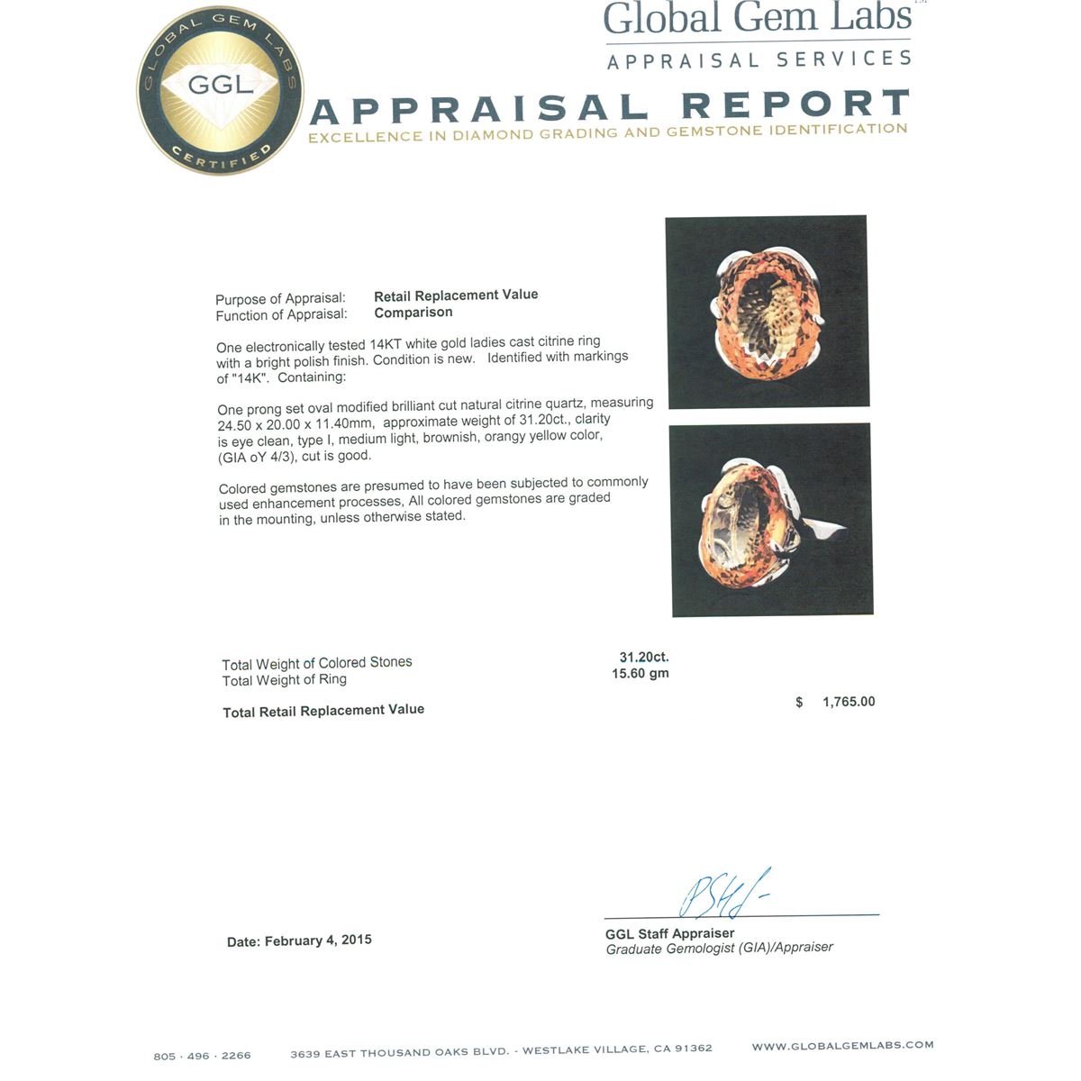 One electronically tested 14KT white gold ladies cast citrine ring with a bright polish finish. Identified with markings of "14K". Condition is new. Containing: One prong set oval modified brilliant cut natural citrine quartz, measuring 24.50 x 20.00 x 11.40mm, approximate weight of 31.20ct., clarity is eye clean, type I, medium light, brownish, orangy yellow color, (GIA oY 4/3), cut is good. Colored gemstones are presumed to have been subjected to commonly used enhancement processes, All colored gemstones are graded in the mounting, unless otherwise stated. Total Weight of Colored Stones 31.20ct. Total Weight of Ring 15.60 grams. GGL Appraised at $1,765.00.
