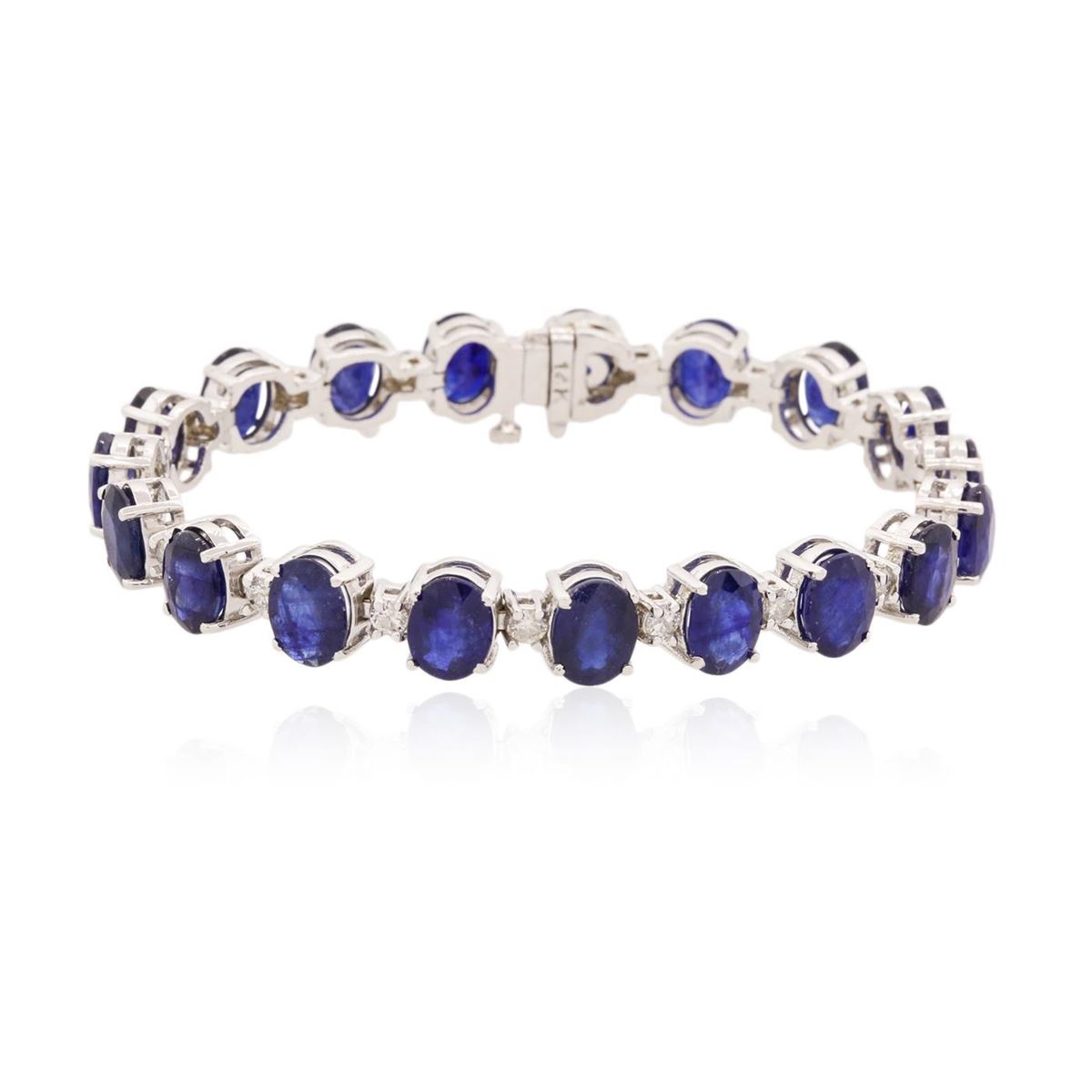One electronically tested 14KT white gold ladies cast & assembled dyed corundum and diamond bracelet. Seven inch length bracelet features a semi-flexible dyed corundum and diamond ribbon, terminating in a concealed clasp with safety bar. Bright polish finish. Identified with markings of "14K". Condition is new, good workmanship. Containing: Nineteen peg set oval mixed cut natural dyed corundums, measuring 8.00 x 6.00 x 4.00mm, approximate total weight of 31.32ct., clarity is heavily included, dark, moderately strong, blue color, (GIA B 7/4), cut is good. Transmitting light somewhat diffusely, transparent to translucent. Naturally occurring internal & external characteristics are present. Measurements & the color grade are an average for the group. Indications of multiple laboratory enhancements, including laboratory high temperature heat treatment, with glass & flux additives and dye. The presence of dye prevents determining whether or not these stones would have sufficient depth of color to be considered blue sapphire. Graded in the setting. Nineteen prong set round brilliant cut diamonds, measuring 2.60 - 2.50 x 1.53mm (depth est.) approximate total weight of 19 Stones = 1.24ct. Graded in the setting. Clarity: I-1 to I-2. Color: H - J. Total Weight of Colored Stones 31.32ct. Total Weight of Diamonds 1.24ct. Total Weight of Bracelet 22.90 grams. AIG Appraised at $5,650.00.