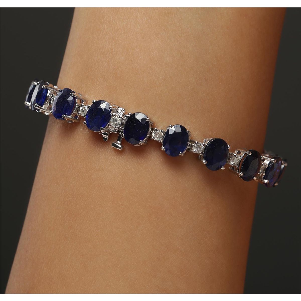 One electronically tested 14KT white gold ladies cast & assembled dyed corundum and diamond bracelet. Seven inch length bracelet features a semi-flexible dyed corundum and diamond ribbon, terminating in a concealed clasp with safety bar. Bright polish finish. Identified with markings of "14K". Condition is new, good workmanship. Containing: Nineteen peg set oval mixed cut natural dyed corundums, measuring 8.00 x 6.00 x 4.00mm, approximate total weight of 31.32ct., clarity is heavily included, dark, moderately strong, blue color, (GIA B 7/4), cut is good. Transmitting light somewhat diffusely, transparent to translucent. Naturally occurring internal & external characteristics are present. Measurements & the color grade are an average for the group. Indications of multiple laboratory enhancements, including laboratory high temperature heat treatment, with glass & flux additives and dye. The presence of dye prevents determining whether or not these stones would have sufficient depth of color to be considered blue sapphire. Graded in the setting. Nineteen prong set round brilliant cut diamonds, measuring 2.60 - 2.50 x 1.53mm (depth est.) approximate total weight of 19 Stones = 1.24ct. Graded in the setting. Clarity: I-1 to I-2. Color: H - J. Total Weight of Colored Stones 31.32ct. Total Weight of Diamonds 1.24ct. Total Weight of Bracelet 22.90 grams. AIG Appraised at $5,650.00.