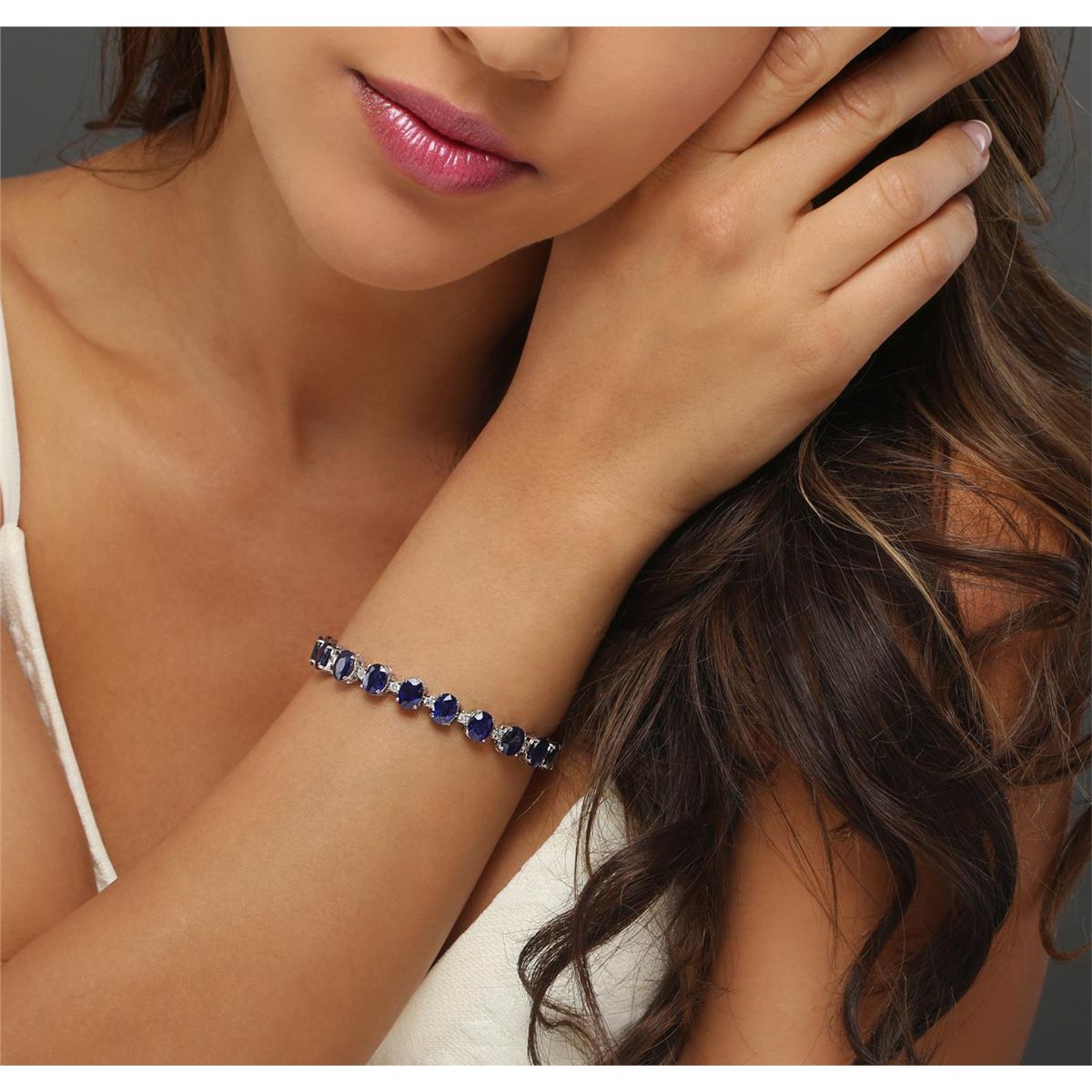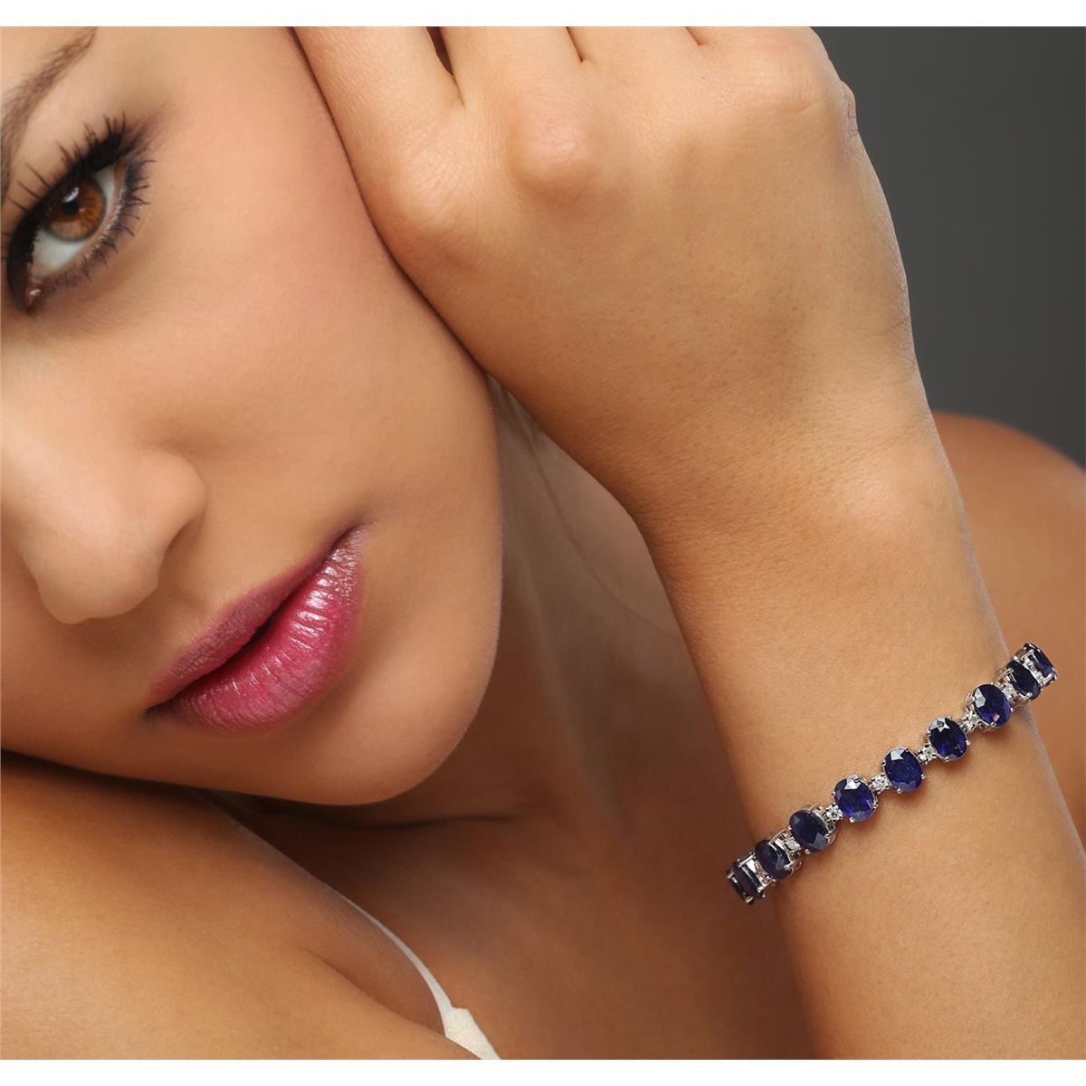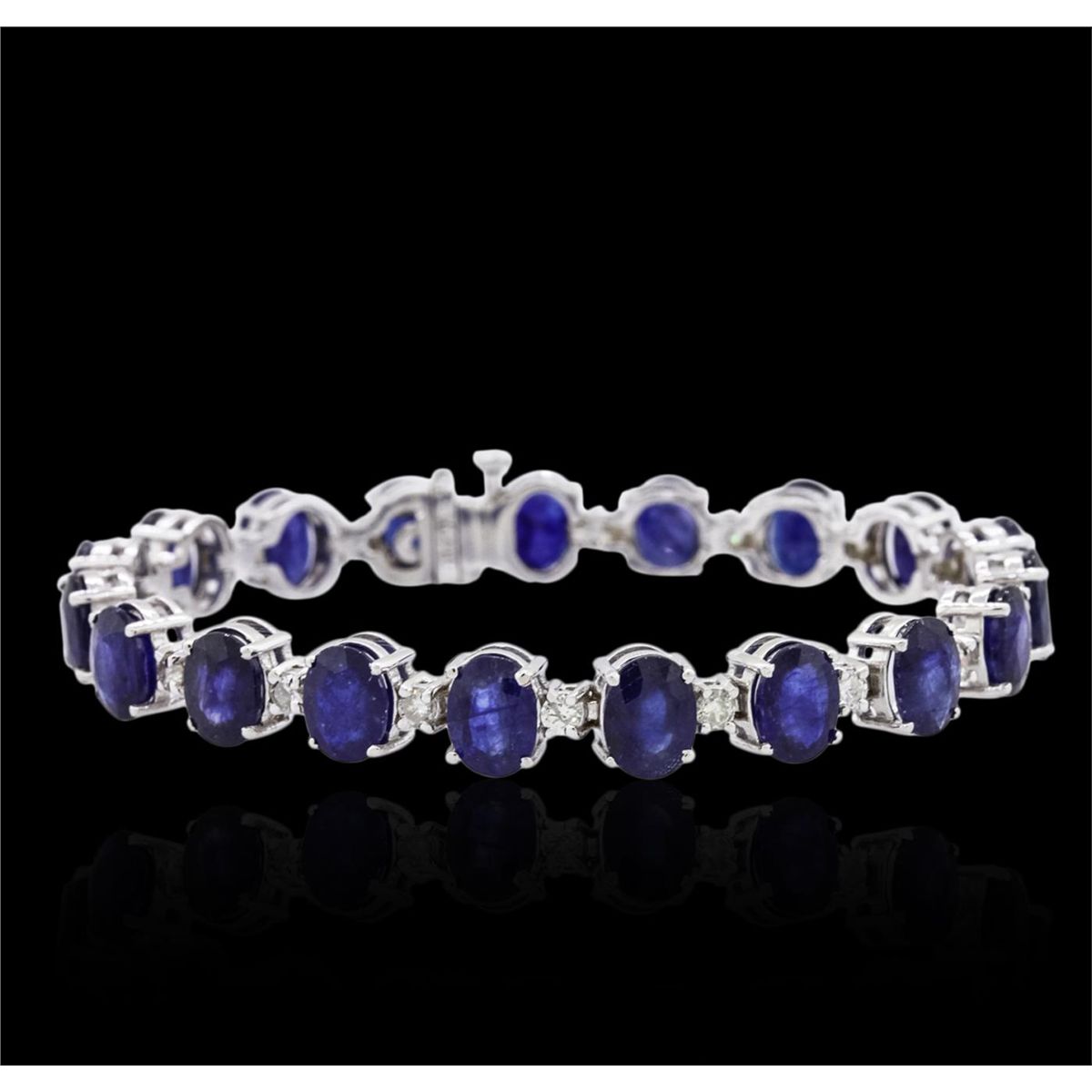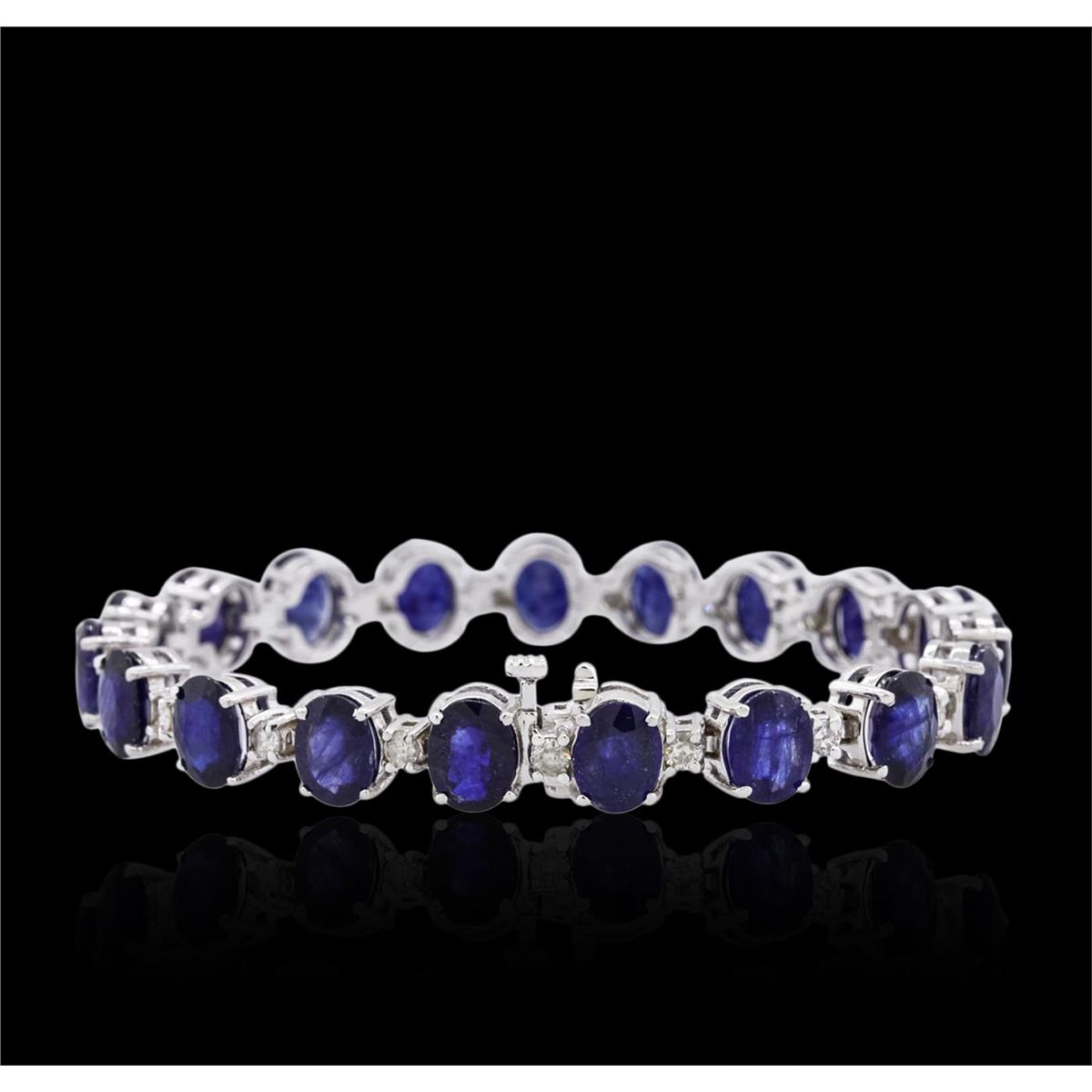One electronically tested 14KT white gold ladies cast & assembled dyed corundum and diamond bracelet. Seven inch length bracelet features a semi-flexible dyed corundum and diamond ribbon, terminating in a concealed clasp with safety bar. Bright polish finish. Identified with markings of "14K". Condition is new, good workmanship. Containing: Nineteen peg set oval mixed cut natural dyed corundums, measuring 8.00 x 6.00 x 4.00mm, approximate total weight of 31.32ct., clarity is heavily included, dark, moderately strong, blue color, (GIA B 7/4), cut is good. Transmitting light somewhat diffusely, transparent to translucent. Naturally occurring internal & external characteristics are present. Measurements & the color grade are an average for the group. Indications of multiple laboratory enhancements, including laboratory high temperature heat treatment, with glass & flux additives and dye. The presence of dye prevents determining whether or not these stones would have sufficient depth of color to be considered blue sapphire. Graded in the setting. Nineteen prong set round brilliant cut diamonds, measuring 2.60 - 2.50 x 1.53mm (depth est.) approximate total weight of 19 Stones = 1.24ct. Graded in the setting. Clarity: I-1 to I-2. Color: H - J. Total Weight of Colored Stones 31.32ct. Total Weight of Diamonds 1.24ct. Total Weight of Bracelet 22.90 grams. AIG Appraised at $5,650.00.